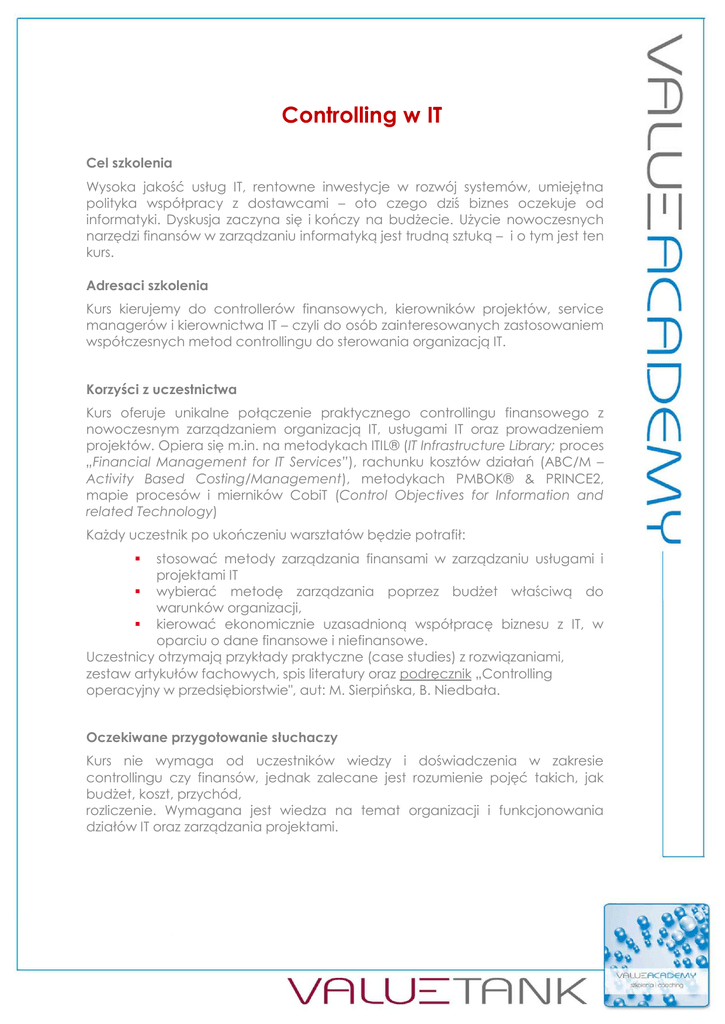 Controlling w IT Cel szkolenia Wysoka jakość usług IT, rentowne inwestycje w rozwój systemów, umiejętna polityka współpracy z dostawcami – oto czego dziś biznes oczekuje od informatyki. Dyskusja zaczyna się i kończy na budżecie. Użycie nowoczesnych narzędzi finansów w zarządzaniu informatyką jest trudną sztuką – i o tym jest ten kurs. Adresaci szkolenia Kurs kierujemy do controllerów finansowych, kierowników projektów, service managerów i kierownictwa IT – czyli do osób zainteresowanych zastosowaniem współczesnych metod controllingu do sterowania organizacją IT. Korzyści z uczestnictwa Kurs oferuje unikalne połączenie praktycznego controllingu finansowego z nowoczesnym zarządzaniem organizacją IT, usługami IT oraz prowadzeniem projektów. Opiera się m.in. na metodykach ITIL® (IT Infrastructure Library; proces „Financial Management for IT Services”), rachunku kosztów działań (ABC/M – Activity Based Costing/Management), metodykach PMBOK® & PRINCE2, mapie procesów i mierników CobiT (Control Objectives for Information and related Technology) Każdy uczestnik po ukończeniu warsztatów będzie potrafił: stosować metody zarządzania finansami w zarządzaniu usługami i projektami IT wybierać metodę zarządzania poprzez budżet właściwą do warunków organizacji, kierować ekonomicznie uzasadnioną współpracę biznesu z IT, w oparciu o dane finansowe i niefinansowe. Uczestnicy otrzymają przykłady praktyczne (case studies) z rozwiązaniami, zestaw artykułów fachowych, spis literatury oraz podręcznik „Controlling operacyjny w przedsiębiorstwie", aut: M. Sierpińska, B. Niedbała. Oczekiwane przygotowanie słuchaczy Kurs nie wymaga od uczestników wiedzy i doświadczenia w zakresie controllingu czy finansów, jednak zalecane jest rozumienie pojęć takich, jak budżet, koszt, przychód, rozliczenie. Wymagana jest wiedza na temat organizacji i funkcjonowania działów IT oraz zarządzania projektami. Metoda szkolenia Aby wiedza dała się szybko zastosować w praktyce, przyjmujemy zasadę: 30% czasu – wprowadzenia i podsumowania teoretyczne, 70% czasu – dyskusje i ćwiczenia w grupach wg przygotowanych case studies. Zakres szkolenia: Podstawy Controllingu 1. Wprowadzenie metodyczne Współczesne rozumienie controllingu w nowoczesnych organizacjach – kontekst budżetowania i Balanced Scorecard Controlling strategiczny i operacyjny a sprawozdawczość Obiekty controllingowe a centra odpowiedzialności Budżet i jego zastosowanie jako narzędzia zarządzania Wielostopniowy i wieloblokowy rachunek wyników Activity Based Management 2. Podstawy controllingu IT Typy kosztów: TCO, Ustawa o rachunkowości, inne Metodycznie do IT: ITIL/CObIT jako baza controllingu procesów IT Projekt IT w controllingu Activity Based Costing w IT Sprawozdawczość zarządcza – osadzenie IT w controllingu organizacji Podstawy planowania organizacji IT System Controllingu IT 3. Controlling procesów IT Koszty IT Przychody IT Make or buy? Kalkulacja dla usługi IT Polityka rezerw w procesach 4. Controlling projektów IT Business case projektu a produkty IT Kosztorys projektu Elementy sterowania złożonymi strukturami projektowymi Rezerwy projektu, portfela i programu Odstępstwa – instrukcja obsługi Budżetowanie capexowe i opexowe Controlling wobec biznesu 5. Rozliczalność IT Service Level Management Shared Services w IT Wskaźniki ekonomiczne i ich zastosowanie w IT Finansowanie IT „Obrona budżetu” - sztuka redukowania kosztów i wydatków Mierzalne cele projektu Rozliczanie kosztów i przychodów IT 6. Infrastruktura IT Procesy zakupowe dla IT Badania i rozwój Dostawcy – IT – biznes Długoterminowe sterowanie wynikiem IT jako backoffice i frontoffice Czas trwania – 2 dni, liczba uczestników 8-12 osób