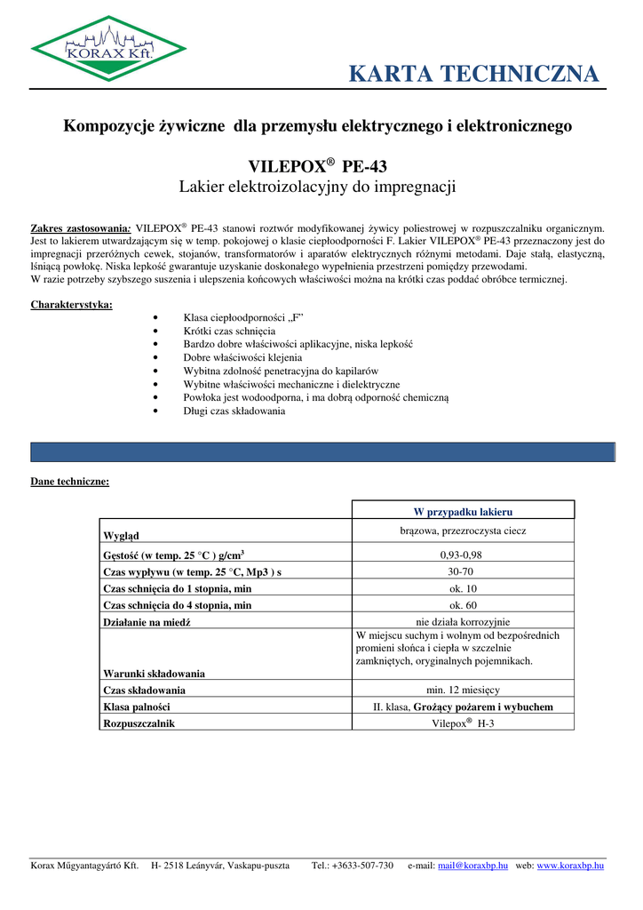 KARTA TECHNICZNA Kompozycje żywiczne dla przemysłu elektrycznego i elektronicznego VILEPOX® PE-43 Lakier elektroizolacyjny do impregnacji Zakres zastosowania: VILEPOX® PE-43 stanowi roztwór modyfikowanej żywicy poliestrowej w rozpuszczalniku organicznym. Jest to lakierem utwardzającym się w temp. pokojowej o klasie ciepłoodporności F. Lakier VILEPOX® PE-43 przeznaczony jest do impregnacji przeróżnych cewek, stojanów, transformatorów i aparatów elektrycznych różnymi metodami. Daje stałą, elastyczną, lśniącą powłokę. Niska lepkość gwarantuje uzyskanie doskonałego wypełnienia przestrzeni pomiędzy przewodami. W razie potrzeby szybszego suszenia i ulepszenia końcowych właściwości można na krótki czas poddać obróbce termicznej. Charakterystyka: • • • • • • • • Klasa ciepłoodporności „F” Krótki czas schnięcia Bardzo dobre właściwości aplikacyjne, niska lepkość Dobre właściwości klejenia Wybitna zdolność penetracyjna do kapilarów Wybitne właściwości mechaniczne i dielektryczne Powłoka jest wodoodporna, i ma dobrą odporność chemiczną Długi czas składowania Dane techniczne: W przypadku lakieru brązowa, przezroczysta ciecz Wygląd Gęstość (w temp. 25 °C ) g/cm3 0,93-0,98 Czas wypływu (w temp. 25 °C, Mp3 ) s 30-70 Czas schnięcia do 1 stopnia, min ok. 10 Czas schnięcia do 4 stopnia, min ok. 60 Działanie na miedź nie działa korrozyjnie W miejscu suchym i wolnym od bezpośrednich promieni słońca i ciepła w szczelnie zamkniętych, oryginalnych pojemnikach. Warunki składowania Czas składowania min. 12 miesięcy Klasa palności II. klasa, Grożący pożarem i wybuchem Rozpuszczalnik Vilepox® H-3 Korax Műgyantagyártó Kft. H- 2518 Leányvár, Vaskapu-puszta Tel.: +3633-507-730 e-mail: [email protected] web: www.koraxbp.hu KARTA TECHNICZNA Po utwardzeniu Natężenie poła przy przebyciu (ASMD 115) kV/mm Natężenie poła przy przebyciu (ASMD 115 po zanurzeniu do wody na 24 godz.) kV/mm Odporność na chemikalie Woda kwas siarkowy o stę. 10 % roztwór zasadowy o stę. 1% woda słona nafta 72 30 wybitna wybitna wybitna wybitna dobra Zgodność z lakieramy przewodów VILEPOX® PE-43 jest zgodny z lakieramy przewodów na bazie: Epoksyd Izolacja tekstylna Poliuretan Poliuretan-poliamid Polivinil formal Polivinil formal-poliamid Poliamid Poliamid-imid Poliester Poliester-amid-imid Poliimid . Przepisy BHP Na miejscu pracy: Podczas pracy należy nosić okulary i rękawice ochronne oraz zamknięte ubranie. Ochrona skóry: Przed rozpoczęciem pracy oraz po umyciu rąk należy stosować krem ochronny. Oczyszczenie zabrudzonej skóry: Wylaną ciecz należy zetrzeć papierem lub watą, następnie zmyć dużą ilością ciepłej wody z mydłem niealkalicznym oraz wysuszyć ręcznikiem jednorazowym. Wycieknięcia: Należy absorbować trocinami lub watą i wyrzucić do śmietnika z plastiku. Wentylacja: Powietrze pomieszczenia pracy należy wietrzyć cały czas oraz pracownicy muszą unikać wdychania par. Pierwsza pomoc: - W przypadku kontaktu żywicy ze skórą, miejsce należy natychmiast zmyć wodą z mydłem i opatrzyć kremem ochronnym. - W przypadku zanieczyszczenia oczu, należy je wypłukać strumieniem wody przez conajmniej 10-15 minut, a następnie jak najszybciej skontaktować się z lekarzem. - Zabrudzone ubrania muszą być natychmiast zmienione. - W przypadku, gdy po wdychaniu par pracownik zasłabnie należy go wyprowadzić na świeże powietrze i skontaktować się z lekarzem. - Przy wykonaniu należy dotrzymać przepisy przeciwpożarowe dotyczące materiałów klasy palności II. Szczegółowe dane dotyczące BHP są zawarte w Karcie Bezpieczeństwa komponentów. Podstawowe instrukcje zastosowania: Lakier elektroizolacyjny VILEPOX® PE-43 stosuje przy produkcji: • stojanów silników • różnych cewek • transformatorów • układów scalonych • kondensatorów Lakier VILEPOX® PE-43 można nanosić metodą zanurzeniową, natryskową oraz za pomocą pędzla. Szybko schnie w temperaturze pokojowej, ale aby ulepszyć odporność na chemikalie i na naftę można dodatkowo utwardzać w piecu. Zalecone warunki dodatkowego utwardzenia: 150 °C/10-15 min. Korax Műgyantagyártó Kft. H- 2518 Leányvár, Vaskapu-puszta Tel.: +3633-507-730 e-mail: [email protected] web: www.koraxbp.hu KARTA TECHNICZNA Proponowany proces utwardzenia w przypadku impregnacji na taśmie: • suszenie elementu w temp. 110 °C na 10 min. • zanurzenie do lakieru na 15 sec. • kroplenie lakieru na 45 min. • utwardzenie w temp. 150 °C na 10-15 min lub w temp. 165 °C przez 5 minut. W tym przypadku poleca się rozcięczyć lakier dodając ok. 10 % rozpuszczalniku VILEPOX® H-3 Powyższe informacje zostały opracowane na podstawie najlepszej naszej wiedzy technicznej, jednak nie stanowi przedmiotu obowiązań prawnych. VILEPOX® PE-43 PL 3. Korax Műgyantagyártó Kft. H- 2518 Leányvár, Vaskapu-puszta Tel.: +3633-507-730 e-mail: [email protected] web: www.koraxbp.hu