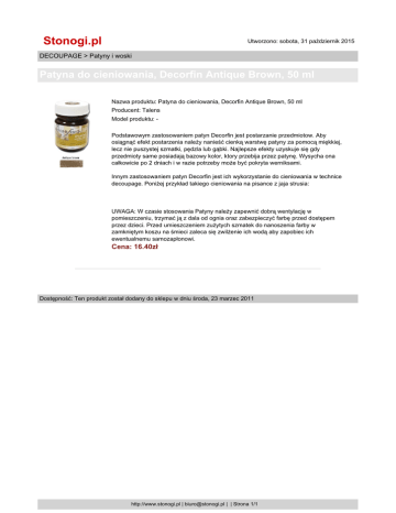 Stonogi.pl Utworzono: sobota, 31 październik 2015 DECOUPAGE > Patyny i woski Patyna do cieniowania, Decorfin Antique Brown, 50 ml Nazwa produktu: Patyna do cieniowania, Decorfin Antique Brown, 50 ml Producent: Talens Model produktu: Podstawowym zastosowaniem patyn Decorfin jest postarzanie przedmiotow. Aby osiągnąć efekt postarzenia należy nanieść cienką warstwę patyny za pomocą miękkiej, lecz nie puszystej szmatki, pędzla lub gąbki. Najlepsze efekty uzyskuje się gdy przedmioty same posiadają bazowy kolor, ktory przebija przez patynę. Wysycha ona całkowicie po 2 dniach i w razie potrzeby może być pokryta werniksami. Innym zastosowaniem patyn Decorfin jest ich wykorzystanie do cieniowania w technice decoupage. Poniżej przykład takiego cieniowania na pisance z jaja strusia: UWAGA: W czasie stosowania Patyny należy zapewnić dobrą wentylację w pomieszczeniu, trzymać ją z dala od ognia oraz zabezpieczyć farbę przed dostępem przez dzieci. Przed umieszczeniem zużytych szmatek do nanoszenia farby w zamkniętym koszu na śmieci zaleca się zwilżenie ich wodą aby zapobiec ich ewentualnemu samozapłonowi. Cena: 16.40zł Dostępność: Ten produkt został dodany do sklepu w dniu środa, 23 marzec 2011 http://www.stonogi.pl | [email protected] | | Strona 1/1