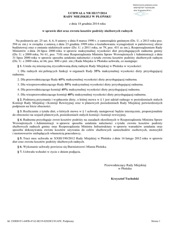 Elektronicznie podpisany przez: KRZYSZTOF TUCHOLSKI dnia 18 grudnia 2014 r. UCHWAŁA NR III/17/2014 RADY MIEJSKIEJ W PŁOŃSKU z dnia 18 grudnia 2014 roku w sprawie diet oraz zwrotu kosztów podróży służbowych radnych Na podstawie art. 25 ust. 4, 6, 8 ustawy z dnia 8 marca 1990 r. o samorządzie gminnym (Dz. U. z 2013 roku poz. 594 ze zm.) w związku z ustawą z dnia 23 grudnia 1999 roku o kształtowaniu wynagrodzeń w państwowej sferze budżetowej oraz o zmianie niektórych ustaw (Dz. U. z 2011 roku, nr 79, poz. 431 ze zm.), Rozporządzeniem Rady Ministrów z dnia 26 lipca 2000 roku w sprawie maksymalnej wysokości diet przysługujących radnemu gminy (Dz. U. z 2000 roku, Nr 61, poz. 710) oraz Rozporządzenia Ministra Spraw Wewnętrznych i Administracji z dnia 31 lipca 2000 roku w sprawie sposobu ustalenia należności z tytułu zwrotu kosztów podróży służbowych radnym (Dz. U. z 2000 roku, nr 66, poz. 800 z póź. zm.) Rada Miejska w Płońsku uchwala, co następuje: § 1. Ustala się miesięczną zryczałtowaną dietę radnym Rady Miejskiej w Płońsku w wysokości: 1. Dla radnych nie pełniących funkcji w organach Rady 35% maksymalnej wysokości diety przysługującej radnemu. 2. Dla przewodniczącego Rady 65% maksymalnej wysokości diety przysługującej radnemu. 3. Dla wiceprzewodniczącego Rady 55% maksymalnej wysokości diety przysługującej radnemu. 4. Dla przewodniczącego komisji 45% maksymalnej wysokości diety przysługującej radnemu. 5. Dla wiceprzewodniczącego komisji 40% maksymalnej wysokości diety przysługującej radnemu. § 2. Podstawą przyznania i wypłacenia diety, o której mowa w § 1 jest udział radnego w posiedzeniach stałych Komisji Rady Miejskiej i Komisji Rewizyjnej oraz w planowych posiedzeniach Rady Miejskiej potwierdzonych podpisem na liście obecności. § 3. Rozliczenie z tytułu diet, o których mowa w § 1 uchwały następować będzie miesięcznie, proporcjonalnie do obecności na sesjach planowych, posiedzeniach stałych komisji i komisji rewizyjnej. § 4. Radnemu przysługuje zwrot kosztów podróży na zasadach określonych w Rozporządzeniu Ministra Spraw Wewnętrznych i Administracji w sprawie sposobu ustalenia należności z tytułu zwrotu kosztów podróży służbowych radnych gminy oraz Rozporządzenia Ministra Infrastruktury w sprawie warunków ustalania oraz sposobu dokonywania zwrotu kosztów używania do celów służbowych samochodów osobowych, motocykli i motorowerów niebędących własnością pracodawcy. § 5. Traci moc uchwała nr XXIII/190/2012 Rady Miejskiej w Płońsku z dnia 16 lutego 2012 roku w sprawie diet oraz zwrotu kosztów podróży służbowych radnych. § 6. Wykonanie uchwały powierza się Burmistrzowi Miasta Płońska. § 7. Uchwała wchodzi w życie z dniem podjęcia. Przewodniczący Rady Miejskiej w Płońsku Krzysztof Tucholski Id: 23DD81F1-64FB-47A2-B219-82820CC01AFE. Podpisany Strona 1 Uzasadnienie do Uchwały Nr III/17/2014 Rady Miejskiej w Płońsku z dnia 18 grudnia 2014 roku w sprawie diet oraz zwrotu kosztów podróży służbowych radnych Rada Miejska w Płońsku, w oparciu o: 1) Rozporządzenie Ministra Infrastruktury w sprawie warunków ustalania oraz sposobu dokonywania zwrotu kosztów używania do celów służbowych samochodów osobowych, motocykli i motorowerów niebędących własnością pracodawcy, 2) Rozporządzenie Ministra Spraw Wewnętrznych i Administracji w sprawie sposobu ustalenia należności z tytułu zwrotu kosztów podróży służbowych radnych gminy, ustala zasady, według których radnym przysługują diety oraz zwrot kosztów podróży służbowych. Przewodniczący Rady Miejskiej w Płońsku Krzysztof Tucholski Id: 23DD81F1-64FB-47A2-B219-82820CC01AFE. Podpisany Strona 2