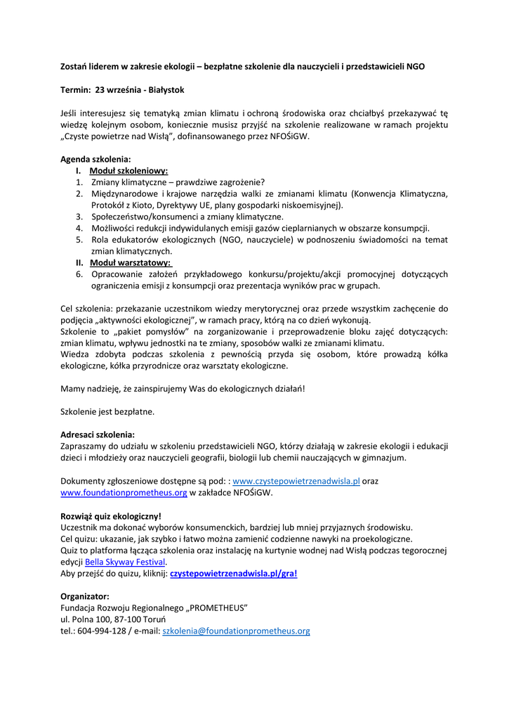 Zostań liderem w zakresie ekologii – bezpłatne szkolenie dla nauczycieli i przedstawicieli NGO Termin: 23 września - Białystok Jeśli interesujesz się tematyką zmian klimatu i ochroną środowiska oraz chciałbyś przekazywać tę wiedzę kolejnym osobom, koniecznie musisz przyjść na szkolenie realizowane w ramach projektu „Czyste powietrze nad Wisłą”, dofinansowanego przez NFOŚiGW. Agenda szkolenia: I. Moduł szkoleniowy: 1. Zmiany klimatyczne – prawdziwe zagrożenie? 2. Międzynarodowe i krajowe narzędzia walki ze zmianami klimatu (Konwencja Klimatyczna, Protokół z Kioto, Dyrektywy UE, plany gospodarki niskoemisyjnej). 3. Społeczeństwo/konsumenci a zmiany klimatyczne. 4. Możliwości redukcji indywidulanych emisji gazów cieplarnianych w obszarze konsumpcji. 5. Rola edukatorów ekologicznych (NGO, nauczyciele) w podnoszeniu świadomości na temat zmian klimatycznych. II. Moduł warsztatowy: 6. Opracowanie założeń przykładowego konkursu/projektu/akcji promocyjnej dotyczących ograniczenia emisji z konsumpcji oraz prezentacja wyników prac w grupach. Cel szkolenia: przekazanie uczestnikom wiedzy merytorycznej oraz przede wszystkim zachęcenie do podjęcia „aktywności ekologicznej”, w ramach pracy, którą na co dzień wykonują. Szkolenie to „pakiet pomysłów” na zorganizowanie i przeprowadzenie bloku zajęć dotyczących: zmian klimatu, wpływu jednostki na te zmiany, sposobów walki ze zmianami klimatu. Wiedza zdobyta podczas szkolenia z pewnością przyda się osobom, które prowadzą kółka ekologiczne, kółka przyrodnicze oraz warsztaty ekologiczne. Mamy nadzieję, że zainspirujemy Was do ekologicznych działań! Szkolenie jest bezpłatne. Adresaci szkolenia: Zapraszamy do udziału w szkoleniu przedstawicieli NGO, którzy działają w zakresie ekologii i edukacji dzieci i młodzieży oraz nauczycieli geografii, biologii lub chemii nauczających w gimnazjum. Dokumenty zgłoszeniowe dostępne są pod: : www.czystepowietrzenadwisla.pl oraz www.foundationprometheus.org w zakładce NFOŚiGW. Rozwiąż quiz ekologiczny! Uczestnik ma dokonać wyborów konsumenckich, bardziej lub mniej przyjaznych środowisku. Cel quizu: ukazanie, jak szybko i łatwo można zamienić codzienne nawyki na proekologiczne. Quiz to platforma łącząca szkolenia oraz instalację na kurtynie wodnej nad Wisłą podczas tegorocznej edycji Bella Skyway Festival. Aby przejść do quizu, kliknij: czystepowietrzenadwisla.pl/gra! Organizator: Fundacja Rozwoju Regionalnego „PROMETHEUS” ul. Polna 100, 87-100 Toruń tel.: 604-994-128 / e-mail: [email protected]