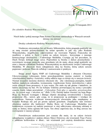 Rzym, 18 listopada 2013 Do członków Rodziny Wincentyńskiej Niech łaska i pokój naszego Pana Jezusa Chrystusa zamieszkają w Waszych sercach dzisiaj i na zawsze! Drodzy członkowie Rodziny Wincentyńskiej, Niedawno otrzymałem list od Siostry Miłosierdzia, która pragnęła podzielić się ze mną swoimi przemyśleniami na temat sposobu w jaki my, jako Rodzina Wincentyńska, moglibyśmy odpowiedzieć na wezwanie Papieża Franciszka do modlitwy o pokój w Syrii i pokój na całym świecie... korzystając z naszego historycznego dziedzictwa - Cudownego Medalika. Czytając jej list poczułem, że Duch Święty dotknął mego serca. Poprosiłem tę Siostrę o dalsze przemyślenia i rozwinięcie swojego pomysłu oraz przesłanie ich do mnie, abym mógł podzielić się nimi z innymi członkami Rodziny Wincentyńskiej na okoliczność święta Cudownego Medalika. W obecnym liście odnajdziecie ideę tej Siostry, którą całym sercem popieram i polecam Wam do refleksji i zastosowania w praktyce. Stojąc przed figurą NMP od Cudownego Medalika i obrazem Chrystusa Ukrzyżowanego (obrazami, które prawdopodobnie można znaleźć w każdej wincentyńskiej kaplicy i kościele), widzę odbicie tego co dzieje się w naszym świecie. Niemal wszędzie możemy dostrzec obecność zła: siła i dominacja pieniądza, handel ludźmi, nadużycia seksualne, wymuszenia, współczesne formy niewolnictwa i jakże wiele różnych form przemocy, w tym wojen. Zło stało się tak głośne i hałaśliwe, że ludzie zaczynają się bać. Po raz kolejny widzimy powtarzającą się scenę z początku czasów, kiedy Adam powiedział: „Usłyszałem Twój głos w ogrodzie, przestraszyłem się, bo jestem nagi, i ukryłem się” (Rdz 3,10). Dzisiaj ludzie również się boją Boga. Boją się Bożych wymagań i dlatego chętnie akceptują uwodzicielskie i kuszące propozycje Zła... nawet, gdy czują, że te propozycje są podstępne i wiodące do zniewolenia. Narracja wydarzeń towarzyszących stworzeniu jaką znajdujemy w Księdze Rodzaju nie jest po prostu opisem grzechem. Znajdujemy tam również obietnicę nadziei dla ludzkości! Matka Boża od Cudownego Medalika jest konkretnym wyrazem tej nadziei ponieważ w niej odkrywamy niewiastę odzianą w szatę ze słońca, która zgniata łeb węża. Ten obraz zapewnia nas, że Bóg zawsze ma rozwiązanie w naszej sytuacji. Prawdziwym zaskoczeniem jest czasem dla mnie, że na całym świecie odnajdujemy wyjątkowe i piękne obrazy Maryi Dziewicy, ale wizerunek Virgo Potens z jabłkiem królewskim w dłoni... ten wizerunek jest częścią dziedzictwa naszej Rodziny Wincentyńskiej. Wizerunek Virgo Potens miażdżącej głowę pełzającego po ziemi węża to potężny symbol. Kiedy stajemy naprzeciw zła we wszystkich jego potężnych i sprytny formach nie walczymy wyłącznie siłami ludzkimi. Otrzymujemy także "skromną" pomoc Bożą i zostajemy zachęceni do zaufania Bożej pomocy. Czuję, że to jest pilna potrzeba i modlę się o to, abyśmy się otworzyli na Boże błogosławieństwo, które jest nam wszystkim oferowane. Podczas objawienia się św. Katarzynie 27 listopada 1830 r. przy Rue du Bac w Paryżu, Matka Boska przedstawiła swoja role w planie zbawienia. W pierwszym obrazie, Matka Boża stoi na kuli ziemskiej. Pod jej stopami wąż o zielonej skórze z żółtymi plamami. A w jej dłoni złote jabłko z małym krzyżem. Święta Katarzyna zauważyła zieloną barwę węża z żółtymi plamami, a wąż ten pełzał po całej ziemi. Te kolory zapewniają wężowi dobry kamuflaż a przez to rozpoznanie obecności złą w naszym życiu staje się trudniejsze. W swojej książce o Maryi i jej medaliku, ks. J. Eyler CM wskazuje, że kiedy analizujemy treść uznanych przez Kościół objawień Maryi Panny, nie powinniśmy jedynie skupiać się na wypowiadanych słowach. Słowom towarzyszyły ruchy i symboliczne gesty, które ujawniają naukę, która powinna być prawdziwym centrum naszej uwagi. W rozmowie z Siostrą Dufés Katarzyna tak opisuje swoje widzenie: "Matka Boża miała jabłko królewskie w swoich dłoniach. Nie widziałam takie obrazu nigdy wcześniej! " Siostra Dufés tak rozumiała to znaczenie: "To dotyczy Matki, Królowej Wszechświata. Matka Boża chroni świat i przynosi go Bogu w darze." W drugim obrazie Matka Boża pojawia się z pierścieniami z drogocennych kamieni, a jej ręce skierowane są ku Ziemi a klejnoty emitują promienie światła obejmujące Ziemię. "Piękno i blask promieni są błogosławieństwem, którym obdarzani są ci, którzy o takie błogosławieństwo proszą. Klejnoty, które nie emitują światła, są błogosławieństwa, o które ludzie zapomnieli poprosić." Katarzyna dodała: "Dała mi do zrozumienia, że dostąpimy radości, gdy poprosimy o jej wstawiennictwo. Maryja jest łaskawa wobec tych, którzy proszą o jej błogosławieństwa i raduje się mogąc nas błogosławić." Wokół Matki Bożej utworzył się obraz w kształcie owalu. Na szczycie tego obrazu, złotymi literami, znalazły się słowa: "O Maryjo, bez grzechu poczęta, módl się za nami, którzy się do Ciebie uciekamy!" Następnie Katarzyna usłyszała głos mówiący: "wybijcie medal zrobiony według tego wzoru. Ci, którzy będą go nosić z ufnością otrzymają obfite błogosławieństwa." Dar Medalika to wspaniały gest ufności. To wielki dar od Boga. To również wezwanie do współpracy, które szanuje godność i wolność osoby ludzkiej. Bóg posłał Niepokalaną Pannę niosącą w ramionach niezliczone błogosławieństwa tak, abyśmy, którzy zwodzeni jesteśmy przez Zło, mogli zobaczyć drogę zbawienia rozświetlaną przed naszym wzrokiem. Maryja pomaga nam odkryć przebiegłość Zła. I dostała misję zmiażdżenia głowy węża. Kobiety i mężczyźni, własnymi staraniami nie mogą się sami uwolnić. Jednakże chociaż Bóg szanuje naszą wolność to Bóg także wymaga naszej współpracy. Słowa wpisane na Medaliku