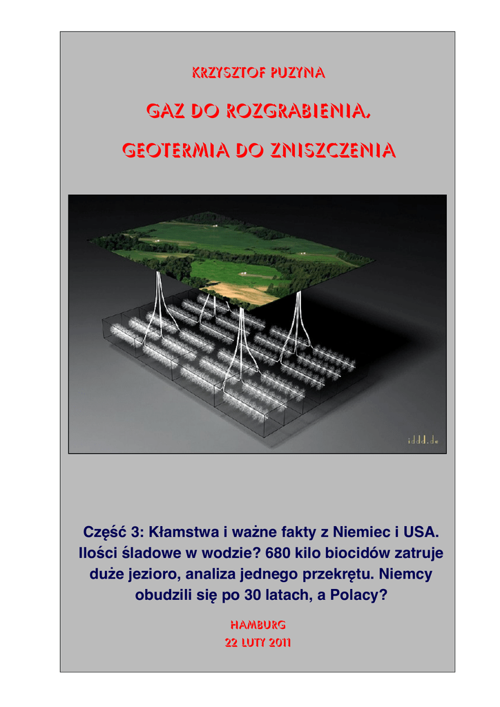 Krzysztof Puzyna Gaz do rozgrabienia, geotermia do zniszczenia Część 3: Kłamstwa i ważne fakty z Niemiec i USA. Ilości śladowe w wodzie? 680 kilo biocidów zatruje duże jezioro, analiza jednego przekrętu. Niemcy obudzili się po 30 latach, a Polacy? Hamburg 22 luty 2011 Krzysztof Puzyna, - Gaz do rozgrabienia, geotermia do zniszczenia - 05.03.2011, Str 2/22 Część 3: Kłamstwa i ważne fakty z Niemiec i USA. Ilości śladowe w wodzie? 680 kilo biocidów zatruje duże jezioro, analiza jednego przekrętu. Niemcy obudzili się po 30 latach, a Polacy? Kłamstwa i ważne fakty z Niemiec i USA 16. 01. 2011 Taktykę mataczenia dopasowaną do biurokracji niemieckiej stosuje ExxonMobil Niemcy w Dolnej Saksonii (Niedersachsen) i wszędzie tam gdzie następuje zatrucie środowiska poprzez szczelinowanie hydrauliczne. W Niemczech jest nie do pomyślenia, że przy odwiertach i budowach nie ma tablic informacyjnych - pierwszy przechodzący policjant zareaguje i zgłosi do organów ścigających roboty na czarno - to jest sprawa milionowych kar. To fakt: Według dziennikarzy, którzy po sygnałach od mieszkańców odkryli poważną katastrofę ekologiczną ExxonMobil z roku 2007-(patrz 16 ), podane na tablicy informacyjnej dane inspektora do spraw bezpieczeństwa były nieprawdziwe, a także fałszywe było nazwisko i telefon kierownika budowy. Ale tablica informacyjna była i zgadzała się nazwa firmy. To fakt: 6.12.2010 Public & Government Affairs Manager, czyli rzecznik prasowy korporacji ExxonMobil Production Deutschland GmbH Norbet Stahlhut w wywiadzie telewizyjnym NDR-Markt, kłamał: Bezpieczeństwo jest u nas dobrem Krzysztof Puzyna, - Gaz do rozgrabienia, geotermia do zniszczenia - 05.03.2011, Str 3/22 Część 3: Kłamstwa i ważne fakty z Niemiec i USA. Ilości śladowe w wodzie? 680 kilo biocidów zatruje duże jezioro, analiza jednego przekrętu. Niemcy obudzili się po 30 latach, a Polacy? najwyższym. My wydobywamy tutaj gaz ziemny bezpiecznie i bezawaryjnie od 50 lat. To fakt: parę dni po tym wywiadzie mieszkańcy Rottenburg/Wümme zaprosili ekipę telewizji, i pokazali zanieczyszczenie wód gruntowych oraz 2500 m3 ziemi z roku 2007, przez zastosowane w mieszaninach wodnych związki rtęci, benzolu, ethylbenzolu i xylolu. Płuczki wypłynęły z pękniętych rur na polu odwiertów Söhlingen na wschód od Rottenburg/Wümme. Według rzecznika firmy Exxon, 30 procent płuczek jest odpompowywane z odwiertu systemem rur. Na długości 2 kilometrów rury te popękały. Według firmy - bo były skorodowane. Według naukowców - zawalenie się wyczerpanych odwiertów w pobliżu spowodowało małe trzęsienie ziemi i popękanie rur. To fakt: w landzie NRW (Nordrhein-Westfalen) Ministerstwo Środowiska (MŚ) wymaga od 2011 roku od firm wiercących za gazem pozwoleń od urzędów zarządzających wodą pitną. Rząd okręgu Arnsberg wydający licencje na odwierty uwarunkował licencję na odwierty próbne dla ExxonMobil w styczniu 2011 od pozwoleń urzędów wodnych - lokalnych i okręgowych. Podobnie w Drensteinfurt w NRW. MŚ oświadczyło 13 stycznia, że bez pozwolenia od urzędu wody pitnej i pozwolenia od nadzoru wody pitnej, licencja na odwierty próbne staje się nieważna. Dalsze ważne fakty To fakt: nie ujawniono w reportarzu (7), dokąd prowadzą rurociągi puszczone płytko w ziemi lub położone na ziemi na terenach firmy Exxon. Krzysztof Puzyna, - Gaz do rozgrabienia, geotermia do zniszczenia - 05.03.2011, Str 4/22 Część 3: Kłamstwa i ważne fakty z Niemiec i USA. Ilości śladowe w wodzie? 680 kilo biocidów zatruje duże jezioro, analiza jednego przekrętu. Niemcy obudzili się po 30 latach, a Polacy? To fakt: stężenie biocidów w wodzie technologicznej przekracza 272 razy wartości dopuszczalne według ekspertów komisji EFSA (European Food Safety Authority, Parma, Italy) - (17) patrz 680 kilo biocidów zatruje duże jezioro. To fakt: zanieczyszczenia wód gruntowych i studni głębinowych rtęcią i benzolem w Hemsbünde (Gmina Rotenburg) przez firmę RWE-Dea. To fakt: 70 procent płuczek pozostaje w wyczerpanych odwiertach. To fakt: dozwolone w Niemczech wartości progowe benzolu (a benzol powoduje raka - fakt bezsporny w świecie nauki) zostały w wodzie gruntowej 6-krotnie przekroczone. To fakt: od trzech lat Exxon filtruje wodę gruntową i wywozi zatrutą ziemię dokąd?. Robót utylizacyjnych do dzisiaj jeszcze nie zakończył. To fakt: by woda została zakwalifikowana jako "czysta woda pitna" robi się analizy chemiczne wody, w których szuka się znanych składników jak ołów, czy bakterie natomiast nie bada się płuczyn na wypłukany ze skał arsen, radon, na znane i nieznane składniki płuczek, jak rtęć, biocydy itd., gdyż firmy nie meldują tajnych składników płuczek. To fakt: ExxonMobil na pytanie: jak ocenia ExxonMobil wiadomości, że w USA poprzez wydobycie gazu ze złóż niekonwencjonalnych doszło do masywnych zanieczyszczeń wody gruntowej i wody pitnej? ExxonMobil odpowiada na własnej stronie (28): "Według naszych informacji odpowiedzialne urzędy w USA nie zidentyfikowały ani jednego przypadku zanieczyszczenia wody pitnej przez Hydraulic Fracturing." To następne bezczelne kłamstwo tak typowe dla ludzi zaślepionych pieniędzmi, zorganizowanych w hierarchicznych mafijnych strukturach co nie mogą inaczej, gdyż wylecą natychmiast z pracy. Orzeczeń takich specjalistów nie można brać na poważnie. Oczywiście, że szkody są dokumentowane urzędowo i przez ludność na filmach, na fotografiach i w pracach naukowych. Tutaj podaję aktualną pracę z września 2010 roku z bardzo dobrymi źródłami: "FRACTURED COMMUNITIES, Case Studies of the Environmental Impacts of Industrial Gas Drilling" (27) Cytuję: "This report describes hundreds of case studies demonstrating that industrial gas drilling, including horizontal drilling using high-volume hydraulic fracturing, results in significant adverse environmental impacts. These 