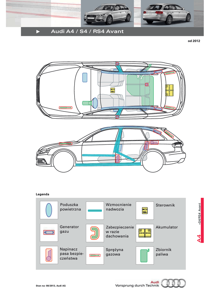 • Audi A4 / S4 / RS4 Avant od 2012 Wzmocnienie nadwozia Sterownik Generator gazu Zabezpieczenie w razie dachowania Akumulator Napinacz pasa bezpieczeństwa Sprężyna gazowa Zbiornik paliwa Stan na: 08/2013, Audi AG A4 Poduszka powietrzna +S4/RS4 Avant Legenda