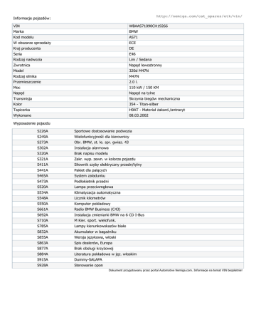 http://nemiga.com/cat_spares/etk/vin/ Informacje pojazdów: VIN WBAAS71090CH19266 Marka BMW Kod modelu AS71 W obszarze sprzedaży ECE Kraj producenta DE Seria E46 Rodzaj nadwozia Lim / Sedana Zwrotnica Napęd lewostronny Model 320d M47N Rodzaj silnika M47N Przemieszczenie 2.0 l. Moc 110 kW / 150 KM Napęd Napęd na tylne Transmisja Skrzynia biegów mechaniczna Kolor 354 - Titan-silber Tapicerka H9AT - Materiał żakard./antracyt Wykonane 08.03.2002 Wyposażenie pojazdu S226A Sportowe dostosowanie podwozia S249A Wielofunkcyjność dla kierownicy S273A Obr. BMW, st. le. spr. gwiaz. 43 S302A Instalacja alarmowa S320A Brak napisu modelu S321A Zakr. wyp. zewn. w kolorze pojazdu S411A Siłownik szyby elektryczny przedn/tylny S441A Pakiet dla palących S465A System załadunku S473A Podłokietnik przedni S520A Lampa przeciwmgłowa S534A Klimatyzacja automatyczna S548A Licznik kilometrów S550A Komputer pokładowy S661A Radio BMW Business (C43) S692A Instalacja zmieniarki BMW na 6 CD I-Bus S710A M Kier. sport. wielofunk. S785A Lampy kierunkowskazów białe S832A Akumulator w bagażniku S855A Wersja językowa, włoski S863A Spis dealerów, Europa S877A Brak obsługi krzyżowej S884A Literatura pokładowa w jęz. włoskim S915A Dummy-SALAPA S928A Sterowanie opon Dokument przygotowany przez portal Automotive Nemiga.com. Informacje na temat VIN bezpłatnie!