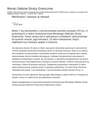 Morski Oddział Straży Granicznej Źródło: http://www.morski.strazgraniczna.pl/mor/aktualnosci/16717,Marihuana-i-haszysz-w-renault.html Wygenerowano: Wtorek, 7 marca 2017, 00:49 Marihuana i haszysz w renault Autor: z 23.03.2016 Blisko 7 kg narkotyków o czarnorynkowej wartości przeszło 270 tys. zł przechwycili w Gdyni funkcjonariusze Morskiego Oddziału Straży Granicznej. Towar ukryty był w specjalnych schowkach zatrzymanego do kontroli renault. Jego kierowca, 51-letni mieszkaniec Gdyni, najbliższe trzy miesiące spędzi w areszcie. Do zdarzenia doszło 19 marca w Gdyni, gdy patrol strażników granicznych zatrzymał do kontroli drogowej samochód prowadzony przez 51-letniego kierowcę. Obecny na miejscu pies służbowy do wyszukiwania narkotyków wyraźnie zaznaczył tył pojazdu jako miejsce ewentualnego ukrycia środków odurzających, dlatego funkcjonariusze zdecydowali o dokładnym przeszukaniu renault. Jak się okazało, w specjalnie przygotowanych skrytkach konstrukcyjnych pod bagażnikiem schowano 22 paczki foliowe, w których było ponad 6 kg marihuany i blisko 50 gramów haszyszu. Dodatkowo przeszukano mieszkanie 51-latka, gdzie funkcjonariusze znaleźli ponad 13 gramów amfetaminy. W sumie Straż Graniczna zabezpieczyła prawie 7 kg narkotyków o czarnorynkowej wartości ponad 270 tys. zł. Zatrzymany 51-letni gdynianin decyzją Sądu Rejonowego w Gdyni trafił na 3 miesiące do aresztu. Grozi mu nawet do 10 lat pozbawienia wolności. Dalsze postępowanie w tej sprawie prowadzą funkcjonariusze Morskiego Oddziału Straży Granicznej pod nadzorem Prokuratury Rejonowej w Gdyni. Fot. MOSG Fot. MOSG Fot. MOSG Fot. MOSG