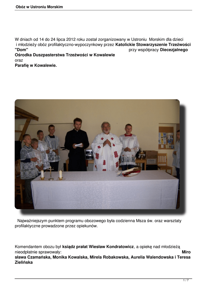 Obóz w Ustroniu Morskim W dniach od 14 do 24 lipca 2012 roku został zorganizowany w Ustroniu Morskim dla dzieci i młodzieży obóz profilaktyczno-wypoczynkowy przez Katolickie Stowarzyszenie Trzeźwości "Dom" przy współpracy Diecezjalnego Ośrodka Duszpasterstwa Trzeźwości w Kowalewie oraz Parafię w Kowalewie. Najważniejszym punktem programu obozowego była codzienna Msza św. oraz warsztaty profilaktyczne prowadzone przez opiekunów. Komendantem obozu był ksiądz prałat Wiesław Kondratowicz, a opiekę nad młodzieżą nieodpłatnie sprawowały: Miro sława Czamańska, Monika Kowalska, Mirela Robakowska, Aurelia Walendowska i Teresa Zielińska 1/7 Obóz w Ustroniu Morskim . Młodzieży towarzyszył także ksiądz kleryk Mariusz Przyjazny . Mimo swojej nieobecności na obozie, bardzo duży wkład w jego organizację miały nauczycielki: Małgorzata Baron-Galewska oraz Ewa Leśniewsk a. Poznajecie tego kapitana statku? Gwoździem obozu był rejs statkiem po morzu oraz wyprawa melexami na ruchome wydmy do Łeby. 2/7 Obóz w Ustroniu Morskim Płynęliśmy "Piratem" 3/7 Obóz w Ustroniu Morskim Jest świetnie Na wydmach Cóż warta byłaby wyprawa obozowa bez poznawania historii swojego kraju? 4/7 Obóz w Ustroniu Morskim W Muzeumnazw Orężamiejscowości Polskiego Nasze (zbieżność przypadkowa) oczy cieszyły również ogrody tematyczne w Dobrzycy Na kładce 5/7 Obóz w Ustroniu Morskim Podziwiamy grzybienie białe W ogrodzie francuskim 6/7 Obóz w Ustroniu Morskim Zwiedziliśmy również ruiny kościoła w Trzęsaczu Na koniec wspólna fotografia Młodsi urządzenia, Na obozie uczestnicy nie a także obyło obozu się bez mieli rozgrywek możliwość na Anny batucie. zabawy nana (piłka placu, nożna, gdzie siatkówka) była karuzela, oraz konik dyskotek. i inne i Dla nas pobudka była... przyjemnością, gdyż budził nas Pan Darek Dryjański śpiewem, kierownicy, który wjeżdżając w tak nie wąskie tylko wielki bramy kunszt autobusem. muzyczny, ale również okazał - się akordeonem mistrzem Pań: Serdeczne podziękowania dla sponsorów indywidualnych oraz dla firmy GASPOL wlampionów, osobach Małgorzaty Walendowskiej, Pawłowskiej, Agnieszki Jędrzejczak oraz Mariusza Klimka Pana karaoke którzy zapewnili i inne, awykazywał także nam takie dla atrakcje, jak:sportowych wyprawę wydmy do Łeby, puszczanie Miasta iposkakania Gminy Pleszew który dofinansował obóz. Zapraszamy do galerii zdjęć ,Burmistrza 7/7
