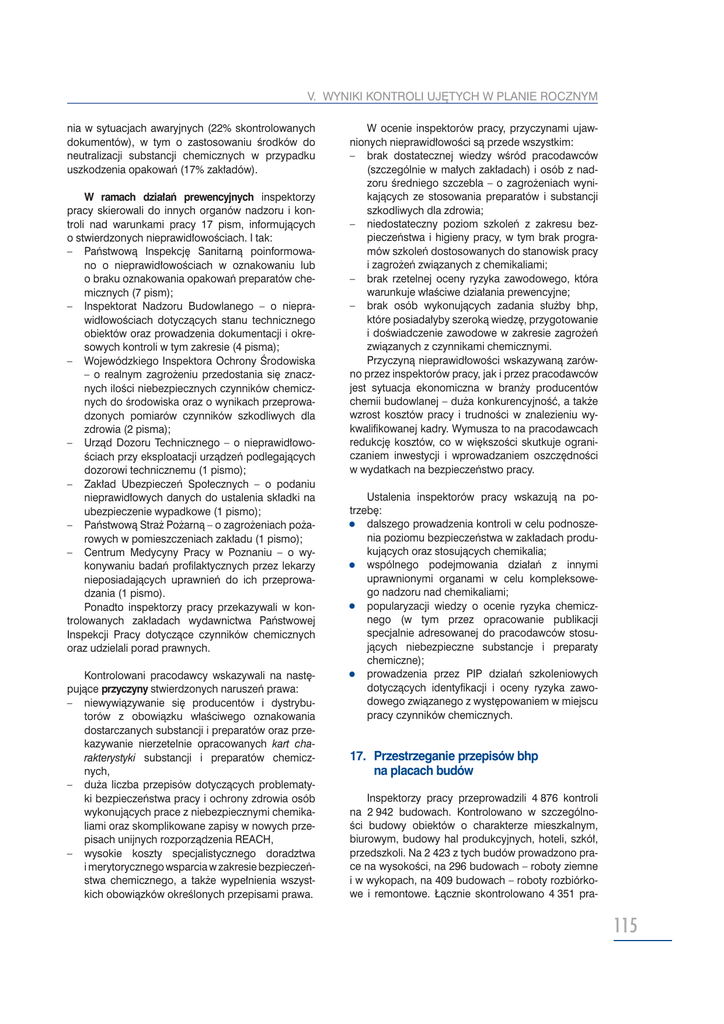 V. WYNIKI KONTROLI UJĘTYCH W PLANIE ROCZNYM nia w sytuacjach awaryjnych (22% skontrolowanych dokumentów), w tym o zastosowaniu środków do neutralizacji substancji chemicznych w przypadku uszkodzenia opakowań (17% zakładów). W ramach działań prewencyjnych inspektorzy pracy skierowali do innych organów nadzoru i kontroli nad warunkami pracy 17 pism, informujących o stwierdzonych nieprawidłowościach. I tak: – Państwową Inspekcję Sanitarną poinformowano o nieprawidłowościach w oznakowaniu lub o braku oznakowania opakowań preparatów chemicznych (7 pism); – Inspektorat Nadzoru Budowlanego – o nieprawidłowościach dotyczących stanu technicznego obiektów oraz prowadzenia dokumentacji i okresowych kontroli w tym zakresie (4 pisma); – Wojewódzkiego Inspektora Ochrony Środowiska – o realnym zagrożeniu przedostania się znacznych ilości niebezpiecznych czynników chemicznych do środowiska oraz o wynikach przeprowadzonych pomiarów czynników szkodliwych dla zdrowia (2 pisma); – Urząd Dozoru Technicznego – o nieprawidłowościach przy eksploatacji urządzeń podlegających dozorowi technicznemu (1 pismo); – Zakład Ubezpieczeń Społecznych – o podaniu nieprawidłowych danych do ustalenia składki na ubezpieczenie wypadkowe (1 pismo); – Państwową Straż Pożarną – o zagrożeniach pożarowych w pomieszczeniach zakładu (1 pismo); – Centrum Medycyny Pracy w Poznaniu – o wykonywaniu badań profilaktycznych przez lekarzy nieposiadających uprawnień do ich przeprowadzania (1 pismo). Ponadto inspektorzy pracy przekazywali w kontrolowanych zakładach wydawnictwa Państwowej Inspekcji Pracy dotyczące czynników chemicznych oraz udzielali porad prawnych. Kontrolowani pracodawcy wskazywali na następujące przyczyny stwierdzonych naruszeń prawa: – niewywiązywanie się producentów i dystrybutorów z obowiązku właściwego oznakowania dostarczanych substancji i preparatów oraz przekazywanie nierzetelnie opracowanych kart charakterystyki substancji i preparatów chemicznych, – duża liczba przepisów dotyczących problematyki bezpieczeństwa pracy i ochrony zdrowia osób wykonujących prace z niebezpiecznymi chemikaliami oraz skomplikowane zapisy w nowych przepisach unijnych rozporządzenia REACH, – wysokie koszty specjalistycznego doradztwa i merytorycznego wsparcia w zakresie bezpieczeństwa chemicznego, a także wypełnienia wszystkich obowiązków określonych przepisami prawa. W ocenie inspektorów pracy, przyczynami ujawnionych nieprawidłowości są przede wszystkim: – brak dostatecznej wiedzy wśród pracodawców (szczególnie w małych zakładach) i osób z nadzoru średniego szczebla – o zagrożeniach wynikających ze stosowania preparatów i substancji szkodliwych dla zdrowia; – niedostateczny poziom szkoleń z zakresu bezpieczeństwa i higieny pracy, w tym brak programów szkoleń dostosowanych do stanowisk pracy i zagrożeń związanych z chemikaliami; – brak rzetelnej oceny ryzyka zawodowego, która warunkuje właściwe działania prewencyjne; – brak osób wykonujących zadania służby bhp, które posiadałyby szeroką wiedzę, przygotowanie i doświadczenie zawodowe w zakresie zagrożeń związanych z czynnikami chemicznymi. Przyczyną nieprawidłowości wskazywaną zarówno przez inspektorów pracy, jak i przez pracodawców jest sytuacja ekonomiczna w branży producentów chemii budowlanej – duża konkurencyjność, a także wzrost kosztów pracy i trudności w znalezieniu wykwalifikowanej kadry. Wymusza to na pracodawcach redukcję kosztów, co w większości skutkuje ograniczaniem inwestycji i wprowadzaniem oszczędności w wydatkach na bezpieczeństwo pracy. Ustalenia inspektorów pracy wskazują na potrzebę: dalszego prowadzenia kontroli w celu podnoszenia poziomu bezpieczeństwa w zakładach produkujących oraz stosujących chemikalia; wspólnego podejmowania działań z innymi uprawnionymi organami w celu kompleksowego nadzoru nad chemikaliami; popularyzacji wiedzy o ocenie ryzyka chemicznego (w tym przez opracowanie publikacji specjalnie adresowanej do pracodawców stosujących niebezpieczne substancje i preparaty chemiczne); prowadzenia przez PIP działań szkoleniowych dotyczących identyfikacji i oceny ryzyka zawodowego związanego z występowaniem w miejscu pracy czynników chemicznych. 17. Przestrzeganie przepisów bhp na placach budów Inspektorzy pracy przeprowadzili 4 876 kontroli na 2 942 budowach. Kontrolowano w szczególności budowy obiektów o charakterze mieszkalnym, biurowym, budowy hal produkcyjnych, hoteli, szkół, przedszkoli. Na 2 423 z tych budów prowadzono prace na wysokości, na 296 budowach – roboty ziemne i w wykopach, na 409 budowach – roboty rozbiórkowe i remontowe. Łącznie skontrolowano 4 351 pra- 115 SPRAWOZDANIE GIP Z DZIAŁALNOŚCI PIP W 2008 r. codawców, zatrudniających ponad 58,8 tys. pracowników, w tym 4 484 kobiety i 731 młodocianych. Spośród objętych kontrolą firm budowlanych zdecydowaną większość (tj. ponad 2/3) stanowiły podmioty zatrudniające do 9 osób. Tylko 6% zatrudniało powyżej 49 pracujących. Bardzo wiele nieprawidłowości dotyczyło wykonywania prac na rusztowaniach. Na ponad połowie budów stwierdzono brak odbioru 1 285 rusztowań (spośród 2 577 objętych kontrolą). Z reguły oznaczało to wykonywanie pracy na nieprawidłowo zmontowanych, niekompletnych rusztowaniach. Nagminny był też brak lub nieprawidłowe poręcze ochronne przy rusztowaniach, a także nieprawidłowe wypełnienie pomostów roboczych oraz brak pionów komunikacyjnych. Mimo że prace na wysokości należą do najbardziej niebezpiecznych, to oprócz niewłaściwych rusztowań, ujawniono także wiele innych nieprawidłowości stwarzających bezpośrednie zagrożenie dla zdrowia i życia. Wśród nich należy wymienić w szczególności: brak środków ochrony zbiorowej zabezpieczających przed upadkiem z wysokości – balustrad (63% budów), niezabezpieczenie doj