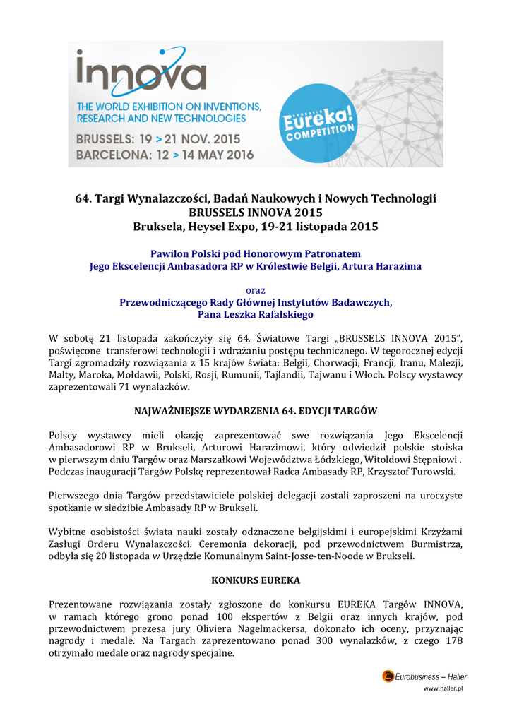64. Targi Wynalazczości, Badań Naukowych i Nowych Technologii BRUSSELS INNOVA 2015 Bruksela, Heysel Expo, 19-21 listopada 2015 Pawilon Polski pod Honorowym Patronatem Jego Ekscelencji Ambasadora RP w Królestwie Belgii, Artura Harazima oraz Przewodniczącego Rady Głównej Instytutów Badawczych, Pana Leszka Rafalskiego W sobotę 21 listopada zakończyły się 64. Światowe Targi „BRUSSELS INNOVA 2015”, poświęcone transferowi technologii i wdrażaniu postępu technicznego. W tegorocznej edycji Targi zgromadziły rozwiązania z 15 krajów świata: Belgii, Chorwacji, Francji, Iranu, Malezji, Malty, Maroka, Mołdawii, Polski, Rosji, Rumunii, Tajlandii, Tajwanu i Włoch. Polscy wystawcy zaprezentowali 71 wynalazków. NAJWAŻNIEJSZE WYDARZENIA 64. EDYCJI TARGÓW Polscy wystawcy mieli okazję zaprezentować swe rozwiązania Jego Ekscelencji Ambasadorowi RP w Brukseli, Arturowi Harazimowi, który odwiedził polskie stoiska w pierwszym dniu Targów oraz Marszałkowi Województwa Łódzkiego, Witoldowi Stępniowi . Podczas inauguracji Targów Polskę reprezentował Radca Ambasady RP, Krzysztof Turowski. Pierwszego dnia Targów przedstawiciele polskiej delegacji zostali zaproszeni na uroczyste spotkanie w siedzibie Ambasady RP w Brukseli. Wybitne osobistości świata nauki zostały odznaczone belgijskimi i europejskimi Krzyżami Zasługi Orderu Wynalazczości. Ceremonia dekoracji, pod przewodnictwem Burmistrza, odbyła się 20 listopada w Urzędzie Komunalnym Saint-Josse-ten-Noode w Brukseli. KONKURS EUREKA Prezentowane rozwiązania zostały zgłoszone do konkursu EUREKA Targów INNOVA, w ramach którego grono ponad 100 ekspertów z Belgii oraz innych krajów, pod przewodnictwem prezesa jury Oliviera Nagelmackersa, dokonało ich oceny, przyznając nagrody i medale. Na Targach zaprezentowano ponad 300 wynalazków, z czego 178 otrzymało medale oraz nagrody specjalne. www.haller.pl WYSTAWCY Z POLSKI ZAPREZENTOWALI 71 WYNALAZKÓW. Polacy prezentują swe osiągnięcia na Targach w Brukseli od 25 lat. Wystawcami tegorocznej edycji były instytuty badawcze, wyższe uczelnie, przedsiębiorstwa innowacyjne oraz młodzież szkół średnich i wyższych. Rozwiązania obejmowały zagadnienia z różnych dziedzin, m.in. ekologii, medycyny, bezpieczeństwa, lotnictwa, przemysłu samochodowego i transportu, metalurgii, włókiennictwa, maszyn i urządzeń, chemii, mechaniki, inżynierii, elektroniki, rolnictwa i żywności, energetyki, informatyki. Na Targach były również stoiska promocyjne Wydziału Promocji Handlu i Inwestycji Ambasady RP w Brukseli, Polskiej Agencji Rozwoju Przedsiębiorczości, Polski Wschodniej oraz Województwa Łódzkiego. Polskie stoiska zaprezentowały projekty już zaawansowane, po próbach, badaniach, wdrożeniach pilotażowych, jak również te gotowe do przemysłowych wdrożeń czy też do szerokiej komercjalizacji. Celem udziału w Targach jest promocja prezentowanych nowatorskich rozwiązań i nawiązanie kontaktów naukowo-biznesowych. Jest to inicjatywa prorynkowa. NAGRODY I WYRÓŻNIENIA DLA POLSKICH WYSTAWCÓW W ramach konkursu jury przyznaje medale – brązowe, srebrne i złote. Najwyżej ocenione rozwiązania otrzymują złote medale ze specjalnym wyróżnieniem jury oraz nagrody specjalne ufundowane przez belgijskie i międzynarodowe instytucje rządowe. Wyróżnienia te zostały wręczone na gali ogłoszenia wyników BRUSSELS INNOVA. Delegacje uczestniczące w Targach przyznawały nagrody, jako wyraz swojego uznania dla najciekawszych wynalazków prezentowanych na Targach. Polacy otrzymali 65 medali oraz inne nagrody i wyróżnienia, m.in.: • 8 nagród międzynarodowych i belgijskich instytucji rządowych • 8 nagród stowarzyszeń i delegacji zagranicznych • 15 medali złotych ze specjalnym wyróżnieniem jury • 30 medali złotych • 19 medali srebrnych • 1 medal brązowy Wśród powyższych wyróżnień było 6 medali w kategorii „Młody wynalazca”. W załączeniu przedstawiamy wykaz polskich wynalazków nagrodzonych na Targach wraz z przyznana oceną oraz ich krótkim opisem. Jak podkreślił przewodniczący jury oraz eksperci oceniający polskie wynalazki, ich wysoka ocena jest efektem bardzo wysokiego poziomu owych rozwiązań, zaawansowania w procesie badawczo-wdrożeniowym oraz zapotrzebowania na ich aplikacje. Jest ona również wynikiem profesjonalnej prezentacji wynalazków w postaci funkcjonujących prototypów, filmów i prezentacji multimedialnych, obrazujących ich działanie i potwierdzających efekty zastosowania, oraz bogatej dokumentacji merytorycznej przygotowanej dla jurorów oceniających rozwiązania. www.haller.pl Od 1994 roku udział w Targach polskich wynalazków jednostek sfery nauki jest dofinansowywany przez Ministerstwo Nauki i Szkolnictwa Wyższego. Organizacja uczestnictwa polskich przedsiębiorstw i promocja polskich wynalazków prezentowanych na Targach odbywa się we współpracy z Wydziałem Promocji Handlu i Inwestycji Ambasady RP w Belgii. Organizację udziału polskich wystawców zapewniła firma Eurobusiness-Haller z Katowic, oficjalny przedstawiciel Targów BRUSSELS INNOVA (kontakt: [email protected]; tel.: 32 355 38 01), we współpracy z Fundacją Haller Pro Inventio. www.haller.pl