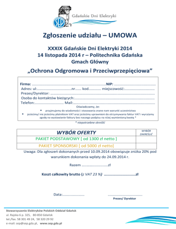Zgłoszenie udziału – UMOWA XXXIX Gdańskie Dni Elektryki 2014 14 listopada 2014 r – Politechnika Gdańska Gmach Główny „Ochrona Odgromowa i Przeciwprzepięciowa” Firma: .......................................................................NIP: ........................................ Adres: ul:.................................nr...... kod............ miejscowość:............................. Prezes/Dyrektor: ………............................................................................................ Osoba do kontaktów bieżących:............................................................................. Telefon:............................ Mail:……......................................................................... Oświadczamy, że: przyjmujemy do wiadomości i stosowania znane nam warunki uczestnictwa jesteśmy/ nie jesteśmy płatnikiem VAT oraz jesteśmy uprawnieni do otrzymywania faktur VAT i wyrażamy zgodę na wystawianie faktury bez naszego podpisu na niżej wymienioną kwotę * * niepotrzebne skreślić WYBÓR ZAKREŚLIĆ WYBÓR OFERTY PAKIET PODSTAWOWY [ od 1300 zł netto ] PAKIET SPONSORSKI [ od 5000 zł netto] Uwaga: Dla zgłoszeń dokonanych przed 10.09.2014 obowiązuje zniżka 20% pod warunkiem dokonania wpłaty do 24.09.2014 r. Razem …..……...............zł Koszt całkowity brutto (z VAT 23 %) …..........................zł Data:..................... ................................. Prezes/ Dyrektor Stowarzyszenie Elektryków Polskich Oddział Gdańsk ul. Rajska 6 p. 325, 80-850 Gdańsk tel./fax. 58 301 49 24, 58 320 29 92 e-mail: [email protected], www.sep.gda.pl ZAŁĄCZNIK DO ZGŁOSZENIA UDZIAŁU Pakiet podstawowy ( od 1300 zł) Stoisko na targach (niezabudowane miejsce wystawiennicze ok. 11 m2 z zasilaniem). Możliwość umieszczenia standu o szerokości maks. 1,2 m na sali wykładowej. 2 zaproszenia na wieczorne spotkanie koleżeńskie. Prezentacja logo wystawcy na stronie www.sep.gda.pl w terminie od zgłoszenia do 14.12.2014 r. Pakiet sponsorski (od 5000 zł) Stoisko na targach (niezabudowane miejsce wystawiennicze z zasilaniem o powierzchni ustalonej z organizatorami). Możliwość umieszczenia dwóch standów o szerokości maks. 1,2 m na sali wykładowej. 15 minutowa prezentacja firmy na sali wykładowej. Logo firmy na zaproszeniach i materiałach konferencyjnych. Logo firmy i informacja w publikacji naukowej będącej zbiorem wygłaszanych referatów. Zawarcie informacji o firmie, ewentualnie materiału filmowego w prezentacji multimedialnej wyświetlanej cyklicznie na drugim ekranie podczas wykładów. 4 zaproszenia na wieczorne spotkanie koleżeńskie. Prezentacja logo sponsora na stronie www.sep.gda.pl w terminie od zgłoszenia do 14.12.2014 r. ZGŁOSZENIE: Wypełniony i podpisany formularz umowy należy przesłać pocztą, fax-em lub skan formularza pocztą e-mail, pod dane kontaktowe znajdujące się w stopce pisma. Prosimy o czytelnie wypełnienie zgłoszenia drukowanymi literami. Ponadto prosimy o wskazanie osoby, wraz z numerem telefonu, odpowiedzialnej za bezpośredni kontakt z organizatorami GDE w celu usprawnienia wzajemnej współpracy. SPRAWY ORGANIZACYJNE Gdańskie Dni Elektryki odbędą się 14 listopada 2014 r. od godz. 900 do godz. 1600. W godzinach 1700 – 2200 przewidziane jest wieczorne spotkanie koleżeńskie. SPONSORING GDE ORAZ KONTAKT W przypadku zainteresowania sponsorowaniem imprezy lub chęci uzyskania dodatkowych informacji prosimy o bezpośredni kontakt z koordynatorem pod adresem mailowym: [email protected], lub telefonicznym: 514 007 597 lub też o kontakt z Biurem Oddziału pod adresem umieszczonym w stopce. Stowarzyszenie Elektryków Polskich Oddział Gdańsk ul. Rajska 6 p. 325, 80-850 Gdańsk tel./fax. 58 301 49 24, 58 320 29 92 e-mail: [email protected], www.sep.gda.pl