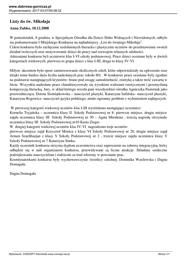 www.dabrowa-gornicza.pl Wygenerowano: 2017-03-07/00:58:32 Listy do św. Mikołaja Anna Zubko, 10.12.2008 W poniedziałek, 8 grudnia, w Specjalnym Ośrodku dla Dzieci Słabo Widzących i Niewidomych, odbyło się podsumowanie I Miejskiego Konkursu na najładniejszy „List do świętego Mikołaja”. Celem konkursu było zachęcenie uzdolnionych literacko i plastycznie uczniów do przedstawienie swoich działań twórczych oraz motywowanie dzieci do pracy nad rozwojem własnych zdolności. Adresatami konkursu byli uczniowie klas I-VI szkoły podstawowej. Prace dzieci oceniane były w dwóch kategoriach wiekowych, pierwsza to grupa dzieci z klas I-III, druga to klasy IV-VI. Miłym akcentem było spore zainteresowanie okolicznych szkół, które odpowiedziały na zgłoszenie oraz dzięki temu bardzo duża liczba nadesłanych prac (około 80) . W konkursie prace oceniane były zgodnie na podstawie następujących kryteriów: brano pod uwagę samodzielność, estetykę a także treść zawartą w liście. Wszystkie nadesłane prace charakteryzowały się wysokimi walorami estetycznymi i przemyślaną kompozycją literacką. Jury, w skład którego weszła pani wicedyrektor ośrodka Agnieszka Pasternak jako przewodnicząca, Dorota Siemiątkowska – nauczyciel plastyki, Katarzyna Safińska– nauczyciel plastyki, Katarzyna Rogowicz- nauczyciel języka polskiego, miało ogromny problem z wyłonieniem najlepszych. W pierwszej kategorii wiekowej uczniów klas I-III wyróżniono następujące uczennice: Kornelia Tryjańska – uczennica klasy II Szkoły Podstawowej nr 8- pierwsze miejsce, drugie miejsce zajęła uczennica klasy III Szkoły Podstawowej nr 30 – Agata Mienkina , trzecią nagrodę otrzymała uczennica klasy III Szkoły Podstawowej nr10 Kasia Zieger. W drugiej kategorii wiekowej uczniów klas IV-VI nagrodzono troje uczniów: pierwsze miejsce zajął Krzysztof Monica z klasy VI Szkoły Podstawowej nr 28, drugie miejsce zajął Armen Szachbazjan z klasy V Szkoły Podstawowej nr 2 , trzecie miejsce zajęła uczennica klasy V Szkoły Podstawowej nr 7 Katarzyna Simka. Każdy uczestnik konkursu otrzyma dyplom uczestnictwa oraz zaproszenie na zabawę integracyjną, który odbędzie się w auli organizatora konkursu, przewidywane są liczne atrakcje. Składany serdeczne podziękowania nauczycielom i rodzicom za trud włożony w powstanie prac. Koordynatorkami konkursu były wychowawczynie świetlicy szkolnej: Dominika Wasilewska i Dagna Domagała. Dagna Domagała Wykonanie: CONCEPT Intermedia www.concept.net.pl Strona 1/1