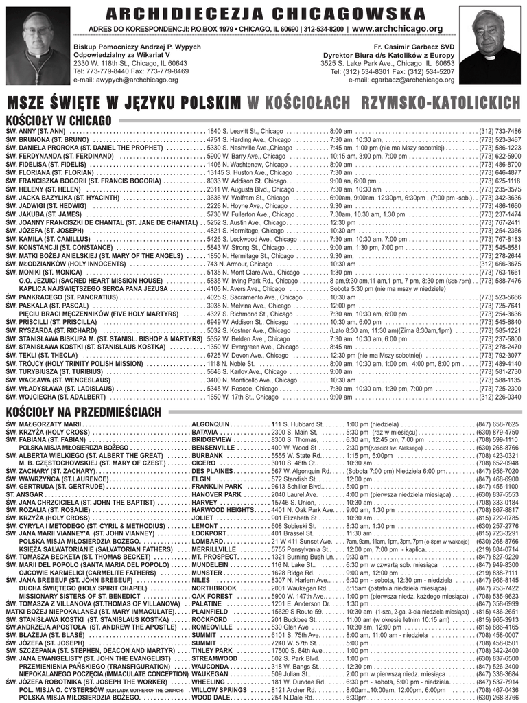 ARCHIDIECEZJA CHICAGOWSKA ADRES DO KORESPONDENCJI: P.O.BOX 1979 • CHICAGO, IL 60690 | 312-534-8200 | Biskup Pomocniczy Andrzej P. Wypych Odpowiedzialny za Wikariat V 2330 W. 118th St., Chicago, IL 60643 Tel: 773-779-8440 Fax: 773-779-8469 e-mail: [email protected] www.archchicago.org Fr. Casimir Garbacz SVD Dyrektor Biura d/s Katolików z Europy 3525 S. Lake Park Ave., Chicago IL 60653 Tel: (312) 534-8301 Fax: (312) 534-5207 e-mail: [email protected] MSZE ŒWIÊTE W JÊZYK U PO LS KIM W KO ŒCIO£ ACH RZYMSKO -KATOLIC KICH KOŒCIO£Y W CHICAGO ŚW. ANNY (ST. ANN) . . . . . . . . . . . . . . . . . . . . . . . . . . . . . . . . . . . . . . . . . 1840 S. Leavitt St., Chicago . . . . . . . . . . . . . 8:00 am . . . . . . . . . . . . . . . . . . . . . . . . . . . . . . . . . . . . . (312) 733-7486 ŚW. BRUNONA (ST. BRUNO) . . . . . . . . . . . . . . . . . . . . . . . . . . . . . . . . . . 4751 S. Harding Ave., Chicago . . . . . . . . . . . 7:30 am, 10:30 am, . . . . . . . . . . . . . . . . . . . . . . . . . . . . (773) 523-3467 ŚW. DANIELA PROROKA (ST. DANIEL THE PROPHET) . . . . . . . . . . . . 5330 S. Nashville Ave.,Chicago . . . . . . . . . . 7:45 am, 1:00 pm (nie ma Mszy sobotniej) . . . . . . . . . . (773) 586-1223 ŚW. FERDYNANDA (ST. FERDINAND) . . . . . . . . . . . . . . . . . . . . . . . . . . 5900 W. Barry Ave., Chicago . . . . . . . . . . . . 10:15 am, 3:00 pm, 7:00 pm . . . . . . . . . . . . . . . . . . . . . (773) 622-5900 ŚW. FIDELISA (ST. FIDELIS) . . . . . . . . . . . . . . . . . . . . . . . . . . . . . . . . . . . 1406 N. Washtenaw, Chicago . . . . . . . . . . . . 8:00 am . . . . . . . . . . . . . . . . . . . . . . . . . . . . . . . . . . . . . (773) 486-8700 ŚW. FLORIANA (ST. FLORIAN) . . . . . . . . . . . . . . . . . . . . . . . . . . . . . . . . . 13145 S. Huston Ave., Chicago . . . . . . . . . . 7:30 am . . . . . . . . . . . . . . . . . . . . . . . . . . . . . . . . . . . . . (773) 646-4877 ŚW. FRANCISZKA BOGORII (ST. FRANCIS BOGORIA) . . . . . . . . . . . . . 8033 W. Addison St. Chicago. . . . . . . . . . . . . 9:00 an, 6:00 pm . . . . . . . . . . . . . . . . . . . . . . . . . . . . . . (773) 625-1118 ŚW. HELENY (ST. HELEN) . . . . . . . . . . . . . . . . . . . . . . . . . . . . . . . . . . . . 2311 W. Augusta Blvd., Chicago . . . . . . . . . . 7:30 am, 10:30 am . . . . . . . . . . . . . . . . . . . . . . . . . . . . (773) 235-3575 ŚW. JACKA BAZYLIKA (ST. HYACINTH) . . . . . . . . . . . . . . . . . . . . . . . . . 3636 W. Wolfram St., Chicago . . . . . . . . . . . 6:00am, 9:00am, 12:30pm, 6:30pm , (7:00 pm -sob.). . (773) 342-3636 ŚW. JADWIGI (ST. HEDWIG) . . . . . . . . . . . . . . . . . . . . . . . . . . . . . . . . . . 2226 N. Hoyne Ave., Chicago . . . . . . . . . . . . 9:30 am . . . . . . . . . . . . . . . . . . . . . . . . . . . . . . . . . . . . . (773) 486-1660 ŚW. JAKUBA (ST. JAMES) . . . . . . . . . . . . . . . . . . . . . . . . . . . . . . . . . . . . 5730 W. Fullerton Ave., Chicago . . . . . . . . . . 7.30am, 10.30 am, 1.30 pm . . . . . . . . . . . . . . . . . . . . . (773) 237-1474 ŚW. JOANNY FRANCISZKI DE CHANTAL (ST. JANE DE CHANTAL) . . 5252 S. Austin Ave., Chicago. . . . . . . . . . . . . 12:30 pm . . . . . . . . . . . . . . . . . . . . . . . . . . . . . . . . . . . . (773) 767-2411 ŚW. JÓZEFA (ST. JOSEPH) . . . . . . . . . . . . . . . . . . . . . . . . . . . . . . . . . . . 4821 S. Hermitage, Chicago . . . . . . . . . . . . . 10:30 am . . . . . . . . . . . . . . . . . . . . . . . . . . . . . . . . . . . . (773) 254-2366 ŚW. KAMILA (ST. CAMILLUS) . . . . . . . . . . . . . . . . . . . . . . . . . . . . . . . . . 5426 S. Lockwood Ave., Chicago . . . . . . . . . 7:30 am, 10:30 am, 7:00 pm . . . . . . . . . . . . . . . . . . . . . (773) 767-8183 ŚW. KONSTANCJI (ST. CONSTANCE) . . . . . . . . . . . . . . . . . . . . . . . . . . . 5843 W. Strong St., Chicago . . . . . . . . . . . . . 9:00 am, 1:30 pm, 7:00 pm . . . . . . . . . . . . . . . . . . . . . . (773) 545-8581 ŚW. MATKI BOŻEJ ANIELSKIEJ (ST. MARY OF THE ANGELS) . . . . . . 1850 N. Hermitage St., Chicago . . . . . . . . . . 9:30 am, . . . . . . . . . . . . . . . . . . . . . . . . . . . . . . . . . . . . (773) 278-2644 ŚW. MŁODZIANKÓW (HOLY INNOCENTS) . . . . . . . . . . . . . . . . . . . . . . . 743 N. Armour, Chicago . . . . . . . . . . . . . . . . 10:30 am . . . . . . . . . . . . . . . . . . . . . . . . . . . . . . . . . . . . (312) 666-3675 ŚW. MONIKI (ST. MONICA) . . . . . . . . . . . . . . . . . . . . . . . . . . . . . . . . . . . . 5135 N. Mont Clare Ave., Chicago . . . . . . . . 1:30 pm . . . . . . . . . . . . . . . . . . . . . . . . . . . . . . . . . . . . . (773) 763-1661 O.O. JEZUICI (SACRED HEART MISSION HOUSE) . . . . . . . . . . . . 5835 W. Irving Park Rd., Chicago . . . . . . . . . 8 am,9:30 am,11 am,1 pm, 7 pm, 8:30 pm (Sob.7pm) . . (773) 588-7476 KAPLICA NAJŚWIĘTSZEGO SERCA PANA JEZUSA . . . . . . . . . . . 4105 N. Avers Ave., Chicago . . . . . . . . . . . . Sobota 5:30 pm (nie ma mszy w niedziele) ŚW. PANKRACEGO (ST. PANCRATIUS) . . . . . . . . . . . . . . . . . . . . . . . . . . 4025 S. Sacramento Ave., Chicago . . . . . . . 10:30 am . . . . . . . . . . . . . . . . . . . . . . . . . . . . . . . . . . . . (773) 523-5666 ŚW. PASKALA (ST. PASCAL) . . . . . . . . . . . . . . . . . . . . . . . . . . . . . . . . . . 3935 N. Melvina Ave., Chicago . . . . . . . . . . . 12:00 pm . . . . . . . . . . . . . . . . . . . . . . . . . . . . . . . . . . . . (773) 725-7641 PIĘCIU BRACI MĘCZENNIKÓW (FIVE HOLY MARTYRS) . . . . . . . 4327 S. Richmond St., Chicago . . . . . . . . . . 7:30 am, 10:30 am, 6:00 pm . . . . . . . . . . . . . . . . . . . . . (773) 254-3636 ŚW. PRISCILLI (ST. PRISCILLA) . . . . . . . . . . . . . . . . . . . . . . . . . . . . . . . 6949 W. Addison St., Chicago . . . . . . . . . . . 10:30 am, 6:00 pm . . . . . . . . . . . . . . . . . . . . . . . . . . . . (773) 545-8840 ŚW. RYSZARDA (ST. RICHARD) . . . . . . . . . . . . . . . . . . . . . . . . . . . . . . 