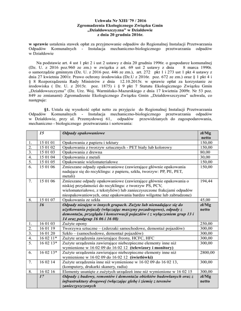 Uchwała Nr XIII/ 79 / 2016 Zgromadzenia Ekologicznego Związku Gmin „Działdowszczyzna” w Działdowie z dnia 20 grudnia 2016r. w sprawie ustalenia stawek opłat za przyjmowanie odpadów do Regionalnej Instalacji Przetwarzania Odpadów Komunalnych - Instalacja mechaniczno-biologicznego przetwarzania odpadów w Działdowie Na podstawie art. 4 ust 1 pkt 2 i ust 2 ustawy z dnia 20 grudnia 1996r. o gospodarce komunalnej (Dz. U. z 2016 poz.960 ze zm.) w związku z art. 69 ust 2 ustawy z dnia 8 marca 1990r. o samorządzie gminnym (Dz. U. z 2016 poz. 446 ze zm.), art. 272 pkt 1 i 273 ust 1 pkt 4 ustawy z dnia 27 kwietnia 2001r. Prawo ochrony środowiska (Dz.U z 2016r. poz. 672 ze zm.) oraz § 1 pkt 4 i § 8 Rozporządzenia Rady Ministrów z dnia 12.10.2015r. w sprawie opłat za korzystanie ze środowiska ( Dz. U. z 2015r. poz. 1875) i § 9 pkt 7 Statutu Ekologicznego Związku Gmin „Działdowszczyzna” (Dz. Urz. Woj. Warmińsko-Mazurskiego z dnia 17 kwietnia 2009r. Nr 53 poz. 849 ze zmianami) Zgromadzenie Ekologicznego Związku Gmin „Działdowszczyzna” uchwala, co następuje: §1. Ustala się wysokość opłat netto za przyjęcie do Regionalnej Instalacji Przetwarzania Odpadów Komunalnych - Instalacja mechaniczno-biologicznego przetwarzania odpadów w Działdowie, przy ul. Przemysłowej 61, odpadów przewidzianych do zagospodarowania, mechaniczno - biologicznego przetwarzania i sortowania: 15 Odpady opakowaniowe 1. 2. 3. 4. 5. 6. 15 01 01 15 01 02 15 01 03 15 01 04 15 01 05 15 01 06 7. 15 01 06 8. 15 01 07 16 1. 2. 3. 4. 5. 16 01 03 16 01 19 16 01 20 16 02 11* 16 02 13* 6. 16 02 13* 7. 16 02 14 8. 16 02 16 17 Opakowania z papieru i tektury Opakowania z tworzyw sztucznych - PET biały lub kolorowy Opakowania z drewna Opakowania z metali Opakowanie wielomateriałowe Zmieszane odpady opakowaniowe (zawierające głównie opakowania nadające się do recyklingu: z papieru, szkła, tworzyw: PP, PE, PET, metali) Zmieszane odpady opakowaniowe (zawierające głównie opakowania o niskiej przydatności do recyklingu: z tworzyw PS, PCV, wielomateriałowe, z tekstyliów) lub zanieczyszczone frakcjami odpadów nieopakowaniowych, oraz opakowania bardzo wilgotne lub zabrudzone) Opakowania ze szkła Odpady nieujęte w innych grupach. Zużyte lub nienadające się do użytkowania pojazdy (włączając maszyny pozadrogowe), odpady z demontażu, przeglądu i konserwacji pojazdów ( z wyłączeniem grup 13 i 14 oraz podgrup 16 06 i 16 08) Zużyte opony Tworzywa sztuczne – (zderzaki samochodowe, demontaż pojazdów) Szkło – (samochodowe, demontaż pojazdów) Zużyte urządzenia zawierające freony, HCFC, HFC Zużyte urządzenia zawierające niebezpieczne elementy inne niż wymienione w 16 02 09 do 16 02 12 (telewizory i monitory) Zużyte urządzenia zawierające niebezpieczne elementy inne niż wymienione w 16 02 09 do 16 02 12 (świetlówki) Zużyte urządzenia inne niż wymienione w 16 02 09 do 16 02 13, (komputery, drukarki skanery, radia) Elementy usunięte z zużytych urządzeń inne niż wymienione w 16 02 15 Odpady z budowy, remontów i demontażu obiektów budowlanych oraz z infrastruktury drogowej (włączając glebę i ziemię z terenów zanieczyszczonych zł/Mg netto 150,00 150,00 80,00 30,00 150,00 150,00 194,44 45,00 zł/Mg netto 250,00 300,00 300,00 300,00 300,00 2800,00 300,00 300,00 zł/Mg netto 1. 2. 3. 17 01 01 17 01 02 17 01 07 4. 5. 17 02 02 17 09 04 6. 19 12 12 20 1. 2. 3. 4. 5. 6. 20 01 01 20 01 02 20 01 10 20 01 11 20 01 23* 20 01 33* 7. 8. 20 01 34 20 01 35* 9. 20 01 36 10. 11. 20 01 39 20 01 39 12. 13. 14. 15. 20 01 40 20 03 01 20 03 03 20 03 07 Odpady z betonu oraz gruz betonowy z rozbiórek i remontów Gruz ceglany Zmieszane odpady z betonu, gruzu ceglanego, odpadów i materiałów ceramicznych i elementów wyposażenia Szkło – np. szkło płaskie okienne Zmieszane odpady z budowy, remontów i demontażu inne niż wymienione w 17 09 01, 17 09 02 i 17 09 03 (np. ramy okienne ze szkłem) Inne odpady ( w tym zmieszane substancje i przedmioty) z mechanicznej obróbki odpadów inne niż wymienione w 19 12 11 ( z innych sortowni) Odpady komunalne łącznie z frakcjami gromadzonymi selektywnie Papier i tektura Szkło Odzież Tekstylia Urządzenia zawierające freony ( lodówki,) Baterie i akumulatory łącznie z bateriami i akumulatorami wymienionymi w 16 06 01, 16 06 02 lub 16 06 03 oraz niesortowane baterie i akumulatory zawierające te baterie Baterie i akumulatory inne niż wymienione w 20 01 33 Zużyte urządzenia elektryczne i elektroniczne inne niż wymienione 20 01 21*, 20 01 23*(monitory, telewizory) Zużyte urządzenia elektryczne i elektroniczne inne niż wymienione w 20 01 21, 20 01 23 i 20 01 35 (drukarki, klawiatury, komputery, suszarki, laptopy, czajniki, żelazka, radia) Tworzywa sztuczne Tworzywa sztuczne zmieszane z innymi kategoriami lub grupami odpadów: popiołami, bioodpadami, odpadami budowlanymi, rolniczymi, przemysłowymi, medycznymi itp. Metale Niesegregowane (zmieszane) odpady komunalne Odpady z czyszczenia ulic i placów Odpady wielkogabarytowe 30,00 40,00 100,00 150,00 100,00 300,00 zł/Mg netto 138,00 138,00 150,00 150,00 164,00 164,00 164,00 164,00 164,00 138,00 194,44 30,00 194,44 194,44 150,00 § 2. Opłaty brutto za przyjęcie odpadów wymienionych w § 1 stanowić będą opłaty netto powiększone o należny podatek VAT. § 3. Upoważnia się Zarząd Związku do ustalania stawek opłat za przyjmowanie odpadów przewidzianych do zagospodarowania, mechaniczno - biologicznego przetwarzania i sortowania w Regionalnej Instalacji Przetwarzania Odpadów Komunalnych - Instalacja mechaniczno-biologicznego przetwarzania odpadów w Działdowie, przy ul. Przemysłowej 61 dla podmiotów spoza terenu Ekologicznego Związku Gmin „Działdowszczyzna” indywidualnie na zasadzie negocjacji umownych z uwzględnieniem obowiązującej stawki opłaty za korzystanie ze środowiska. § 4. Wykonanie uchwały powierza się Zarządowi Związku. § 5. Tracą moc Uchwa