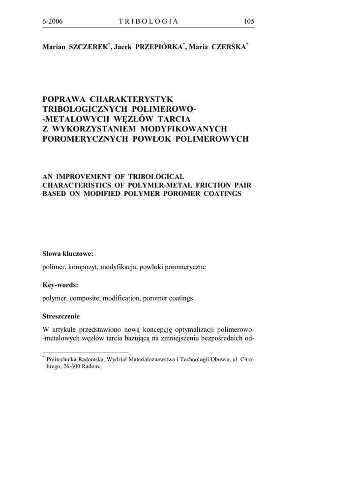6-2006 TRIBOLOGIA 105 Marian SZCZEREK*, Jacek PRZEPIÓRKA*, Maria CZERSKA* POPRAWA CHARAKTERYSTYK TRIBOLOGICZNYCH POLIMEROWO-METALOWYCH WĘZŁÓW TARCIA Z WYKORZYSTANIEM MODYFIKOWANYCH POROMERYCZNYCH POWŁOK POLIMEROWYCH AN IMPROVEMENT OF TRIBOLOGICAL CHARACTERISTICS OF POLYMER-METAL FRICTION PAIR BASED ON MODIFIED POLYMER POROMER COATINGS Słowa kluczowe: polimer, kompozyt, modyfikacja, powłoki poromeryczne Key-words: polymer, composite, modification, poromer coatings Streszczenie W artykule przedstawiono nową koncepcję optymalizacji polimerowo-metalowych węzłów tarcia bazującą na zmniejszeniu bezpośrednich od* Politechnika Radomska, Wydział Materiałoznawstwa i Technologii Obuwia, ul. Chrobrego, 26-600 Radom. 106 TRIBOLOGIA 6-2006 działywań pomiędzy współpracującymi powierzchniami elementów trących. Liczne badania wskazują na występowanie adhezyjnych szczepień powodujących zużywanie elementu polimerowego oraz wzrost temperatury w strefie styku. Wysoka temperatura może również inicjować reakcje destrukcji polimeru, którym towarzyszy wydzielanie się małocząsteczkowych produktów rozkładu niszczących współpracujący z polimerem element stalowy. Ograniczenie tych czynników, zdaniem autorów, powinno przyczynić się do znaczącego wydłużenia pracy węzła tarcia, jak również do zmniejszenia oporów ruchu. Przeprowadzone badania tribologiczne potwierdziły słuszność przyjętej koncepcji poprawy charakterystyk tribologicznych polimerowo-metalowych węzłów tarcia. Polega ona na pokryciu elementu stalowego powłokami PVD (np.: TiN, CrN) oraz zastąpieniu elementu polimerowego elementem stalowym pokrytym poromeryczną powłoką polimerową. Radykalnie ogranicza to występowanie głównych mechanizmów powodujących zużycie węzłów tarcia. WPROWADZENIE Tworzywa sztuczne obecnie wykorzystywane są do budowy węzłów tarcia pracujących przy małych obciążeniach i prędkościach poślizgu. Zwiększenie zakresu zastosowań polimerowo-metalowych węzłów w budowie maszyn uzależnione jest od zwiększenia ich trwałości, limitowanej zużyciem elementu polimerowego. Dominującym mechanizmem zużywania są oddziaływania adhezyjne, powodujące nie tylko przenoszenie polimeru na metal, lecz również przyczyniające się do zużycia zmęczeniowego – pękania polimeru, a w konsekwencji wykruszania jego cząstek, mogących powodować zużywanie ścierne. Naniesiony polimer na współpracujący element stalowy radykalnie zmniejsza ilość ciepła odprowadzanego ze strefy styku powodując wzrost temperatury. Proces ten jest powodem wielu niekorzystnych zjawisk: mięknięcia kompozytu (polimery używane do budowy węzłów tarcia najczęściej są termoplastami) inicjowania zjawisk elektrycznych w strefie styku (afiniczność) reakcje termicznego rozkładu polimeru z wydzieleniem się małocząsteczkowych substancji, agresywnych dla współpracującej powierzchni elementu metalowego. Z przytoczonych rozważań wynika, że wzrost temperatury w strefie styku powoduje nie tylko niszczenie polimeru, ale również przyczynia się do zużycia elementu stalowego przez powodowanie kruchości 6-2006 TRIBOLOGIA 107 wodorowej lub nawet powodowanie „wypalania” warstwy wierzchniej stali w wyniku mikroeksplozji mieszaniny tlenu i wodoru (który jest produktem rozkładu termicznego polimerów) [L. 1÷5]. W procesie modyfikacji polimerów różnymi napełniaczami, ukierunkowanym na polepszanie właściwości mechanicznych, najczęściej nie jest uwzględniany energetyczny stan powierzchni tak otrzymywanego kompozytu ani tego, że musi on współpracować z elementem metalowym, najczęściej stalowym, którego tlenki tworzą wiązania wodorowe z polimerem, zwiększając adhezję. Stosowane obecnie napełniacze używane do poprawy właściwości tribologicznych kompozytu z reguły nie przyczyniają się do zwiększenia przenoszenia ciepła w kompozycie [L. 6]. Jednym ze sposobów poprawy bilansu energetycznego w strefie styku polimerowo-metalowych węzłów tarcia jest wytworzenie cienkiej powłoki kompozytowej na elemencie metalowym, która z uwagi na swoją niewielką grubość będzie mogła, poprzez podłoże, na którym jest osadzona, lepiej odprowadzać ciepło wydzielone podczas tarcia [L. 7]. Autorzy są zdania, że współpraca cienkiej polimerowej powłoki z powierzchnią metalową pokrytą powłoką o odmiennych od metalu właściwościach fizykochemicznych może umożliwić wyeliminowanie wielu przedstawionych wyżej, niekorzystnych zjawisk i znacznie złagodzić negatywne skutki procesu tarcia. ISTOTA METODY W zaproponowanym modelu węzła tarcia znacząca poprawa charakterystyk tribologicznych skojarzenia polimer-metal możliwa jest na skutek zmniejszenia oddziaływań adhezyjnych między elementami trącymi poprzez odpowiedni dobór modyfikatora polimeru wprowadzonego do warstwy przypowierzchniowej cienkiej powłoki z tworzywa sztucznego nakładanej na jeden z elementów trących oraz skorelowany z nim dobór materiału powłoki PVD nakładanej na drugi element metalowy (Rys. 1). Układ taki charakteryzuje się mniejszymi (w porównaniu do tradycyjnych polimerowo-metalowych węzłów tarcia) oddziaływaniami adhezyjnymi w strefie styku, co pozwala na jego eksploatację przy większych obciążeniach i prędkościach poślizgu oraz dodatkowo większą dyfuzyjnością ciepła poza strefę styku poprzez cienką polimerową powłokę, którą dodatkowo można w łatwy sposób modyfikować. Zaproponowany model umożliwia w prosty sposób dobór zarówno modyfikatora powłoki polimerowej, jak również powłoki PVD nakładanej na elementy stalowe 108 TRIBOLOGIA 6-2006 do węzła tarcia pracującego w specjalnych warunkach. Zastosowanie drogiej modyfikacji elementów węzła tarcia tylko w cienkich warstwach współpracujących ze sobą, a nie w całej objętości elementu, czyni proponowany układ ekonomicznie uzasadnionym. Dodatkowo, wykorzystanie opracowane