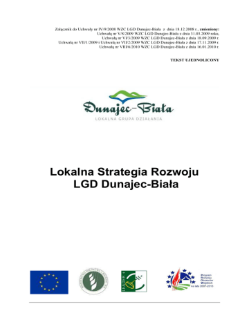 Załącznik do Uchwały nr IV/9/2008 WZC LGD Dunajec-Biała z dnia 18.12.2008 r., zmieniony: Uchwałą nr V/8/2009 WZC LGD Dunajec-Biała z dnia 31.03.2009 roku, Uchwałą nr VI/3/2009 WZC LGD Dunajec-Biała z dnia 18.09.2009 r. Uchwałą nr VII/1/2009 i Uchwałą nr VII/2/2009 WZC LGD Dunajec-Biała z dnia 17.11.2009 r. Uchwałą nr VIII/6/2010 WZC LGD Dunajec-Biała z dnia 16.01.2010 r. TEKST UJEDNOLICONY Lokalna Strategia Rozwoju LGD Dunajec-Biała WPROWADZENIE Lokalna Strategia Rozwoju została przygotowana przez członków Lokalnej Grupy Działania Dunajec-Biała dla wykorzystania potencjałów rozwojowych i aktywizacji społeczności lokalnej, dzięki moŜliwościom, jakie daje 4 Oś Priorytetowa Programu Rozwoju Obszarów Wiejskich na lata 2007-2013 – LEADER. Działania zawarte w LSR koncentrują się wokół czterech najwaŜniejszych celów ogólnych, których osiągnięcie zagwarantuje zrównowaŜony i stały rozwój obszaru. Są to: Rozwój turystyki bazującej na walorach przyrodniczych i kulturowych regionu Dunajec-Biała; RóŜnicowanie działalności gospodarczej obszaru Dunajec-Biała w oparciu o produkty lokalne i rzemiosło; Zachowanie dziedzictwa przyrodniczego obszaru Dunajec-Biała; Rozwój potencjału ludzkiego obszaru Dunajec-Biała. LGD Dunajec-Biała została powołana w celu stymulowania lokalnych inicjatyw na rzecz rozwoju obszarów wiejskich, włączania partnerów społecznych oraz gospodarczych do planowania i wdraŜania lokalnych projektów. Poprzez nasze działania chcemy sprzyjać lepszemu wykorzystaniu potencjału rozwojowego terenów wiejskich, poprawie ich konkurencyjności, jako miejsca zamieszkania i prowadzenia działalności gospodarczej, a takŜe przyczyniać się do aktywizacji oraz współpracy mieszkańców wsi. Proces budowania LSR trwał wiele miesięcy, a jego uczestnikami byli członkowie Lokalnej Grupy Działania Dunajec-Biała reprezentujący róŜnorodne środowiska – mieszkańcy, rady sołeckie, organizacje pozarządowe, przedsiębiorcy, instytucje publiczne i samorządowe, kościoły i związki wyznaniowe, grupy nieformalne. Wartości, którymi kierowaliśmy się podczas dyskusji i spotkań są zbieŜne z aspektami cechującymi inicjatywę LEADER, a były to: Podejście lokalne – formułowanie LSR na podstawie specyficznej sytuacji obszaru Dunajec-Biała, jego silnych i słabych stron, zwrócenie szczególnej uwagi na jego wewnętrzną spójność społeczną, wspólną historię i tradycje, poczucie jedności. Podejście oddolne – partycypacyjne podejmowanie decyzji we wszystkich aspektach rozwoju, zaangaŜowanie partnerów lokalnych, formułowanie przedsięwzięć LSR, jako odpowiedzi na potrzeby i oczekiwania społeczności. Podejście partnerskie – zapewnienie większościowego udziału partnerów społecznych i gospodarczych w podejmowaniu decyzji. Innowacyjność – przedsięwzięcia sformułowane w LSR kaŜdorazowo dotyczą nowego sposobu promowania lokalnych zasobów, działań przynoszących nowe rozwiązania problemów obszarów wiejskich lub przynoszące w efekcie powstanie nowego produktu, nowego procesu, nowej formy organizacyjnej. Podejście zintegrowane – przedsięwzięcia zawarte w LSR są powiązane i koordynowane jako spójna całość, wystepują powiązania pomiędzy róŜnymi grupami uczestników: gospodarczymi, społecznymi, kulturalnymi, ekologicznymi działającymi na naszym obszarze. Tworzenie powiązań i współpraca – we wszystkich przedsięwzięciach LSR moŜliwa jest współpraca, wymiana informacji i doświadczeń oraz adaptacja dobrych rozwiązań z innych LGD, tak krajowych, jak i zagranicznych w w celu zwiększania efektywności prowadzonych projektów. Lokalne finansowanie i zarządzanie – w sposób odpowiedzialny opracowano lokalne kryteria i procedury wyboru operacji podmiotów z obszaru Dunajec-Biała, co w efekcie ma zapewnić rozwój w tych kierunkach, które w LSR uznaliśmy za najbardziej perspektywiczne. Lokalna Strategia Rozwoju LGD Dunajec-Biała Lokalna Strategia Rozwoju LGD Dunajec-Biała jest zaproszeniem do współpracy wszystkich osób, instytucji i środowisk, którym zaleŜy na dynamicznym rozwoju obszarów wiejskich naszego regionu. Przedsięwzięcia zaproponowane w Strategii stanowią wyzwania dla całej społeczności lokalnej. KaŜde z nich musi być realizowane przez wiele podmiotów, rozumiejących swoją rolę w podejściu LEADER. Dziękując wszystkim partnerom lokalnym za zaangaŜowanie i wkład merytoryczny w powstanie niniejszego dokumentu, Ŝyczymy nam wszystkim, aby osiągnięcie celów Lokalnej Strategii Rozwoju przyczyniło się do dynamicznego i zrównowaŜonego rozwoju naszego obszaru. Zarząd Lokalnej Grupy Działania Dunajec-Biała 3 Lokalna Strategia Rozwoju LGD Dunajec-Biała Spis treści I Charakterystyka LGD Dunajec-Biała jako jednostki odpowiedzialnej za realizację LSR. .......... 5 II Opis obszaru objętego LSR wraz z uzasadnieniem jego wewnętrznej spójności .................. 19 III Analiza SWOT dla obszaru objetego LSR;wnioski wynikające z przeprowadzonej analizy ... 39 IV Cele ogólne i szczegółowe LSR oraz planowane do realizacji przedsięwzięcia.................... 47 V Misja LGD Dunajec-Biała .................................................................................................... 111 VI Spójność specyfiki obszaru z celami LSR .......................................................................... 112 VII Uzasadnienie podejścia zintegrowanego dla planowanych w ramach LSR przedsięwzięć 114 VIII Uzasadnienie podejścia innowacyjnego dla planowanych w ramach LSR przedsięwzięć 116 IX Procedura oceny zgodności operacji z LSR, procedury wyboru operacji przez LGD, procedury odwołania od rozstrzygnięć w sprawie wyboru operacji w ramach działania „WdraŜanie LSR”, kryteriów, na podstawie których oceniana jest zgodność operacji z LSR oraz kryteriów wyboru operacji, a takŜe procedury zmiany tych kryte
