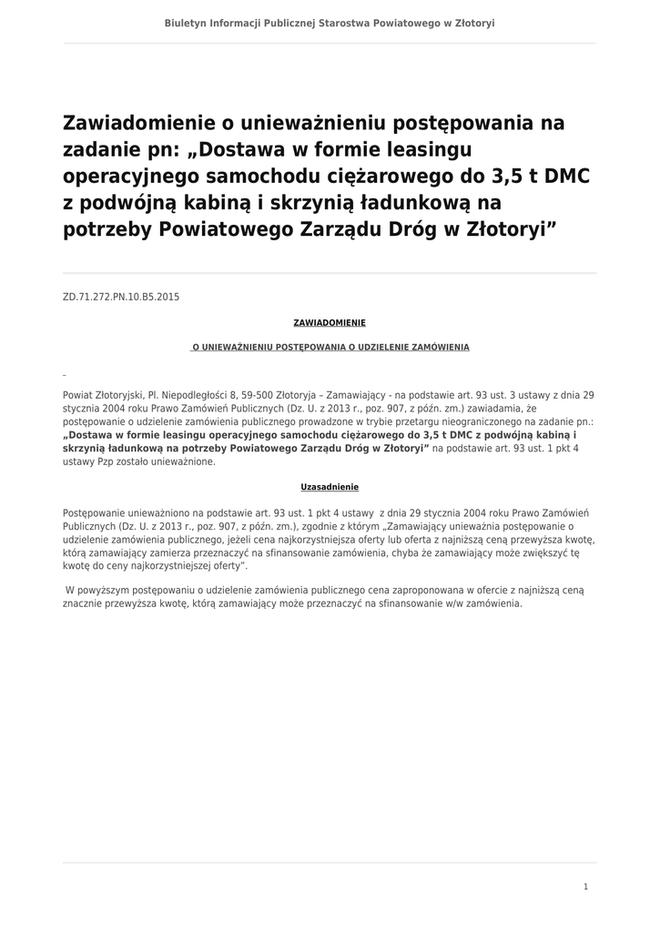 Biuletyn Informacji Publicznej Starostwa Powiatowego w Złotoryi Zawiadomienie o unieważnieniu postępowania na zadanie pn: „Dostawa w formie leasingu operacyjnego samochodu ciężarowego do 3,5 t DMC z podwójną kabiną i skrzynią ładunkową na potrzeby Powiatowego Zarządu Dróg w Złotoryi” ZD.71.272.PN.10.B5.2015 ZAWIADOMIENIE O UNIEWAŻNIENIU POSTĘPOWANIA O UDZIELENIE ZAMÓWIENIA Powiat Złotoryjski, Pl. Niepodległości 8, 59-500 Złotoryja – Zamawiający - na podstawie art. 93 ust. 3 ustawy z dnia 29 stycznia 2004 roku Prawo Zamówień Publicznych (Dz. U. z 2013 r., poz. 907, z późn. zm.) zawiadamia, że postępowanie o udzielenie zamówienia publicznego prowadzone w trybie przetargu nieograniczonego na zadanie pn.: „Dostawa w formie leasingu operacyjnego samochodu ciężarowego do 3,5 t DMC z podwójną kabiną i skrzynią ładunkową na potrzeby Powiatowego Zarządu Dróg w Złotoryi” na podstawie art. 93 ust. 1 pkt 4 ustawy Pzp zostało unieważnione. Uzasadnienie Postępowanie unieważniono na podstawie art. 93 ust. 1 pkt 4 ustawy z dnia 29 stycznia 2004 roku Prawo Zamówień Publicznych (Dz. U. z 2013 r., poz. 907, z późn. zm.), zgodnie z którym „Zamawiający unieważnia postępowanie o udzielenie zamówienia publicznego, jeżeli cena najkorzystniejsza oferty lub oferta z najniższą ceną przewyższa kwotę, którą zamawiający zamierza przeznaczyć na sfinansowanie zamówienia, chyba że zamawiający może zwiększyć tę kwotę do ceny najkorzystniejszej oferty”. W powyższym postępowaniu o udzielenie zamówienia publicznego cena zaproponowana w ofercie z najniższą ceną znacznie przewyższa kwotę, którą zamawiający może przeznaczyć na sfinansowanie w/w zamówienia. 1