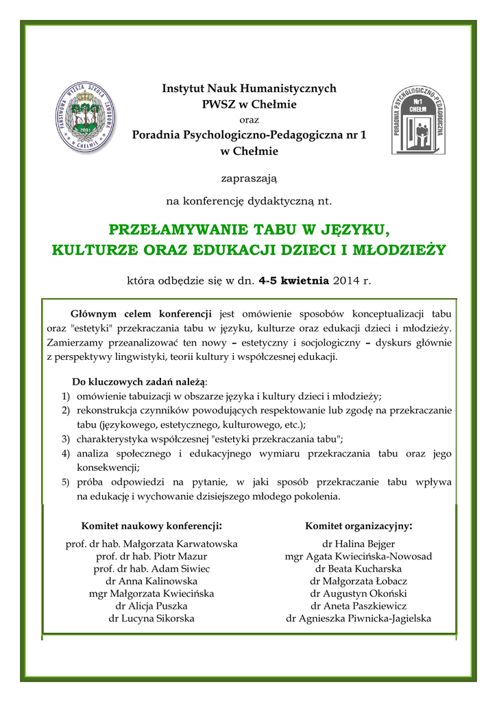 Instytut Nauk Humanistycznych PWSZ w Chełmie oraz Poradnia Psychologiczno-Pedagogiczna nr 1 w Chełmie zapraszają na konferencję dydaktyczną nt. PRZEŁAMYWANIE TABU W JĘZYKU, KULTURZE ORAZ EDUKACJI DZIECI I MŁODZIEŻY która odbędzie się w dn. 4-5 kwietnia 2014 r. Głównym celem konferencji jest omówienie sposobów konceptualizacji tabu oraz "estetyki" przekraczania tabu w języku, kulturze oraz edukacji dzieci i młodzieży. Zamierzamy przeanalizować ten nowy – estetyczny i socjologiczny – dyskurs głównie z perspektywy lingwistyki, teorii kultury i współczesnej edukacji. Do kluczowych zadań należą: 1) omówienie tabuizacji w obszarze języka i kultury dzieci i młodzieży; 2) rekonstrukcja czynników powodujących respektowanie lub zgodę na przekraczanie tabu (językowego, estetycznego, kulturowego, etc.); 3) charakterystyka współczesnej "estetyki przekraczania tabu"; 4) analiza społecznego i edukacyjnego wymiaru przekraczania tabu oraz jego konsekwencji; 5) próba odpowiedzi na pytanie, w jaki sposób przekraczanie tabu wpływa na edukację i wychowanie dzisiejszego młodego pokolenia. Komitet naukowy konferencji: Komitet organizacyjny: prof. dr hab. Małgorzata Karwatowska prof. dr hab. Piotr Mazur prof. dr hab. Adam Siwiec dr Anna Kalinowska mgr Małgorzata Kwiecińska dr Alicja Puszka dr Lucyna Sikorska dr Halina Bejger mgr Agata Kwiecińska-Nowosad dr Beata Kucharska dr Małgorzata Łobacz dr Augustyn Okoński dr Aneta Paszkiewicz dr Agnieszka Piwnicka-Jagielska Program konferencji: 4 kwietnia 2014 r. Budynek Instytutu Matematyki i Informatyki PWSZ, ul Pocztowa 54, duża aula 9.30 - 9.45 rejestracja uczestników konferencji Obrady w części plenarnej: 9.45 - 10.00 prof. dr hab. Małgorzata Karwatowska, prof. dr hab. Adam Siwiec Gender, queer i edukacja. O przełamywaniu tabu w kulturze 10.00 - 10.15 dr Lucyna Sikorska Od tabu magicznego do tabu komunikacyjnego – zmiany w definicji 10.15- 10.30 dr Agnieszka Piwnicka-Jagielska Zakazany owoc najlepiej smakuje. Czy istnieją jeszcze tematy tabu? 10.30-10.45 dr Paweł Skrzydlewski Bóg i religia jako „nowe tabu”. Ateizacja w edukacji człowieka 10.45-11.00 prof. dr hab. Jolanta Karbowniczek Przekraczanie tabu we współczesnej kulturze dziecięcej a konsekwencje wychowawcze - prognozy pedagogiczne 11.00-11.15 ks. dr Jerzy Król Tabu we współczesnej edukacji i wychowaniu a doświadczenia skandynawskie 11.15 - 11.30 mgr Elżbieta Miterka, mgr Sylwia Maciuk Problem tabu a ukryty program szkoły 11.30- 11.45 - przerwa na kawę i herbatę 11.45 -11.55 dr Anna Kalinowska Co można zobaczyć w lustrze? Literatura młodego czytelnika oswajająca zło 11.55-12.05 dr Beata Kucharska (Nie)obecność tabu w najnowszych tekstach kultury dla dzieci i młodzieży – rekonesans 12.05- 12.15 dr Aneta Paszkiewicz Mity i stereotypy o niepełnosprawności w kontekście tabuizacji 12.15 - 12.30 dr Alicja Puszka Tabuizacja tematu sieroctwa dawniej a dziś 12.30-12.45 mgr Małgorzata Kwiecińska, mgr Agnieszka Pasieczna Wspólna szkoła – wsparcie edukacyjne dla mniejszości narodowych (działania na rzecz Romów w SOSW w Chełmie) 12.45- 12.55 dr Halina Bejger Eutanazja dzieci jako temat tabu w Polsce 12.55 - 13.10 ks. dr Grzegorz Łuszczak SJ Rola współczesnych mediów w przekraczaniu obyczajowego tabu 13.10 - 13.20 dr Małgorzata Łobacz Wartość "słabego" człowieka w dobie globalizacji. Aspekt etycznopedagogiczny 13.15 - 13.30 - przerwa na kawę i herbatę Warsztaty Warsztaty odbywają się równolegle – 4 kwietnia od godz. 13.30 do 15.00 w budynku Instytutu Matematyki i Informatyki, ul. Pocztowa 54, a 5 kwietnia od godz. 10.00 do 13.30 w Instytucie Nauk Humanistycznych PWSZ w Chełmie, ul. Nowy Świat 3. O udziale w planowanych zajęciach decyduje kolejność zgłoszeń. Rejestracja odbędzie się w dniu konferencji. Chętni mogą też wcześniej rezerwować miejsce, pisząc na adres mailowy: [email protected]. Uczestnicy warsztatów otrzymają zaświadczenia o odbytym szkoleniu. Udział w konferencji jest bezpłatny. 4 kwietnia 2014 r. (piątek) Instytut Matematyki i Informatyki PWSZ w Chełmie, ul. Pocztowa 54 WARSZTATY od godz. 13.30 do 14.15 sala 102 dr Aneta Paszkiewicz mgr Agata Kwiecińska-Nowosad Granice w wychowaniu sala 212 sala 108 dr Anna Kalinowska Granice dzieciństwa wobec zła według propozycji literackich XX dr Agnieszka Piwnickawieku Jagielska O tym się nie mówi, czyli nauczyciel pod obstrzałem… od godz. 14.15 do godz. 15.00 mgr Anna Bielesza dr Lucyna Sikorska Bez uprzedzeń Przekraczanie tabu o zaburzeniach w reklamach telewizyjnych psychicznych od godz. 13.30 do 14.45, sala 11, budynek Rektoratu PWSZ "Trudne" emocje a "właściwa" mowa ciała, czyli jak pewne rzeczy "zachować dla siebie"? Warsztaty z podstaw synergologii poprowadzą studenci filologii polskiej i pedagogiki pod kierunkiem dr Beaty Kucharskiej. godz. 15.00 - 15.30 - sala 212 Forum wymiany opinii i wniosków uczestników konferencji 5 kwietnia 2014 r. (sobota) Instytut Nauk Humanistycznych PWSZ w Chełmie, ul. Nowy Świat 3 od godz. 10.00 do 11.15 i od 11.30 do 13.00 sala 115 godz. 10.00-11.15 dr Agnieszka Piwnicka-Jagielska Kwestia wulgaryzmów i nie tylko, czyli o słownictwie objętym tabu językowym sala 116 godz. 10.00-11.15 dr Beata Kucharska Tabu w języku i kulturze młodzieży polskiej w Polsce i Ukrainie. Dialogi "prowokowane" godz. 11.30- 12.45 dr Lucyna Sikorska Polska grzeczność językowa dawniej i dziś a respektowanie i przekraczanie tabu godz. 11.30-12.45 dr Aneta Paszkiewicz Mity i stereotypy o niepełnosprawności w kontekście tabuizacji od godz. 12.45 do 13.00 - przerwa na kawę i herbatę Po zakończeniu działań zapraszamy do sali 115 na prezentację efektów warsztatów. godz. 13.30 - 14.00 - zakończenie konferencji Kontakt: e-mail: [email protected] Instytut Nauk Humanistycznych ul. Nowy Świat 3, 22-100 Chełm Problematyka warsztatów: Warsztaty dla nauczycieli, animatorów i studentów GRA