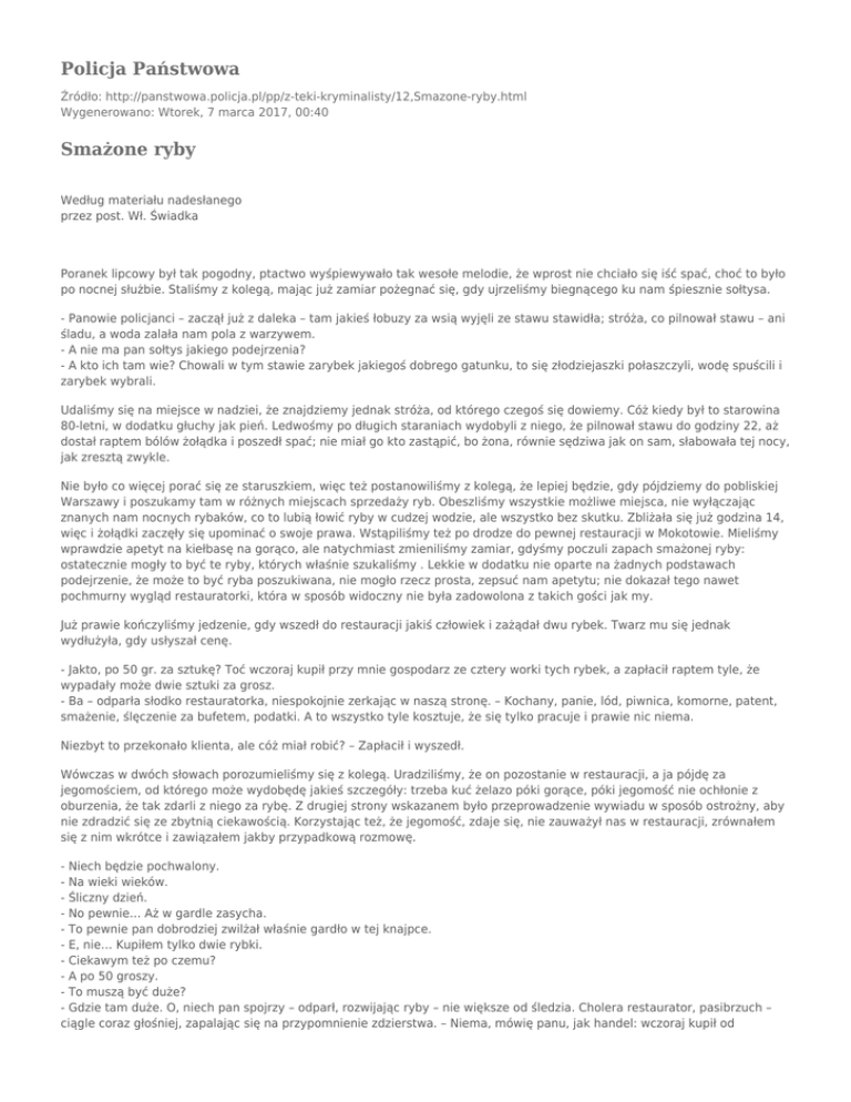 Policja Państwowa Źródło: http://panstwowa.policja.pl/pp/z-teki-kryminalisty/12,Smazone-ryby.html Wygenerowano: Wtorek, 7 marca 2017, 00:40 Smażone ryby Według materiału nadesłanego przez post. Wł. Świadka Poranek lipcowy był tak pogodny, ptactwo wyśpiewywało tak wesołe melodie, że wprost nie chciało się iść spać, choć to było po nocnej służbie. Staliśmy z kolegą, mając już zamiar pożegnać się, gdy ujrzeliśmy biegnącego ku nam śpiesznie sołtysa. - Panowie policjanci – zaczął już z daleka – tam jakieś łobuzy za wsią wyjęli ze stawu stawidła; stróża, co pilnował stawu – ani śladu, a woda zalała nam pola z warzywem. - A nie ma pan sołtys jakiego podejrzenia? - A kto ich tam wie? Chowali w tym stawie zarybek jakiegoś dobrego gatunku, to się złodziejaszki połaszczyli, wodę spuścili i zarybek wybrali. Udaliśmy się na miejsce w nadziei, że znajdziemy jednak stróża, od którego czegoś się dowiemy. Cóż kiedy był to starowina 80-letni, w dodatku głuchy jak pień. Ledwośmy po długich staraniach wydobyli z niego, że pilnował stawu do godziny 22, aż dostał raptem bólów żołądka i poszedł spać; nie miał go kto zastąpić, bo żona, równie sędziwa jak on sam, słabowała tej nocy, jak zresztą zwykle. Nie było co więcej porać się ze staruszkiem, więc też postanowiliśmy z kolegą, że lepiej będzie, gdy pójdziemy do pobliskiej Warszawy i poszukamy tam w różnych miejscach sprzedaży ryb. Obeszliśmy wszystkie możliwe miejsca, nie wyłączając znanych nam nocnych rybaków, co to lubią łowić ryby w cudzej wodzie, ale wszystko bez skutku. Zbliżała się już godzina 14, więc i żołądki zaczęły się upominać o swoje prawa. Wstąpiliśmy też po drodze do pewnej restauracji w Mokotowie. Mieliśmy wprawdzie apetyt na kiełbasę na gorąco, ale natychmiast zmieniliśmy zamiar, gdyśmy poczuli zapach smażonej ryby: ostatecznie mogły to być te ryby, których właśnie szukaliśmy . Lekkie w dodatku nie oparte na żadnych podstawach podejrzenie, że może to być ryba poszukiwana, nie mogło rzecz prosta, zepsuć nam apetytu; nie dokazał tego nawet pochmurny wygląd restauratorki, która w sposób widoczny nie była zadowolona z takich gości jak my. Już prawie kończyliśmy jedzenie, gdy wszedł do restauracji jakiś człowiek i zażądał dwu rybek. Twarz mu się jednak wydłużyła, gdy usłyszał cenę. - Jakto, po 50 gr. za sztukę? Toć wczoraj kupił przy mnie gospodarz ze cztery worki tych rybek, a zapłacił raptem tyle, że wypadały może dwie sztuki za grosz. - Ba – odparła słodko restauratorka, niespokojnie zerkając w naszą stronę. – Kochany, panie, lód, piwnica, komorne, patent, smażenie, ślęczenie za bufetem, podatki. A to wszystko tyle kosztuje, że się tylko pracuje i prawie nic niema. Niezbyt to przekonało klienta, ale cóż miał robić? – Zapłacił i wyszedł. Wówczas w dwóch słowach porozumieliśmy się z kolegą. Uradziliśmy, że on pozostanie w restauracji, a ja pójdę za jegomościem, od którego może wydobędę jakieś szczegóły: trzeba kuć żelazo póki gorące, póki jegomość nie ochłonie z oburzenia, że tak zdarli z niego za rybę. Z drugiej strony wskazanem było przeprowadzenie wywiadu w sposób ostrożny, aby nie zdradzić się ze zbytnią ciekawością. Korzystając też, że jegomość, zdaje się, nie zauważył nas w restauracji, zrównałem się z nim wkrótce i zawiązałem jakby przypadkową rozmowę. - Niech będzie pochwalony. - Na wieki wieków. - Śliczny dzień. - No pewnie… Aż w gardle zasycha. - To pewnie pan dobrodziej zwilżał właśnie gardło w tej knajpce. - E, nie… Kupiłem tylko dwie rybki. - Ciekawym też po czemu? - A po 50 groszy. - To muszą być duże? - Gdzie tam duże. O, niech pan spojrzy – odparł, rozwijając ryby – nie większe od śledzia. Cholera restaurator, pasibrzuch – ciągle coraz głośniej, zapalając się na przypomnienie zdzierstwa. – Niema, mówię panu, jak handel: wczoraj kupił od złodziejów ryby za bezcen, a dziś skórę zdziera z człowieka. - Święta racja, niema jak handel: zedrze skórę, a jeszcze pochwalą go, że niby dobry kupiec. A ty, człowieku pracy, charuj uczciwie, a ledwie wyżyjesz. A nie wie pan, co to za złodziejaszki, od których kupił rybę? - Co nie mam wiedzieć? Byłem przecież przy samym kupnie. Drugi raz, to możebym nie powiedział, ale kiedy łajdak tak skórę łupi, to niech go cholera! W rezultacie dowiedziałem się o nazwiskach i adresach złodziejaszków, ponadto zaś uzyskałem od poirytowanego jegomościa wiadomość, że ryby były w workach, pomieszane z trawą i to ryby takie, jakich na targach nie widać. Wszystko wskazywało, że jesteśmy na właściwym tropie. Dalszy też przebieg sprawy potoczył się bez przeszkód: aresztowaliśmy rybaków, amatorów cudzych ryb, którzy przyznali się do kradzieży, dodając, że otrzymali od restauratora za cztery worki ryb 40 złotych i butelkę wódki na rozgrzewkę. Znalazły się też w piwnicy restauracyjnej ryby prawie w całej ilości, uszczuplone tylko o tyle, ile ich zdążył restaurator sprzedać ludziom postronnym i o tę skromną porcję, któreśmy sami zjedli w restauracji. Ocena: 4.5/5 (2)