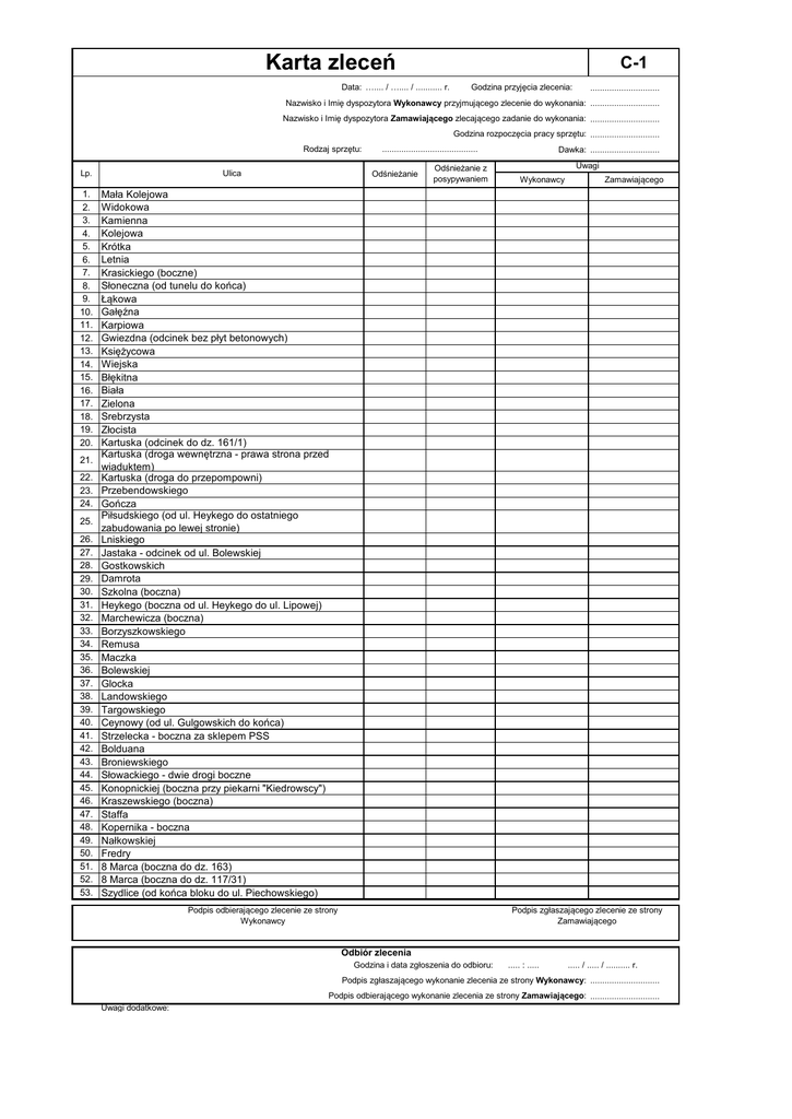 Karta zleceń C-1 Data: ….... / ….... / ........... r. Godzina przyjęcia zlecenia: ............................. Nazwisko i Imię dyspozytora Wykonawcy przyjmującego zlecenie do wykonania: ............................. Nazwisko i Imię dyspozytora Zamawiającego zlecającego zadanie do wykonania: ............................. Godzina rozpoczęcia pracy sprzętu: ............................. Rodzaj sprzętu: Lp. 1. 2. 3. 4. 5. 6. 7. 8. 9. 10. 11. 12. 13. 14. 15. 16. 17. 18. 19. 20. 21. 22. 23. 24. 25. 26. 27. 28. 29. 30. 31. 32. 33. 34. 35. 36. 37. 38. 39. 40. 41. 42. 43. 44. 45. 46. 47. 48. 49. 50. 51. 52. 53. ........................................ Odśnieżanie Ulica Odśnieżanie z posypywaniem Dawka: ............................. Uwagi Wykonawcy Zamawiającego Mała Kolejowa Widokowa Kamienna Kolejowa Krótka Letnia Krasickiego (boczne) Słoneczna (od tunelu do końca) Łąkowa Gałęźna Karpiowa Gwiezdna (odcinek bez płyt betonowych) Księżycowa Wiejska Błękitna Biała Zielona Srebrzysta Złocista Kartuska (odcinek do dz. 161/1) Kartuska (droga wewnętrzna - prawa strona przed wiaduktem) Kartuska (droga do przepompowni) Przebendowskiego Gończa Piłsudskiego (od ul. Heykego do ostatniego zabudowania po lewej stronie) Lniskiego Jastaka - odcinek od ul. Bolewskiej Gostkowskich Damrota Szkolna (boczna) Heykego (boczna od ul. Heykego do ul. Lipowej) Marchewicza (boczna) Borzyszkowskiego Remusa Maczka Bolewskiej Glocka Landowskiego Targowskiego Ceynowy (od ul. Gulgowskich do końca) Strzelecka - boczna za sklepem PSS Bolduana Broniewskiego Słowackiego - dwie drogi boczne Konopnickiej (boczna przy piekarni "Kiedrowscy") Kraszewskiego (boczna) Staffa Kopernika - boczna Nałkowskiej Fredry 8 Marca (boczna do dz. 163) 8 Marca (boczna do dz. 117/31) Szydlice (od końca bloku do ul. Piechowskiego) Podpis odbierającego zlecenie ze strony Wykonawcy Podpis zgłaszającego zlecenie ze strony Zamawiającego Odbiór zlecenia Godzina i data zgłoszenia do odbioru: ..... : ..... ..... / ..... / .......... r. Podpis zgłaszającego wykonanie zlecenia ze strony Wykonawcy: ............................. Podpis odbierającego wykonanie zlecenia ze strony Zamawiającego: ............................. Uwagi dodatkowe: Karta zleceń C-2 Data: ….... / ….... / .......... r. Godzina przyjęcia zlecenia: ............................. Nazwisko i Imię dyspozytora Wykonawcy przyjmującego zlecenie do wykonania: ............................. Nazwisko i Imię dyspozytora Zamawiającego zlecającego zadanie do wykonania: ............................. Godzina rozpoczęcia pracy sprzętu: ............................. Rodzaj sprzętu: Lp. ........................................ Odśnieżanie Ulica Odśnieżanie z posypywaniem Dawka: ............................. Uwagi Wykonawcy Zamawiającego Skłodowskiej - boczna do przepompowni Kalinowa Konwaliowa - bez utwardzonych odcinków drogi Malinowa Jeżynowa Żurawinowa - bez utwardzonego odcinka drogi Powojowa Poziomkowa Zawilcowa Lawendowa (dwa odcinki drogi) Jaśminowa Sasankowa Fiołkowa (obie odnogi) Wrzosowa - bez utwardzonych odcinków drogi Siekierkowskiego Chopina Leśna (gruntowa) Skargi Czapliniec Żurawia Lassa (pierwszy wjazd od ul. Chojnickiej) Lassa (drugi wjazd od ul. Chojnickiej) Chojnicka (boczna do dz. 52/1) Leśne Wzgórze (odcinek drogi od ul. Cegielnia) Łagodna Spokojna Miła Storczykowa Klasztorna - boczna od Wierzyska (od ul. Klasztornej do Wierzysko Gajowa Mała Młyńska - boczna Kapliczna - boczna Markubowo + boczne (drogi nieutwardzone od przepustu 34. ul. Klasztorna - gruntowa) 35. Skarszewska - boczna (naprzeciwko cmentarza) Skarszewska - boczna (od ul. Skarszewskiej do ul. 36. Dworcowej) 1. 2. 3. 4. 5. 6. 7. 8. 9. 10. 11. 12. 13. 14. 15. 16. 17. 18. 19. 20. 21. 22. 23. 24. 25. 26. 27. 28. 29. 30. 31. 32. 33. 37. Wyspiańskiego (od Małachowskiego do końca + odnoga) 38. Plebanka (od firmy transportowejdo granic miasta) Plebanka (lewa strona - naprzeciwko ogródków działkowych) 40. Plebanka (lewa strona - do dz. 149/1) 39. 41. Plebanka (prawa strona - wzdłuż ogródków działkowych) 42. 43. 44. 45. 46. 47. 48. 49. 50. 51. 52. 53. 54. 55. 56. 57. 58. 59 Mostowa Świerkowa Polskiego Czerwonego Krzyża Przemysłowa - łącznik ul. Przemysłowej z ul. Towarową) Michałowicza Dunikowskiego Tatarkiewicza Wnuka Osiedle za lasem Towarowa - boczna od ul. Towarowej do ul. Rolniczej Towarowa - boczna do dz. 12/9 Towarowa - boczna do dz. 214/2 Sobótki Transportowców Rolnicza Jedności Robotniczej Stalowa Miedziana Podpis odbierającego zlecenie ze strony Wykonawcy Podpis zgłaszającego zlecenie ze strony Zamawiającego Odbiór zlecenia Godzina i data zgłoszenia do odbioru: ...... : ...... ..... / ..... / .......... r. Podpis zgłaszającego wykonanie zlecenia ze strony Wykonawcy: ............................. Podpis odbierającego wykonanie zlecenia ze strony Zamawiającego: ............................. Uwagi dodatkowe: