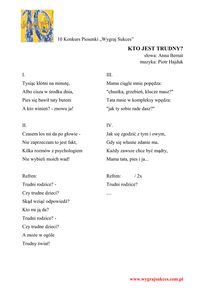 10 Konkurs Piosenki „Wygraj Sukces” KTO JEST TRUDNY? słowa: Anna Bernat muzyka: Piotr Hajduk I. III. Tysiąc kłótni na minutę, Mama ciągle mnie popędza: Albo cisza w środku dnia, "chustka, grzebień, klucze masz?" Pies się bawił taty butem Tata mnie w kompleksy wpędza: A kto winien? - znowu ja! "jak ty sobie rade dasz?" II. IV. Czasem los mi da po głowie - Jak się zgodzić z tym i owym, Nie zaprzeczam to jest fakt, Gdy się własne zdanie ma. Kilka rozmów z psychologiem Każdy zawsze chce być mądry, Nie wybieli moich wad! Mama tata, pies i ja... Refren: Refren: Trudni rodzice? - Trudni rodzice? Czy trudne dzieci? .... / 2x Skąd wziąć odpowiedź? Kto mi ją da? Trudni rodzice? Czy trudne dzieci? A może w ogóle Trudny świat! www.wygrajsukces.com.pl