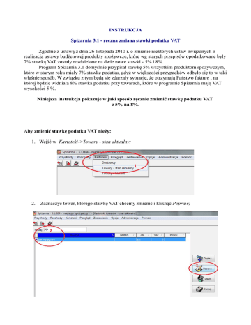 INSTRUKCJA Spiżarnia 3.1 - ręczna zmiana stawki podatku VAT Zgodnie z ustawą z dnia 26 listopada 2010 r. o zmianie niektórych ustaw związanych z realizacją ustawy budżetowej produkty spożywcze, które wg starych przepisów opodatkowane były 7% stawką VAT zostały rozdzielone na dwie nowe stawki - 5% i 8%. Program Spiżarnia 3.1 domyślnie przypisał stawkę 5% wszystkim produktom spożywczym, które w starym roku miały 7% stawkę podatku, gdyż w większości przypadków odbyło się to w taki właśnie sposób. W związku z tym będą się zdarzały sytuacje, że otrzymają Państwo fakturę , na której będzie widniała 8% stawka podatku przy towarach, które w programie Spiżarnia mają VAT wysokości 5 %. Niniejsza instrukcja pokazuje w jaki sposób ręcznie zmienić stawkę podatku VAT z 5% na 8%. Aby zmienić stawkę podatku VAT nleży: 1. Wejść w Kartoteki->Towary - stan aktualny; 2. Zaznaczyć towar, którego stawkę VAT chcemy zmienić i kliknąć Popraw; 3. Z listy rozwijalnej wybrać stawkę 8%; 4. Kliknąć Zapisz. Stawka VAT została zmieniona. Można teraz zaznaczyć kolejny towar i zmienić jego stawkę postępując według powyższego opisu lub kliknąć przycisk Wyjdź. Jeśli poprawiamy więcej niż jedną kartotekę, wówczas najpierw zmieniamy stawki wszystkich poprawianych kartotek, a dopiero później przechodzimy dalej. Powyższe czynność zmieniły stawkę podatku VAT kartoteki, jednak wartość netto w przychodach, rozchodach i na magazynie pozostała niezmianiona. Aby ją zmienić na odpowiednią do nowej stawki VAT należy wykonać następujące czynności: 1. Z górnego menu wybieramy Administracja->Autokontrola danych; 2. W nowo otwartym oknie klikamy Popraw wartości netto; 3. Czekamy aż pojawi się komunikat Poprawiono i klikamy OK; 4. Klikamy Wyjdź.