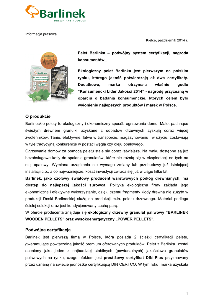 Informacja prasowa Kielce, październik 2014 r. Pelet Barlinka – podwójny system certyfikacji, nagroda konsumentów. Ekologiczny pelet Barlinka jest pierwszym na polskim rynku, którego jakość potwierdzają aż dwa certyfikaty. Dodatkowo, marka otrzymała właśnie godło “Konsumencki Lider Jakości 2014” - nagrodę przyznaną w oparciu o badania konsumenckie, których celem było wyłonienie najlepszych produktów i marek w Polsce. O produkcie Barlineckie pelety to ekologiczny i ekonomiczny sposób ogrzewania domu. Małe, pachnące świeżym drewnem granulki uzyskane z odpadów drzewnych zyskują coraz więcej zwolenników. Tanie, efektywne, łatwe w transporcie, magazynowaniu i w użyciu, zostawiają w tyle tradycyjną konkurencję w postaci węgla czy oleju opałowego. Ogrzewanie domów za pomocą peletu staje się coraz łatwiejsze. Na rynku dostępne są już bezobsługowe kotły do spalania granulatów, które nie różnią się w eksploatacji od tych na olej opałowy. Wymiana urządzenia nie wymaga zmiany lub przebudowy już istniejącej instalacji c.o., a co najważniejsze, koszt inwestycji zwraca się już w ciągu kilku lat. Barlinek, jako czołowy światowy producent warstwowych podłóg drewnianych, ma dostęp do najlepszej jakości surowca. Polityka ekologiczna firmy zakłada jego ekonomiczne i efektywne wykorzystanie, dzięki czemu fragmenty kłody drewna nie zużyte w produkcji Deski Barlineckiej służą do produkcji m.in. peletu drzewnego. Materiał podlega ścisłej selekcji oraz jest kondycjonowany suchą parą. W ofercie producenta znajduje się ekologiczny drzewny granulat paliwowy “BARLINEK WOODEN PELLETS” oraz wysokoenergetyczny „POWER PELLETS”. Podwójna certyfikacja Barlinek jest pierwszą firmą w Polsce, która posiada 2 ścieżki certyfikacji peletu, gwarantujące powtarzalną jakość premium oferowanych produktów. Pelet z Barlinka został oceniony jako jeden z najbardziej stabilnych (powtarzalnych) jakościowo granulatów paliwowych na rynku, czego efektem jest prestiżowy certyfikat DIN Plus przyznawany przez uznaną na świecie jednostkę certyfikującą DIN CERTCO. W tym roku marka uzyskała 1 również certyfikat ENplus A1, który stawia pelet Barlinka najwyżej w rankingu jakościowym peletów drzewnych dostępnych na rynku europejskim. Złote godło “Konsumencki Lider Jakości 2014” Głosami respondentów ekologicznemu i efektywnemu drzewnemu granulatowi paliwowemu “Barlinek wooden pellets” przyznane zostało złote godło “Konsumencki Lider Jakości 2014“. To kolejna nagroda dla peletu Barlinka, który do tej pory otrzymał m.in. nagrody „Akcent 2013” w konkursie portalu e-petrol.pl oraz „Płomień Roku” przyznaną przez magazyn Świat Kominków. Konsumencki Lider Jakości 2014 to ogólnopolski, promocyjny program konsumencki, realizowany przez Redakcję Strefy Gospodarki - ogólnopolskiego, niezależnego dodatku dystrybuowanego wraz Dziennikiem Gazetą Prawną. Prace związaniem z przygotowaniem i realizacją badań powierzone zostały najbardziej prestiżowej uczelni w Polsce - Uniwersytetowi Jagiellońskiemu w Krakowie. Próba badawcza w tej edycji konkursu wyniosła aż 9499 respondentów, których opinie były weryfikowane w badaniach terenowych oraz internetowych. Więcej informacji: www.barlinekpellets.com Dodatkowych informacji udziela: Karolina Bałaban Tel.: 504 099 936 E-mail: [email protected] BARLINEK S.A. to największy i najbardziej znany polski producent podłóg drewnianych. Firma odnosi znaczące sukcesy na całym świecie - podłogi Barlinka można kupić w 55 krajach na 5 kontynentach. Każda kolekcja łączy w sobie wieloletnie doświadczenie ekspertów firmy, najnowocześniejsze rozwiązania technologiczne oraz znajomość aktualnych trendów. Najważniejszym oferowanym produktem jest deska barlinecka - warstwowa podłoga ze szlachetnych gatunków drewna rodzimego i egzotycznego. Barlinek wytwarza także certyfikowane podłogi do obiektów sportowych, listwy podłogowe oraz paliwa energetyczne: pelet drzewny i brykiet kominkowy. Spółka jest inicjatorem wielu programów dotyczących ochrony środowiska. www.barlinek.com. 2