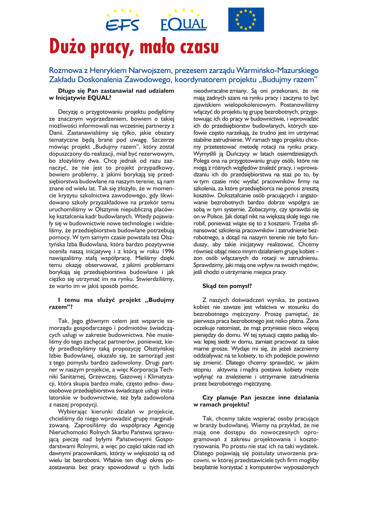 Dużo pracy, mało czasu Rozmowa z Henrykiem Narwojszem, prezesem zarządu Warmińsko-Mazurskiego Zakładu Doskonalenia Zawodowego, koordynatorem projektu „Budujmy razem” Długo się Pan zastanawiał nad udziałem w Inicjatywie EQUAL? Decyzję o przygotowaniu projektu podjęliśmy ze znacznym wyprzedzeniem, bowiem o takiej możliwości informowali nas wcześniej partnerzy z Danii. Zastanawialiśmy się tylko, jakie obszary tematyczne będą brane pod uwagę. Szczerze mówiąc projekt „Budujmy razem”, który został dopuszczony do realizacji, miał być rezerwowym, bo złożyliśmy dwa. Chcę jednak od razu zaznaczyć, że nie jest to projekt przypadkowy, bowiem problemy, z jakimi borykają się przedsiębiorstwa budowlane na naszym terenie, są nam znane od wielu lat. Tak się złożyło, że w momencie kryzysu szkolnictwa zawodowego, gdy likwidowano szkoły przyzakładowe na przekór temu uruchomiliśmy w Olsztynie niepubliczną placówkę kształcenia kadr budowlanych. Wtedy pojawiały się w budownictwie nowe technologie i widzieliśmy, że przedsiębiorstwa budowlane potrzebują pomocy. W tym samym czasie powstała też Olsztyńska Izba Budowlana, która bardzo pozytywnie oceniła naszą inicjatywę i z którą w roku 1996 nawiązaliśmy stałą współpracę. Mieliśmy dzięki temu okazję obserwować, z jakimi problemami borykają się przedsiębiorstwa budowlane i jak ciężko się utrzymać im na rynku. Stwierdziliśmy, że warto im w jakiś sposób pomóc. I temu ma służyć projekt „Budujmy razem”? Tak. Jego głównym celem jest wsparcie samorządu gospodarczego i podmiotów świadczących usługi w zakresie budownictwa. Nie musieliśmy do tego zachęcać partnerów, ponieważ, kiedy przedłożyliśmy taką propozycję Olsztyńskiej Izbie Budowlanej, okazało się, że samorząd jest z tego pomysłu bardzo zadowolony. Drugi partner w naszym projekcie, a więc Korporacja Techniki Sanitarnej, Grzewczej, Gazowej i Klimatyzacji, która skupia bardzo małe, często jedno- dwuosobowe przedsiębiorstwa świadczące usługi instalatorskie w budownictwie, też była zadowolona z naszej propozycji. Wybierając kierunki działań w projekcie, chcieliśmy do niego wprowadzić grupę marginalizowaną. Zaprosiliśmy do współpracy Agencję Nieruchomości Rolnych Skarbu Państwa sprawującą pieczę nad byłymi Państwowymi Gospodarstwami Rolnymi, a więc po części także nad ich dawnymi pracownikami, którzy w większości są od wielu lat bezrobotni. Właśnie ten długi okres pozostawania bez pracy spowodował u tych ludzi nieodwracalne zmiany. Są oni przekonani, że nie mają żadnych szans na rynku pracy i zaczyna to być zjawiskiem wielopokoleniowym. Postanowiliśmy włączyć do projektu tę grupę bezrobotnych, przygotowując ich do pracy w budownictwie, i wprowadzić ich do przedsiębiorstw budowlanych, których szefowie często narzekają, że trudno jest im utrzymać stabilne zatrudnienie. W ramach tego projektu chcemy przetestować metodę rotacji na rynku pracy. Wymyślili ją Duńczycy w latach osiemdziesiątych. Polega ona na przygotowaniu grupy osób, które nie mogą z różnych względów znaleźć pracy, i wprowadzaniu ich do przedsiębiorstwa na staż po to, by w tym czasie móc wysłać pracowników firmy na szkolenia, za które przedsiębiorca nie ponosi zresztą kosztów. Dokształcanie osób pracujących i angażowanie bezrobotnych bardzo dobrze współgra ze sobą w tym systemie. Zobaczymy, czy sprawdzi się on w Polsce. Jak dotąd nikt na większą skalę tego nie robił, ponieważ wiąże się to z kosztami. Trzeba sfinansować szkolenia pracowników i zatrudnienie bezrobotnego, a dotąd na naszym terenie nie było funduszy, aby takie inicjatywy realizować. Chcemy również objąć nieco innym działaniem grupę kobiet – żon osób włączanych do rotacji w zatrudnieniu. Sprawdzimy, jaki mają one wpływ na swoich mężów, jeśli chodzi o utrzymanie miejsca pracy. Skąd ten pomysł? Z naszych doświadczeń wynika, że postawa kobiet nie zawsze jest właściwa w stosunku do bezrobotnego mężczyzny. Proszę pamiętać, że pierwsza praca bezrobotnego jest nisko płatna. Żona oczekuje natomiast, że mąż przyniesie nieco więcej pieniędzy do domu. W tej sytuacji często padają słowa: lepiej siedź w domu, zamiast pracować za takie marne grosze. Wydaje mi się, że jeżeli zaczniemy oddziaływać na te kobiety, to ich podejście powinno się zmienić. Dlatego chcemy sprawdzić, w jakim stopniu aktywna i mądra postawa kobiety może wpłynąć na znalezienie i utrzymanie zatrudnienia przez bezrobotnego mężczyznę. Czy planuje Pan jeszcze inne działania w ramach projektu? Tak, chcemy także wspierać osoby pracujące w branży budowlanej. Wiemy na przykład, że nie mają one dostępu do nowoczesnych oprogramowań z zakresu projektowania i kosztorysowania. Po prostu nie stać ich na taki wydatek. Dlatego pojawiają się postulaty utworzenia pracowni, w której przedstawiciele tych firm mogliby bezpłatnie korzystać z komputerów wyposażonych w takie oprogramowania, przynajmniej przez czas trwania projektu. Wpisaliśmy ten punkt do harmonogramu naszych prac. Jest też jeszcze jeden problem, nad którym się zastanawiamy, a mianowicie, czy pracownicy powyżej 50 lat zechcą dzisiaj zadbać o swoją edukację po to, żeby zabezpieczyć się przed zwolnieniem. Zbadamy to. Rozpoczyna się Działanie 2. Co planujecie państwo na najbliższych kilka miesięcy? Najpierw przeprowadzimy rekrutację wśród osób bezrobotnych ze środowisk popegeerowskich, aby jesienią przygotować je do rotacji w zatrudnieniu. Równocześnie zbadamy, przedstawicieli których zawodów byłyby skłonne przyjąć przedsiębiorstwa budowlane do siebie na staże. Jeśli chodzi o bezrobotnych, to chcielibyśmy objąć naszym projektem około 80 osób, choć oczekiwania samorządów zawodowych są większe. Jesteśmy jednak ostrożni, bo wiadomo, że nie zawsze deklaracje