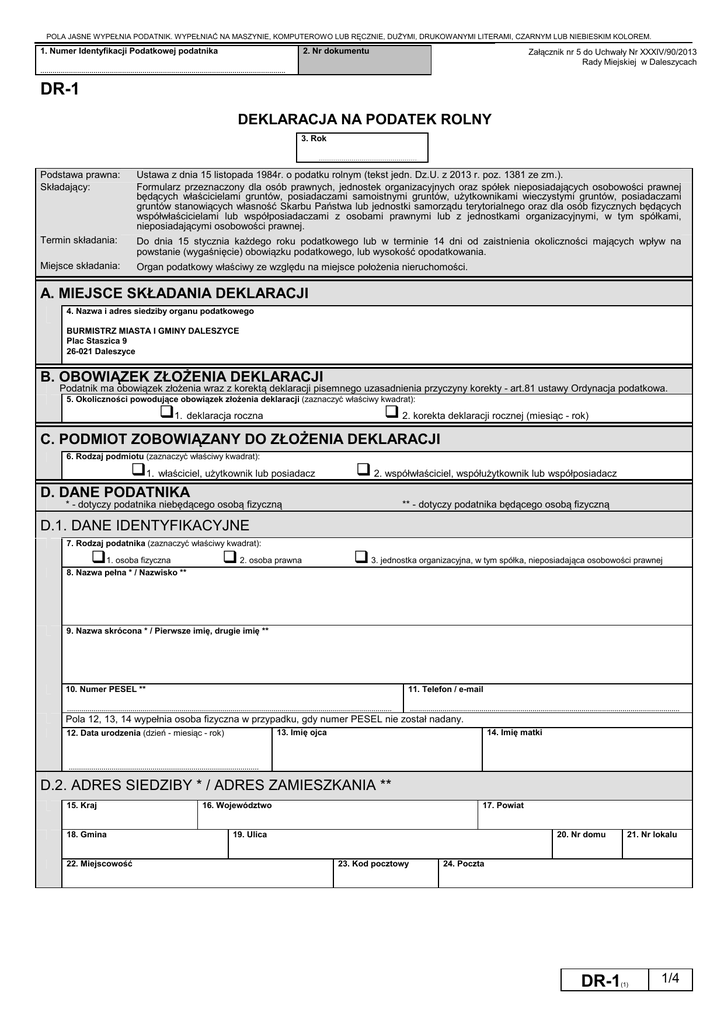 POLA JASNE WYPEŁNIA PODATNIK. WYPEŁNIAĆ NA MASZYNIE, KOMPUTEROWO LUB RĘCZNIE, DUŻYMI, DRUKOWANYMI LITERAMI, CZARNYM LUB NIEBIESKIM KOLOREM. 1. Numer Identyfikacji Podatkowej podatnika 2. Nr dokumentu Załącznik nr 5 do Uchwały Nr XXXIV/90/2013 Rady Miejskiej w Daleszycach ………………………………………………………………………………………………………… DR-1 DEKLARACJA NA PODATEK ROLNY 3. Rok ………………………………………… Podstawa prawna: Składający: Ustawa z dnia 15 listopada 1984r. o podatku rolnym (tekst jedn. Dz.U. z 2013 r. poz. 1381 ze zm.). Formularz przeznaczony dla osób prawnych, jednostek organizacyjnych oraz spółek nieposiadających osobowości prawnej będących właścicielami gruntów, posiadaczami samoistnymi gruntów, użytkownikami wieczystymi gruntów, posiadaczami gruntów stanowiących własność Skarbu Państwa lub jednostki samorządu terytorialnego oraz dla osób fizycznych będących współwłaścicielami lub współposiadaczami z osobami prawnymi lub z jednostkami organizacyjnymi, w tym spółkami, nieposiadającymi osobowości prawnej. Termin składania: Do dnia 15 stycznia każdego roku podatkowego lub w terminie 14 dni od zaistnienia okoliczności mających wpływ na powstanie (wygaśnięcie) obowiązku podatkowego, lub wysokość opodatkowania. Miejsce składania: Organ podatkowy właściwy ze względu na miejsce położenia nieruchomości. A. MIEJSCE SKŁADANIA DEKLARACJI 4. Nazwa i adres siedziby organu podatkowego BURMISTRZ MIASTA I GMINY DALESZYCE Plac Staszica 9 26-021 Daleszyce B. OBOWIĄZEK ZŁOŻENIA DEKLARACJI Podatnik ma obowiązek złożenia wraz z korektą deklaracji pisemnego uzasadnienia przyczyny korekty - art.81 ustawy Ordynacja podatkowa. 5. Okoliczności powodujące obowiązek złożenia deklaracji (zaznaczyć właściwy kwadrat): 1. deklaracja roczna 2. korekta deklaracji rocznej (miesiąc - rok) C. PODMIOT ZOBOWIĄZANY DO ZŁOŻENIA DEKLARACJI 6. Rodzaj podmiotu (zaznaczyć właściwy kwadrat): 1. właściciel, użytkownik lub posiadacz 2. współwłaściciel, współużytkownik lub współposiadacz D. DANE PODATNIKA * - dotyczy podatnika niebędącego osobą fizyczną ** - dotyczy podatnika będącego osobą fizyczną D.1. DANE IDENTYFIKACYJNE 7. Rodzaj podatnika (zaznaczyć właściwy kwadrat): 1. osoba fizyczna 8. Nazwa pełna * / Nazwisko ** 2. osoba prawna 3. jednostka organizacyjna, w tym spółka, nieposiadająca osobowości prawnej 9. Nazwa skrócona * / Pierwsze imię, drugie imię ** 10. Numer PESEL ** 11. Telefon / e-mail …………………………………………………………………………………………………………………………………………… …………………………………………………………………………………………………………………… Pola 12, 13, 14 wypełnia osoba fizyczna w przypadku, gdy numer PESEL nie został nadany. 13. Imię ojca 12. Data urodzenia (dzień - miesiąc - rok) 14. Imię matki ………………………………………………………………………………… D.2. ADRES SIEDZIBY * / ADRES ZAMIESZKANIA ** 15. Kraj 18. Gmina 22. Miejscowość 16. Województwo 17. Powiat 19. Ulica 20. Nr domu 23. Kod pocztowy 21. Nr lokalu 24. Poczta DR-1 (1) 1/4 POLA JASNE WYPEŁNIA PODATNIK. WYPEŁNIAĆ NA MASZYNIE, KOMPUTEROWO LUB RĘCZNIE, DUŻYMI, DRUKOWANYMI LITERAMI, CZARNYM LUB NIEBIESKIM KOLOREM. E. DANE DOTYCZĄCE UŻYTKÓW ROLNYCH STANOWIĄCYCH GOSPODARSTWO ROLNE – NIEPODLEGAJĄCYCH ZWOLNIENIU E.1. GRUNTY ORNE Klasa Powierzchnia w ha Przelicznik a b 25. Powierzchnia w ha przeliczeniowych 1) c 26. I , 27. , 28. II , 29. , 30. IIIa , 31. , 32. IIIb , 33. , 34. IVa , 35. , 36. IVb , , E.2. ŁĄKI I PASTWISKA 37. 38. I , 39. , 40. II , 41. , 42. III , 43. , 44. IV , , E.3. SADY 45. 46. I , 47. , 48. II , 49. III IIIa , 50. , 51. , 52. IIIb , 53. IV IVa , 54. , 55. , 56. IVb , , E.4. GRUNTY POD STAWAMI NIEZARYBIONYMI - grunty orne 57. 58. I , 59. , 60. II , 61. , 62. IIIa , 63. , 64. IIIb , 65. , 66. IVa , 67. IVb , DR-1 (1) , 68. 2/4 , POLA JASNE WYPEŁNIA PODATNIK. WYPEŁNIAĆ NA MASZYNIE, KOMPUTEROWO LUB RĘCZNIE, DUŻYMI, DRUKOWANYMI LITERAMI, CZARNYM LUB NIEBIESKIM KOLOREM. E.5. GRUNTY POD STAWAMI NIEZARYBIONYMI - łąki i pastwiska Powierzchnia w ha 1) Klasa 69. I Powierzchnia w ha przeliczeniowych 1) Przelicznik 70. , 71. II , 72. , 73. III , 74. , 75. IV , 76. , , E.6. GRUNTY ROLNE ZABUDOWANE - grunty orne 77. I 78. , 79. II , 80. , 81. IIIa , 82. , 83. IIIb , 84. , 85. IVa , 86. , 87. IVb , 88. , , E.7. GRUNTY ROLNE ZABUDOWANE - łąki i pastwiska 89. I 90. , 91. II , 92. , 93. III , 94. , 95. IV , 96. , , E.8. ROWY - grunty orne 97. I 98. , 99. II , 100. , 101. IIIa , 102. , 103. IIIb , 104. , 105. IVa , 106. , 107. IVb , 108. , , E.9. ROWY - łąki i pastwiska 109. I 110. , 111. II , 113. III , 114. , 115. IV , 112. , 116. , , DR-1 (1) 3/4 POLA JASNE WYPEŁNIA PODATNIK. WYPEŁNIAĆ NA MASZYNIE, KOMPUTEROWO LUB RĘCZNIE, DUŻYMI, DRUKOWANYMI LITERAMI, CZARNYM LUB NIEBIESKIM KOLOREM. E.10. UŻYTKI ROLNE (ROWY, GRUNTY POD STAWAMI NIEZARYBIONYMI) BEZ OZNACZENIA KLASY GLEBOZNAWCZEJ 117. Powierzchnia w ha , E.11. GRUNTY POD STAWAMI ZARYBIONYMI - łososiem, trocią, głowacicą, palią i pstrągiem Powierzchnia w ha 1) Powierzchnia w ha przeliczeniowych 1) Przelicznik 118. 1,0 , E12. GRUNTY POD STAWAMI ZARYBIONYMI - inne gatunki ryb 119. 120. 0,20 , , E13. ŁĄCZNA POWIERZCHNIA UŻYTKÓW ROLNYCH STANOWIĄCYCH GOSPODARSTWO ROLNE 121.Powierzchnia w ha (suma z części od E.1 do E.12 kol.a) 122. Powierzchnia w ha przeliczeniowych (suma z części od E.1 do E.12 kol.c) , , F. ŁĄCZNA KWOTA PODATKU OD GOSPODARSTW ROLNYCH Łącznie powierzchnia w ha przeliczeniowych 123. Należy wpisać powierzchnię z poz.122. Stawka podatku 124. Kwota podatku (w pełnych złotych) *)***) 125. , zł, gr zł G. DANE DOTYCZĄCE UŻYTKÓW ROLNYCH NIESTANOWIĄCYCH GOSPODARSTW ROLNYCH NI
