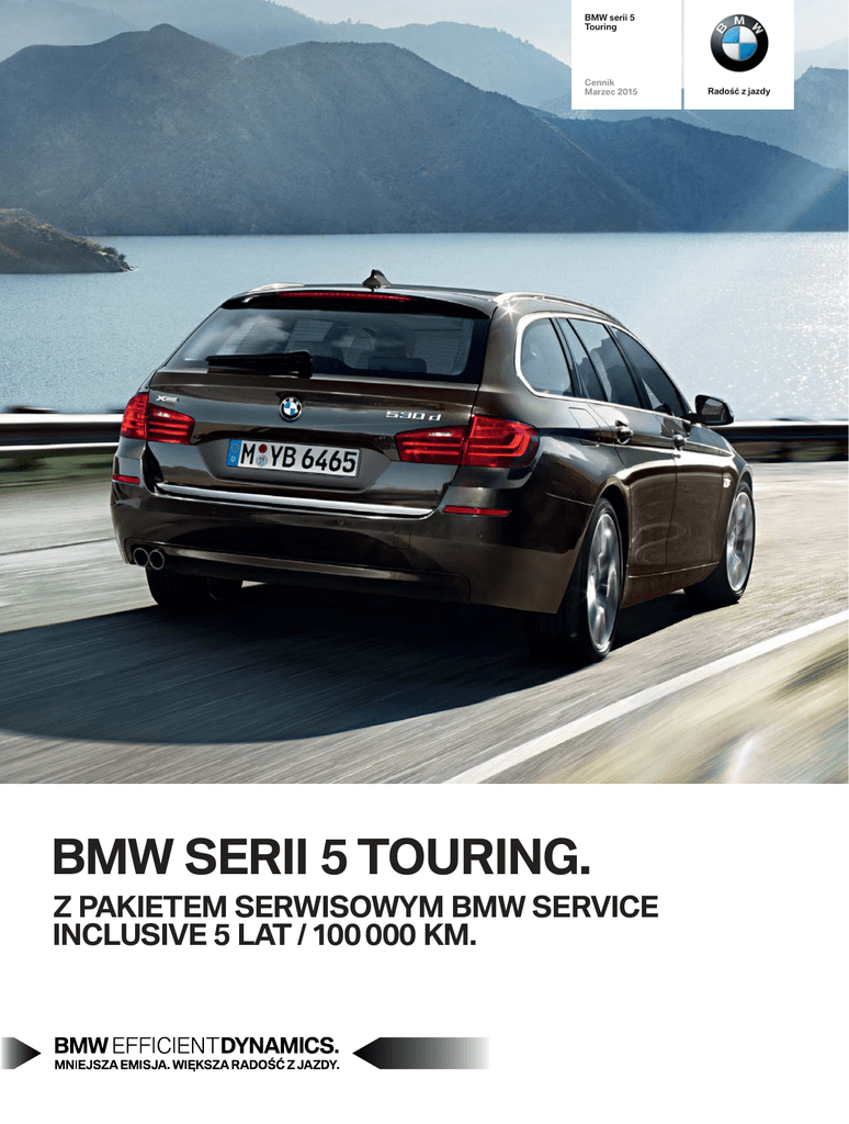 BMW serii Touring Cennik Marzec BMW SERII TOURING. Z PAKIETEM SERWISOWYM BMW SERVICE INCLUSIVE LAT / KM. Radość z jazdy Spis treści Ceny BMW serii 5 Touring . . . . . . . . . . . . . . . . . . . . . . . . . . . . . . . . . . . . 3 Wyposażenie standardowe . . . . . . . . . . . . . . . . . . . . . . . . . . . . . . . . . . . 4 Wyposażenie dodatkowe . . . . . . . . . . . . . . . . . . . . . . . . . . . . . . . . . . . . 8 Bezpieczeństwo 8 Lakier 8 Stylistyka zewnętrzna 9 Pakiety wyposażenia dodatkowego 9 Koła / opony 12 Tapicerki 13 Stylistyka wnętrza 15 Zawieszenie / układ jezdny 17 Skrzynia biegów 17 Systemy asystujące 18 Światła i oświetlenie 19 Fotele / komfort siedzeń Kierownice Kontrola klimatu Funkcjonalne wyposażenie zewnętrzne i wewnętrzne Radio / nawigacja Komunikacja oraz informacja Systemy HiFi oraz zestawy rozrywki Serwis Kontrola wewnętrzna 20 21 21 22 23 23 24 24 24 BMW ConnectedDrive . . . . . . . . . . . . . . . . . . . . . . . . . . . . . . . . . . . . . . 25 BMW Service Inclusive . . . . . . . . . . . . . . . . . . . . . . . . . . . . . . . . . . . . . 26 BMW Financial Services . . . . . . . . . . . . . . . . . . . . . . . . . . . . . . . . . . . . 27 2 wyposażenie standardowe wyposażenie dodatkowe za dopłatą Ceny BMW serii 5 Touring Model Układ skrzyni biegów Silnik Moc Układ /cylindry Pojemność Zużycie paliwa wg normy ECE cm3 kW (KM) cykl miejski cykl pozamiejski cykl mieszany l / 100km Emisja CO2 Cena netto (bez VAT) Cena brutto g/km w PLN w PLN* 520i 6-man R4 / 1997 135 (184) 8,9 / 5,5 / 6,7 157 157 155 193 300 528i 6-man R4 / 1997 180 (245) 9,3 / 5,6 / 7,0 162 173 415 213 300 528i xDrive 8-aut R4 / 1997 180 (245) 8,9 / 5,5 / 6,7 157 189 675 233 300 535i 6-man R6 / 2979 225 (306) 11,2 / 6,3 / 8,1 188 209 024 257 100 535i xDrive 8-aut R6 / 2979 225 (306) 11,1 / 6,3 / 8,1 188 229 187 281 900 550i 8-aut V8 / 4395 330 (450) 12,3 / 6,9 / 8,8 206 288 780 355 200 518d 6-man R4 / 1995 110 (150) 5,6 / 4,1 / 4,7 122 153 903 189 300 520d 6-man R4 / 1995 140 (190) 5,5 / 4,1 / 4,6 122 162 033 199 300 520d xDrive 8-aut R4 / 1995 140 (190) 6,1 / 4,5 / 4,8 127 178 293 219 300 525d 6-man R4 / 1995 160 (218) 6,2 / 4,6 / 5,2 136 181 220 222 900 525d xDrive 8-aut R4 / 1995 160 (218) 6,2 / 4,9 / 5,4 142 197 480 242 900 530d 8-aut R6 / 2993 190 (258) 6,2 / 4,7 / 5,3 139 213 026 262 022 530d xDrive 8-aut R6 / 2993 190 (258) 6,7 / 5,1 / 5,7 149 224 390 276 000 535d 8-aut R6 / 2993 230 (313) 6,5 / 4,9 / 5,5 144 229 024 281 700 535d xDrive 8-aut R6 / 2993 230 (313) 7,1 / 5,2 / 5,9 154 240 162 295 400 M550d xDrive 8-aut R6 / 2993 280 (381) 7,7 / 5,5 / 6,3 166 317 479 390 500 Data wydania cennika: 01.03.2015. * Powyższe ceny zawierają pakiet serwisowy BMW Service Inclusive 5 lat / 100 000 km pokrywający koszty serwisowania samochodu oraz przeglądów, wliczając w to oryginalne części BMW, olej oraz robociznę. Pakiet obejmuje następujące czynności: wymiana oleju (bez uzupełniania), serwis/wymiana filtra powietrza, filtra przeciwpyłkowego, świec zapłonowych, płynu hamulcowego, konrola pojazdu i przegląd standardowy zgodnie z książką serwisową. Więciej informacji na temat BMW Service Inclusive oraz dodatkowych pakietów znajdą Państwo u Dealera BMW. W przypadku rezygnacji z pakietu cena samochodu będzie niższa o 1 682 PLN brutto dla modeli z silnikiem 4-cylindrowym, 2 076 PLN brutto dla modeli z silnikiem 6-cylindrowym, 2 556 PLN brutto dla modeli z silnikiem 8-cylindrowym oraz o 2 769 PLN brutto dla M550d xDrive. Podane ceny są zalecanymi cenami detalicznymi, zawierającymi podatek VAT oraz podatek akcyzowy. Zalecane ceny detaliczne dotyczące wyposażenia dodatkowego są ważne jedynie, jeśli wyposażenie to zostanie zamówione jednocześnie z danym modelem pojazdu. Podane ceny samochodów obowiązują dla modeli w kolorach podstawowych, a lakiery metalizowane są dostępne za dopłatą. Powyższe ceny mogą ulec zmianom bez uprzedzenia w zależności od zmiany cen wprowadzonych przez producenta, jak również zmian w podatkach, opłatach i przepisach celnych. Przedstawione informacje są aktualne w chwili ukazania się niniejszej publikacji. BMW Vertriebs GmbH zastrzega sobie prawo do zmian w ofercie w każdej chwili i to zarówno w zakresie oferowanych modeli jak i ich budowy oraz wyposażenia. Niniejszy cennik nie stanowi oferty w rozumieniu prawa i publikowany jest jedynie dla celów informacyjnych bez żadnej odpowiedzialności. Informacji dotyczących dostępności prezentowanych modeli i wyposażenia, jak również aktualnych cen detalicznych prosimy zasięgnąć u Dealera BMW. 3 520i 528i 528i xDrive 535i 535i xDrive 550i 518d 520d 520d xDrive 525d 525d xDrive 530d 530d xDrive 535d 535d xDrive M550d xDrive Wyposażenie standardowe Pakiet serwisowy BMW Service Inclusive Pakiet serwisowy BMW Service Inclusive 5 lat / 100 000 km, pokrywa koszty serwisowania oraz robociznę Bezpieczeństwo Poduszki powietrzne dla kierowcy i pasażera System zapobiegający blokowaniu się kół podczas hamowania (ABS) Asystent hamowania Czujnik kolizji Dwutonowy klakson Układ dynamicznej kontroli stabilności (DSC) Poduszki powietrzne chroniące głowę z przodu i z tyłu Boczne poduszki powietrzne dla kierowcy i pasażera z przodu Czujnik ciśnienia powietrza w oponach Wzmocnienia boczne Trójkąt ostrzegawczy i apteczka Lakier i stylistyka zewnętrzna Lakier niemetalizowany Lusterka zewnętrzne w kolorze karoserii Elementy zewnętrzne w kolorze karoserii Chromowane obramowania szyb Oznaczenie modelu Dolna obudowa lusterka w kolorze czarnym matowym Białe lampy kierunkowskazów Koła / opony Opony z funkcją jazdy awaryjnej Runflat Obręcze kół ze stopu lekkiego V Spoke 236, 17 cali Obręcze kół ze stopu lekkiego V Spoke 328, 18 cali Obręcze kół ze stopu lekkiego Double Spoke 351 M, 19 cali Śruby zabezpieczające przed kradzieżą Pakiety wyposażenia dodatkowego Pakiet Sportowy M Tapicerka i stylistyka wnętrza Tkanina Diagonal Listwy ozdobne