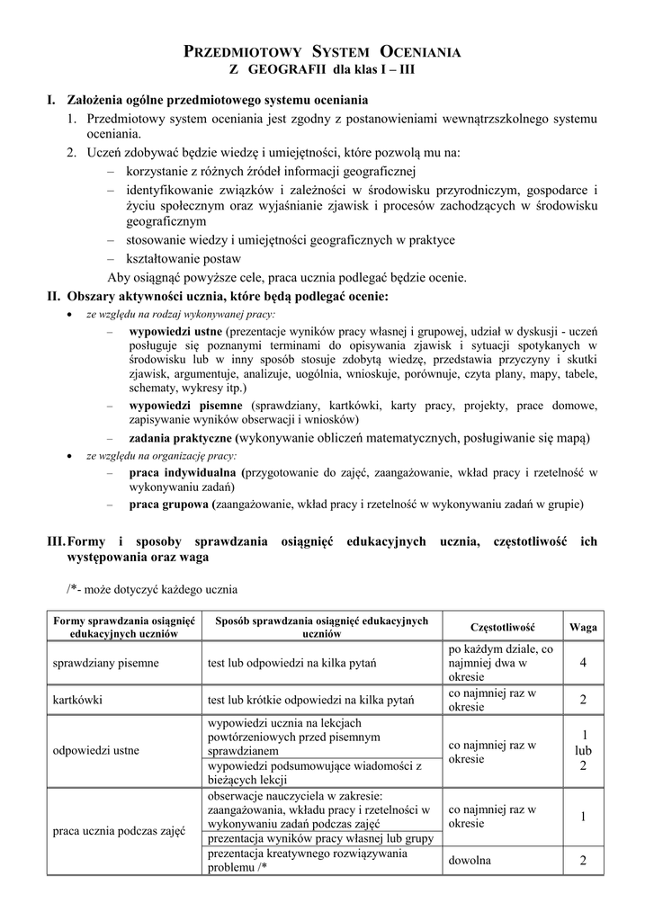 PRZEDMIOTOWY SYSTEM OCENIANIA Z GEOGRAFII dla klas I – III I. Założenia ogólne przedmiotowego systemu oceniania 1. Przedmiotowy system oceniania jest zgodny z postanowieniami wewnątrzszkolnego systemu oceniania. 2. Uczeń zdobywać będzie wiedzę i umiejętności, które pozwolą mu na: – korzystanie z różnych źródeł informacji geograficznej – identyfikowanie związków i zależności w środowisku przyrodniczym, gospodarce i życiu społecznym oraz wyjaśnianie zjawisk i procesów zachodzących w środowisku geograficznym – stosowanie wiedzy i umiejętności geograficznych w praktyce – kształtowanie postaw Aby osiągnąć powyższe cele, praca ucznia podlegać będzie ocenie. II. Obszary aktywności ucznia, które będą podlegać ocenie: ze względu na rodzaj wykonywanej pracy: – – – wypowiedzi ustne (prezentacje wyników pracy własnej i grupowej, udział w dyskusji - uczeń posługuje się poznanymi terminami do opisywania zjawisk i sytuacji spotykanych w środowisku lub w inny sposób stosuje zdobytą wiedzę, przedstawia przyczyny i skutki zjawisk, argumentuje, analizuje, uogólnia, wnioskuje, porównuje, czyta plany, mapy, tabele, schematy, wykresy itp.) wypowiedzi pisemne (sprawdziany, kartkówki, karty pracy, projekty, prace domowe, zapisywanie wyników obserwacji i wniosków) zadania praktyczne (wykonywanie obliczeń matematycznych, posługiwanie się mapą) ze względu na organizację pracy: – – praca indywidualna (przygotowanie do zajęć, zaangażowanie, wkład pracy i rzetelność w wykonywaniu zadań) praca grupowa (zaangażowanie, wkład pracy i rzetelność w wykonywaniu zadań w grupie) III.Formy i sposoby sprawdzania osiągnięć występowania oraz waga edukacyjnych ucznia, częstotliwość ich /*- może dotyczyć każdego ucznia Formy sprawdzania osiągnięć edukacyjnych uczniów Sposób sprawdzania osiągnięć edukacyjnych uczniów sprawdziany pisemne test lub odpowiedzi na kilka pytań kartkówki test lub krótkie odpowiedzi na kilka pytań odpowiedzi ustne praca ucznia podczas zajęć wypowiedzi ucznia na lekcjach powtórzeniowych przed pisemnym sprawdzianem wypowiedzi podsumowujące wiadomości z bieżących lekcji obserwacje nauczyciela w zakresie: zaangażowania, wkładu pracy i rzetelności w wykonywaniu zadań podczas zajęć prezentacja wyników pracy własnej lub grupy prezentacja kreatywnego rozwiązywania problemu /* Częstotliwość po każdym dziale, co najmniej dwa w okresie co najmniej raz w okresie Waga 4 2 co najmniej raz w okresie 1 lub 2 co najmniej raz w okresie 1 dowolna 2 prace domowe dla wszystkich dla chętnych /* prowadzenie zeszytów przedmiotowych zadania o charakterze praktycznym wypowiedzi pisemne w zeszytach: przedmiotowym lub ćwiczeń wypowiedzi pisemne w zeszytach: przedmiotowym i ćwiczeń (wskazane przez nauczyciela lub ucznia) estetyka, kompletność i poprawność zapisów tematów i notatek z lekcji wykonywanie zadań - obliczeń matematycznych stosowanych w geografii; czytanie i graficzna interpretacja danych liczbowych praca ucznia z mapą po wybranych lekcjach 1 lub 2 co najmniej raz w roku 1 co najmniej raz w roku 1 lub 2 projekty edukacyjne prezentacja efektów pracy (przede wszystkim wartość merytoryczna prezentowanej pracy) 3 szczególne osiągnięcia ucznia /* co najmniej raz na danym etapie edukacyjnym pozaszkolne wyniki w konkursach geograficznych dowolna 4 III. Poprawa ocen bieżących i inne postanowienia uczeń może poprawić ocenę ze sprawdzianu, uzgadniając z nauczycielem termin poprawy, wspólny dla wszystkich uczniów danej klasy poprawiających sprawdzian; gdy uczeń przystąpi do poprawy – ocena ze sprawdzianu uzyskana w I terminie otrzymuje wagę 1, natomiast ocena z poprawy – wagę 3 uczeń może poprawić ocenę z kartkówki – tylko niedostateczną, jeśli zakres wiedzy i umiejętności, za które otrzymał taką ocenę nie będą sprawdzane na najbliższej pracy klasowej; w takiej sytuacji – poprawa musi odbyć się następnego dnia w formie pisemnej lub ustnej na prośbę zainteresowanej strony oceny z prac domowych określanych mianem „dla chętnych” są wpisywane do dziennika o ile uczeń wyrazi taką wolę (prace domowe „dla chętnych” to ćwiczenia i zadania służące poszerzeniu wiedzy lub umożliwiające uczniowi prezentowanie nietypowych rozwiązań; uczeń może sam proponować zakres i ilość zadań w porozumieniu z nauczycielem) brak pracy domowej krótkoterminowej i nieprzygotowanie do lekcji uczeń zgłasza nauczycielowi przed rozpoczęciem zajęć – uczeń otrzymuje „minus”; ocenę niedostateczną otrzymuje uczeń, jeśli: - nie zgłosi braku pracy domowej przewidzianej do sprawdzenia przez nauczyciela, - ma na koncie trzy „minusy”, - nie dotrzymał terminu oddania pracy długoterminowej uczeń ma obowiązek przynoszenia na zajęcia kompletu niezbędnych pomocy do nauki; dopuszcza się posiadanie na ławce jednego podręcznika i atlasu dla dwóch uczniów uczeń nieobecny na lekcji jest zobowiązany do uzupełnienia zaległości oraz może prosić nauczyciela o dodatkową pomoc w uzupełnieniu zaległości. IV. Ogólne kryteria oceniania i wymagania na poszczególne oceny: Uczeń otrzymuje ocenę: celującą, gdy: - spełnia wymagania na ocenę bardzo dobrą - samodzielnie i twórczo rozwija własne uzdolnienia i zainteresowania geograficzne, a ich efekty prezentuje w różnych formach - wypowiedzi ucznia są wyczerpujące, bezbłędne, z uwzględnieniem języka przedmiotowego i wskazują na szczególne zainteresowania przedmiotem - dostrzega i kreatywnie rozwiązuje problemy, biegle posługuje się zdobytymi wiadomościami do ich rozwiązywania i proponuje rozwiązania nietypowe bardzo dobrą, gdy: - spełnia wymagania na ocenę dobrą - uczeń sprawnie posługuje się wiedzą, materiałami źródłowymi, poznaną terminologią geograficzną w celu prezentowania informacji geograficznych i rozwiązywania problemów teoretycznyc
