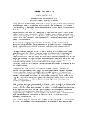 Zmiany - Serge Kahili King I huli i ke ola, e huli i ke ola Żeby zmienić swoje życie, zmień swoje życie. (Hawajskie przysłowie stworzone przeze mnie) Kreacja, jakkolwiek, kiedykolwiek lub jeżeli wogóle się zaczęła, była i jest procesem zmiany. W mitologii, możemy mówić o Pierwszej Fali stworzonej przez łączenie się w pare lub połączenie Wäkea (Chaosu) z Papa(Porządkiem). Ta pierwsza fala dała początek wszystkim innym, a cała Kreacja jest utworzona z fal (przynajmniej według tej historii). Niezależnie od tego czy w to wierzysz, to co wiemy to to, że wszystko czego jesteśmy świadomi podlega ciągłemu procesowi zmiany, czy nazwiemy to falami, wibracjami, częstotliwościami, czy czymkolwiek innym. Jeżeli cos istnieje, to się porusza. Woda, kamień, ogień, wiatr, rośliny, zwierzęta, ludzie... wszyscy żyjemy w stanie zmian. Wszystko co nazywamy stabilnym czy solidnym lub nawet martwym, ciągle się porusza i dlatego się zmienia. W celu zmiany po to żeby wytworzyć jakiekolwiek doświadczenie, musi być odrobina obu tych właściwości - chaosu i porządku. Wyniki tego w ruchu i w obrębie pewnego wzoru zwykle nazywamy falami, wibracjami lub częstotliwościami. Innymi słowy musi zaistnieć ruch i opór tego ruchu żeby stworzyć wzór. Dość łatwo zobaczyć tą działalność w fizycznym świecie, zwłaszcza na poziomie elektronów, atomów i molekuł. Jest ona również widoczna w przyrodzie - zmiany w strukturze ziemii, przemijanie pór roku i dni, cykl narodzin, wzrost i śmierć roślin, zwierząt i ludzi. Jest widoczna tak samo w fizycznych zmianach ludziego ciała. Kiedy ruch jest zbyt duży, woda robi się zbyt gorąca by pozostać cieczą lub kiedy ludzkie serce bije zbyt szybko by utrzymać życie, musi nastąpić zmiana stanu - woda staje się parą wodną a człowiek zaczyna umierać. Kiedy ruch jest zbyt mały, gdy woda lub człowiek staje się zbyt zimny, również musi nastąpić zmiana - woda staje się lodem a człowiek zaczyna umierać. Przejściowo, wszystko ma zakres ruchu lub zmiany w której może podtrzymywać swoją zdolność do życia jako istota lub organizm. To pojęcie jest dość ważne, chociaż na początku nie tak oczywiste w myśleniu i zachowaniu istot ludzkich. Żeby istnieć jako istota ludzka musimy stale wzrastać emocjonalnie, umysłowo i duchowo do pewnego stopnia. Żeby dobrze się rozwijać jako ludzie (co nie jest tym samym co jedynie istnienie) musimy wzrastać i musimy jak najlepiej wykorzystać nasz potencjał. Kiedy już przerośniemy możliwości dostępne w aktualnym stylu życia, i jeżeli silny rozwój jest naszym zamiarem, musimy zmienić ten styl życia. Nasz czas przyjdzie gdy przerośneimy nasze indywidualne możliwości w ziemskim życiu i wtedy każdy z nas przekształci się w coś innego. Zanim to się stanie, ciągle mamy wybór między pustą egzytencją a ciągłym rozwojem. Kiedy przerosłem możliwości mojego stylu życia po ukończeniu liceum i potykaniu sie na pierwszym roku na uczelni wyższej, wstapiłem do korpusu amerykańskiej piechoty morskiej i miał wtedy miejsce całkowicie nowy etap wzrostu. Kiedy przerosłem i ten styl życia, rzuciłem marynarkę, wróciłem do szkoły, wziąłem ślub, zmieniałem szkoły i kierunki i miał miejsce kolejny nowy etap wzrostu. Następny etap wzrostu zabrał mnie i moją rodzinę na siedem lat to Afryki. Kiedy ten etap przebrzmial, przeprowadziliśmy się do Stanów i zacząłem uczyć Huny w Południowej Kalifornii przez 16 lat wzrostu. Kiedy pragnienie kwitnięcia znowu przyszło przeprowadziliśmy się na Kauai i doswiadczylem wspanialego wzrostu przez całe 19 lat. Teraz, jakkolwiek, pragnienie przychodzi znowu. Zrobiłem wszystko co mogłem tu na Kauai i żeby dalej się kwitnąć i rozwinąć siebie i swoją pracę, czas na kolejną przeprowadzkę. Wewnętrzną atrakcją jest królestwo Pele na Big Island, więc tam właśnie pojedziemy. Ciągle kocham Kauai, wyspę i ludzi i często będę wracał by nauczać i dla samej przyjemności, ale to Hawaje bedą miejscem gdzie stworzymy nasz nowy dom i "bazę operacyjną". Kiedy się przeprowadzimy? Co się zdarzy? Gdzie będziemy żyli? Jak nam to wyjdzie? Nie mam pojęcia. Kiedy nie znasz odpowiedzi na takie pytania, a wciąż jesteś zdeterminowany to zrobienia tego czego chcesz - to jest właśnie przygoda. tłum. Kasia Bajurka