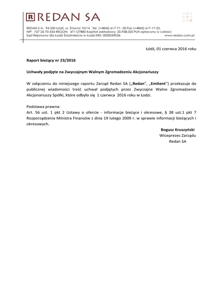 REDAN S.A. 94-250 Łódź, ul. Żniwna 10/14 , Tel. (+4842) 617-71- 00,Fax (+4842) 617-17-22, NIP: 727-25-70-554 REGON: 471127885 Kapitał zakładowy: 20.938.020 PLN opłacony w całości Sąd Rejonowy dla Łodzi Śródmieścia w Łodzi KRS: 0000039036 www.redan.com.pl Łódź, 01 czerwca 2016 roku Raport bieżący nr 23/2016 Uchwały podjęte na Zwyczajnym Walnym Zgromadzeniu Akcjonariuszy W załączeniu do niniejszego raportu Zarząd Redan SA („Redan”, „Emitent”) przekazuje do publicznej wiadomości treść uchwał podjętych przez Zwyczajne Walne Zgromadzenie Akcjonariuszy Spółki, które odbyło się 1 czerwca 2016 roku w Łodzi. Podstawa prawna: Art. 56 ust. 1 pkt 2 Ustawy o ofercie - informacje bieżące i okresowe, § 38 ust.1 pkt 7 Rozporządzenia Ministra Finansów z dnia 19 lutego 2009 r. w sprawie informacji bieżących i okresowych. Bogusz Kruszyński Wiceprezes Zarządu Redan SA REDAN S.A. 94-250 Łódź, ul. Żniwna 10/14 , Tel. (+4842) 617-71- 00,Fax (+4842) 617-17-22, NIP: 727-25-70-554 REGON: 471127885 Kapitał zakładowy: 20.938.020 PLN opłacony w całości Sąd Rejonowy dla Łodzi Śródmieścia w Łodzi KRS: 0000039036 www.redan.com.pl Załącznik do raportu bieżącego nr 23/2016 z dnia 1 czerwca 2016 roku UCHWAŁY PODJĘTE NA ZWYCZAJNYM WALNYM ZGROMADZENIU AKCJONARIUSZY REDAN SA ZWOŁANYM NA DZIEŃ 1 czerwca 2016 r. GODZ. 10:00 UCHWAŁA NR 1 Zwyczajnego Walnego Zgromadzenia REDAN SA z siedzibą w Łodzi z dnia 1 czerwca 2016 r. w sprawie wyboru Przewodniczącego Zwyczajnego Walnego Zgromadzenia Akcjonariuszy Zwyczajne Walne Zgromadzenie Akcjonariuszy wybrało na Przewodniczącą Zwyczajnego Walnego Zgromadzenia Akcjonariuszy Agnieszkę Bełdowską-Marzec. Liczba akcji, z których oddano ważne głosy: 20 470 380 akcji Procentowy udział tychże akcji w kapitale zakładowym: 59% Łączna liczba ważnych głosów: 25 520 380 w tym liczba głosów "za": 24 920 380 "przeciw": 0 "wstrzymujących się": 600 000 UCHWAŁA NR 2 Zwyczajnego Walnego Zgromadzenia REDAN S.A. z siedzibą w Łodzi z dnia 1 czerwca 2016r. w sprawie przyjęcia porządku obrad Zwyczajne Walne Zgromadzenie Akcjonariuszy postanawia przyjąć porządek obrad Zwyczajnego Walnego Zgromadzenia zwołanego na dzień 1 czerwca 2016 roku w następującym brzmieniu: 1.Otwarcie obrad Zwyczajnego Walnego Zgromadzenia Akcjonariuszy. 2. Wybór Przewodniczącego Zwyczajnego Walnego Zgromadzenia. 3. Sporządzenie Listy Obecności REDAN S.A. 94-250 Łódź, ul. Żniwna 10/14 , Tel. (+4842) 617-71- 00,Fax (+4842) 617-17-22, NIP: 727-25-70-554 REGON: 471127885 Kapitał zakładowy: 20.938.020 PLN opłacony w całości Sąd Rejonowy dla Łodzi Śródmieścia w Łodzi KRS: 0000039036 www.redan.com.pl 4. Stwierdzenie prawidłowości zwołania Zwyczajnego Walnego Zgromadzenia oraz zdolności do podejmowania uchwał. 5. Przyjęcie porządku obrad. 6. Przedstawienie przez Zarząd sprawozdania finansowego za okres od 01 stycznia 2015 roku do 31 grudnia 2015 roku oraz sprawozdania Zarządu z działalności Spółki w roku 2015, skonsolidowanego sprawozdania finansowego Grupy Kapitałowej za okres od 01 stycznia 2015 roku do 31 grudnia 2015 roku, sprawozdania z działalności Grupy Kapitałowej, a także wniosku w sprawie przeznaczenia zysku osiągniętego w 2015 r. 7. Przedstawienie przez Radę Nadzorczą sprawozdania z wykonania obowiązków w 2015 roku, zwięzłej oceny sytuacji Spółki, a także wniosków w sprawie przeznaczenia zysku osiągniętego w 2015 r. oraz udzielenia absolutorium członkowi Zarządu z wykonania przez niego obowiązków w 2015 roku. 8. Rozpatrzenie i zatwierdzenie: a) sprawozdania finansowego Spółki oraz skonsolidowanego sprawozdania finansowego Grupy Kapitałowej Redan S.A. za rok obrotowy 2015, b) sprawozdania Zarządu z działalności Spółki oraz sprawozdania z działalności Grupy Kapitałowej w roku obrotowym 2015. 9. Podjęcie uchwał w sprawie udzielenia Członkowi Zarządu absolutorium z wykonania przez niego obowiązków w 2015 roku. 10. Podjęcie uchwał w sprawie udzielenia Członkom Rady Nadzorczej absolutorium z wykonania przez nich obowiązków w 2015 roku. 11. Podjęcie uchwały w sprawie przeznaczenia zysku osiągniętego w roku obrotowym 2015. 12. Wolne wnioski. 13.Zamknięcie obrad. Liczba akcji, z których oddano ważne głosy: 20 474 380 akcji Procentowy udział tychże akcji w kapitale zakładowym: 59,0615% Łączna liczba ważnych głosów: 25 524 380 w tym liczba głosów "za": 25 520 380 "przeciw": 4 000 "wstrzymujących się": 0 REDAN S.A. 94-250 Łódź, ul. Żniwna 10/14 , Tel. (+4842) 617-71- 00,Fax (+4842) 617-17-22, NIP: 727-25-70-554 REGON: 471127885 Kapitał zakładowy: 20.938.020 PLN opłacony w całości Sąd Rejonowy dla Łodzi Śródmieścia w Łodzi KRS: 0000039036 www.redan.com.pl UCHWAŁA NR 3 Zwyczajnego Walnego Zgromadzenia REDAN S.A. z siedzibą w Łodzi z dnia 1 czerwca 2016r. w sprawie zatwierdzenia sprawozdania finansowego Spółki za rok obrotowy 2015 Stosownie do przepisów art. 393 pkt 1 i art. 395 § 2 pkt 1 kodeksu spółek handlowych, Walne Zgromadzenie Akcjonariuszy Redan S.A. postanawia po rozpatrzeniu zatwierdzić sprawozdanie finansowe Spółki za rok obrotowy 2015, obejmujące: 1) sprawozdanie z sytuacji finansowej sporządzone na dzień 31 grudnia 2015 roku, które po stronie aktywów i pasywów wykazuje sumę 184 887 tys. zł, 2) sprawozdanie z całkowitych dochodów za okres od dnia 01 stycznia 2015 roku do dnia 31 grudnia 2015 roku wykazujące zysk netto w kwocie 14 776 tys. zł. oraz całkowity dochód ogółem w kwocie 14 776 tys. zł , 3) sprawozdanie ze zmian w kapitale własnym za rok obrotowy od dnia 01 stycznia 2015 roku do dnia 31 grudnia 2015 roku wykazujące zwiększenie kapitału własnego o kwotę 14 776 tys. zł, 4) sprawozdanie z przepływów pieniężnych za okres od dnia 01 stycznia 2015 roku do dnia 31 grudnia 2015 roku wykazujące zmniejszenie stanu środków pieniężnych w ciągu roku obrotowego o kwotę 3 98