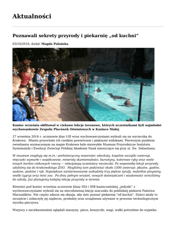 Aktualności Poznawali sekrety przyrody i piekarnię „od kuchni” 03/10/2016, dodał: Magda Polańska Koniec września obfitował w ciekawe lekcje terenowe, których uczestnikami byli najmłodsi wychowankowie Zespołu Placówek Oświatowych w Kasince Małej. 27 września 2016 r. uczniowie klas I-III wraz wychowawczyniami wybrali się na wycieczkę do Krakowa. Miasto przywitało ich rześkim powietrzem i pięknymi widokami. Pierwszym punktem zwiedzania wyznaczonym na mapie Krakowa było niezwykłe Muzeum Przyrodnicze Instytutu Systematyki i Ewolucji Zwierząt Polskiej Akademii Nauk mieszczące się przy ul. Św. Sebastiana. W muzeum znajdują się m.in.: prehistoryczny nosorożec włochaty, kopalne szczątki zwierząt, mięczaki wymarłe i współczesne, minerały skamieniałości, bursztyny, kolorowe ryby oraz wiele innych bardzo ciekawych rzeczy -– relacjonują uczestnicy wycieczki. Po wspaniałej lekcji przyrody udaliśmy się do krakowskiego ZOO. Mogliśmy tam podziwiać około 1500 zwierząt: płazów, gadów, ssaków, ptaków i ryb. Największe zainteresowanie wzbudziły trzy piękne żyrafy, maleńkie pingwiny, wielki tygrys oraz mini zoo. Po dniu pełnym wrażeń, nowych doświadczeń i wiadomości wróciliśmy do szkoły. Już planujemy kolejną lekcję przyrody w terenie. Również pod koniec września uczniowie klasy IIIA i IIIB kasinczańskiej „jedynki” z wychowawczyniami wybrali się na niecodzienną lekcję szacunku do pobliskiej piekarni Państwa Marszalików. Nie często zdarza się okazja, aby móc poznać piekarnię "od kuchni". Dzieci miały to szczęście i zobaczyły jej zaplecze, produkty oraz urządzenia używane w procesie technologicznym wyrobu pieczywa. Wszyscy z zaciekawieniem oglądali maszyny, piece, koszyczki, wagi, wałki potrzebne do wypieku pachnących bochenków chleba, chrupiących bułeczek i słodkich pączków oraz drożdżówek. Milusińscy poznali tajniki pracy piekarza, a także etapy powstawania chleba i innych produktów piekarskich. Zainteresowani zadawali mnóstwo pytań, a na każde z nich cierpliwie odpowiadał Pan Andrzej, któremu bardzo dziękujemy za wspaniałą lekcję – wyrazy wdzięczności przekazują opiekunowie grup. Po wycieczce część uczniów zapewniała, że w przyszłości zostaną piekarzami. Być może rzeczywiście wśród nas, jest wspaniały przyszły piekarz – zastanawiali się uczestnicy wyprawy. Wycieczka była udana. Bardzo dziękujemy Państwu Marszalikom za możliwość zwiedzenia piekarni – dodają. Justyna Łazorko Małgorzata Łabuz