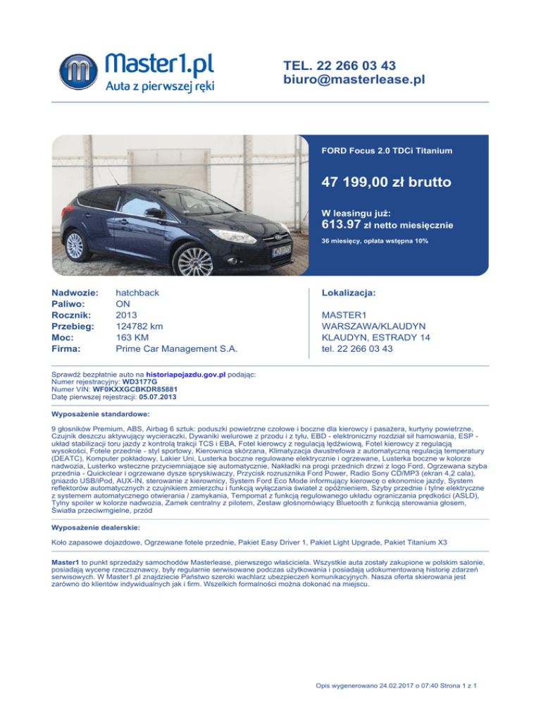 TEL. 22 266 03 43 [email protected] FORD Focus 2.0 TDCi Titanium 47 199,00 zł brutto W leasingu już: 613.97 zł netto miesięcznie 36 miesięcy, opłata wstępna 10% Nadwozie: Paliwo: Rocznik: Przebieg: Moc: Firma: hatchback ON 2013 124782 km 163 KM Prime Car Management S.A. Lokalizacja: MASTER1 WARSZAWA/KLAUDYN KLAUDYN, ESTRADY 14 tel. 22 266 03 43 Sprawdź bezpłatnie auto na historiapojazdu.gov.pl podając: Numer rejestracyjny: WD3177G Numer VIN: WF0KXXGCBKDR85881 Datę pierwszej rejestracji: 05.07.2013 Wyposażenie standardowe: 9 głosników Premium, ABS, Airbag 6 sztuk: poduszki powietrzne czołowe i boczne dla kierowcy i pasażera, kurtyny powietrzne, Czujnik deszczu aktywujący wycieraczki, Dywaniki welurowe z przodu i z tyłu, EBD - elektroniczny rozdział sił hamowania, ESP układ stabilizacji toru jazdy z kontrolą trakcji TCS i EBA, Fotel kierowcy z regulacją lędźwiową, Fotel kierowcy z regulacją wysokości, Fotele przednie - styl sportowy, Kierownica skórzana, Klimatyzacja dwustrefowa z automatyczną regulacją temperatury (DEATC), Komputer pokładowy, Lakier Uni, Lusterka boczne regulowane elektrycznie i ogrzewane, Lusterka boczne w kolorze nadwozia, Lusterko wsteczne przyciemniające się automatycznie, Nakładki na progi przednich drzwi z logo Ford, Ogrzewana szyba przednia - Quickclear i ogrzewane dysze spryskiwaczy, Przycisk rozrusznika Ford Power, Radio Sony CD/MP3 (ekran 4,2 cala), gniazdo USB/iPod, AUX-IN, sterowanie z kierownicy, System Ford Eco Mode informujący kierowcę o ekonomice jazdy, System reflektorów automatycznych z czujnikiem zmierzchu i funkcją wyłączania świateł z opóżnieniem, Szyby przednie i tylne elektryczne z systemem automatycznego otwierania / zamykania, Tempomat z funkcją regulowanego układu ograniczania prędkości (ASLD), Tylny spoiler w kolorze nadwozia, Zamek centralny z pilotem, Zestaw głośnomówiący Bluetooth z funkcją sterowania głosem, Światła przeciwmgielne, przód Wyposażenie dealerskie: Koło zapasowe dojazdowe, Ogrzewane fotele przednie, Pakiet Easy Driver 1, Pakiet Light Upgrade, Pakiet Titanium X3 Master1 to punkt sprzedaży samochodów Masterlease, pierwszego właściciela. Wszystkie auta zostały zakupione w polskim salonie, posiadają wycenę rzeczoznawcy, były regularnie serwisowane podczas użytkowania i posiadają udokumentowaną historię zdarzeń serwisowych. W Master1.pl znajdziecie Państwo szeroki wachlarz ubezpieczeń komunikacyjnych. Nasza oferta skierowana jest zarówno do klientów indywidualnych jak i firm. Wszelkich formalności można dokonać na miejscu. Opis wygenerowano 24.02.2017 o 07:40 Strona 1 z 1