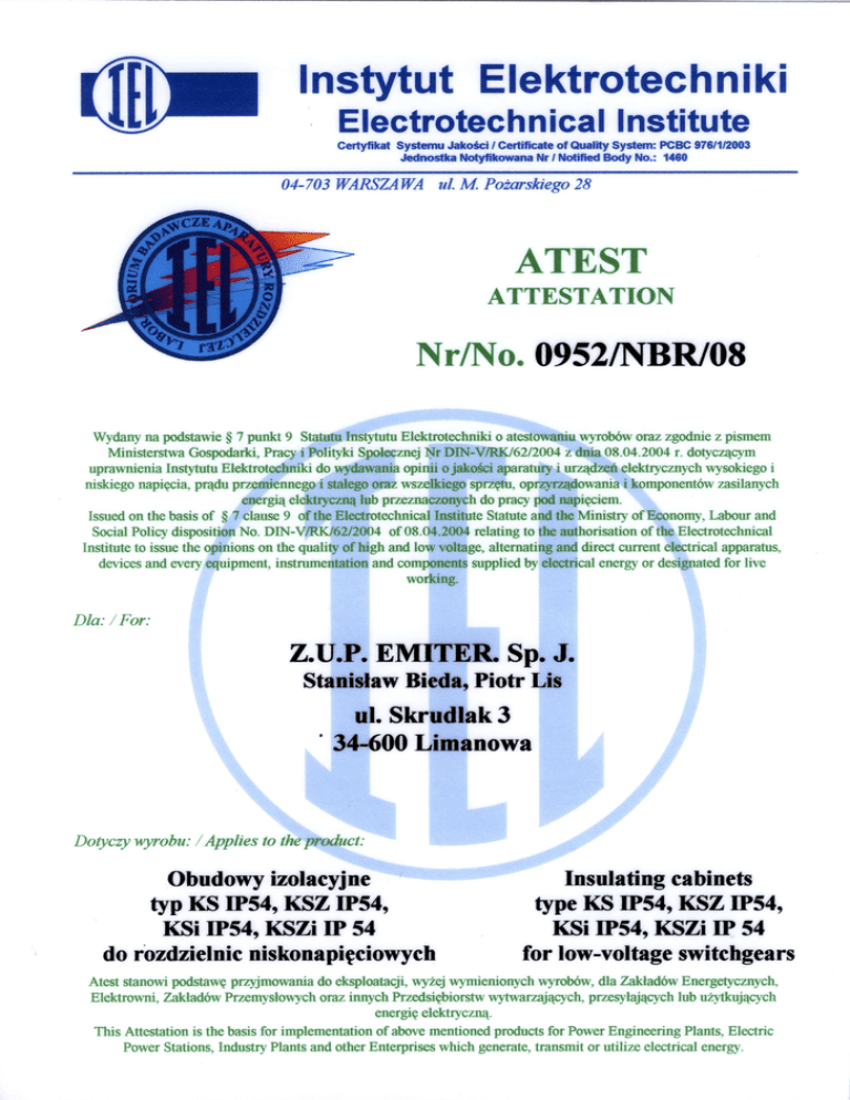 stosowania w elektroenergetyce. / On the basis of above this is to certify that product fulfils the requirements