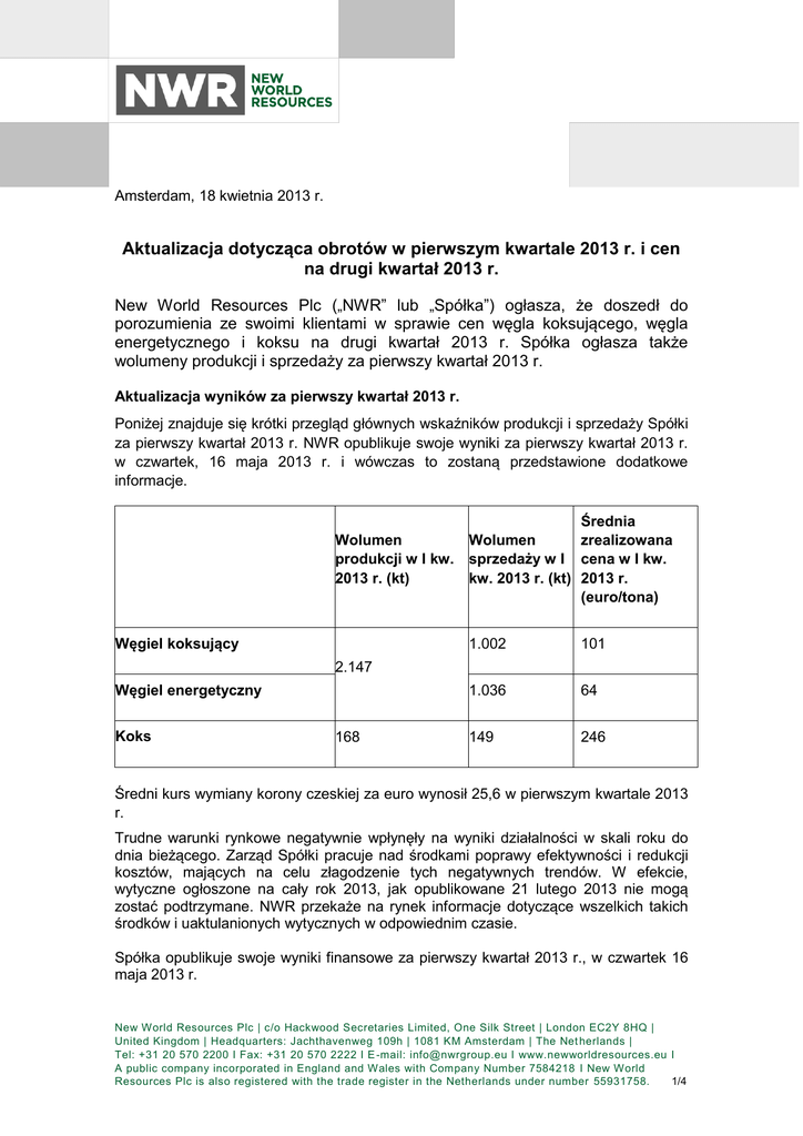 Amsterdam, 18 kwietnia 2013 r. Aktualizacja dotycząca obrotów w pierwszym kwartale 2013 r. i cen na drugi kwartał 2013 r. New World Resources Plc („NWR” lub „Spółka”) ogłasza, że doszedł do porozumienia ze swoimi klientami w sprawie cen węgla koksującego, węgla energetycznego i koksu na drugi kwartał 2013 r. Spółka ogłasza także wolumeny produkcji i sprzedaży za pierwszy kwartał 2013 r. Aktualizacja wyników za pierwszy kwartał 2013 r. Poniżej znajduje się krótki przegląd głównych wskaźników produkcji i sprzedaży Spółki za pierwszy kwartał 2013 r. NWR opublikuje swoje wyniki za pierwszy kwartał 2013 r. w czwartek, 16 maja 2013 r. i wówczas to zostaną przedstawione dodatkowe informacje. Wolumen produkcji w I kw. 2013 r. (kt) Węgiel koksujący Średnia Wolumen zrealizowana sprzedaży w I cena w I kw. kw. 2013 r. (kt) 2013 r. (euro/tona) 1.002 101 1.036 64 149 246 2.147 Węgiel energetyczny Koks 168 Średni kurs wymiany korony czeskiej za euro wynosił 25,6 w pierwszym kwartale 2013 r. Trudne warunki rynkowe negatywnie wpłynęły na wyniki działalności w skali roku do dnia bieżącego. Zarząd Spółki pracuje nad środkami poprawy efektywności i redukcji kosztów, mających na celu złagodzenie tych negatywnych trendów. W efekcie, wytyczne ogłoszone na cały rok 2013, jak opublikowane 21 lutego 2013 nie mogą zostać podtrzymane. NWR przekaże na rynek informacje dotyczące wszelkich takich środków i uaktulanionych wytycznych w odpowiednim czasie. Spółka opublikuje swoje wyniki finansowe za pierwszy kwartał 2013 r., w czwartek 16 maja 2013 r. New World Resources Plc | c/o Hackwood Secretaries Limited, One Silk Street | London EC2Y 8HQ | United Kingdom | Headquarters: Jachthavenweg 109h | 1081 KM Amsterdam | The Net herlands | Tel: +31 20 570 2200 I Fax: +31 20 570 2222 I E -mail: [email protected] I www.newworldresources.eu I A public company incorporated in England and Wales with Company Number 7584218 I New World Resources Plc is also registered with the trade register in the Netherlands under number 55931758. 1/4 Ceny węgla koksującego w drugim kwartale 2013 r. Średnia uzgodniona cena dla węgla koksującego, który ma być dostarczony w drugim kwartale 2013 r. wynosi 104 euro za tonę i jest o 3 procent wyższa od ceny zrealizowanej w pierwszym kwartale kalendarzowym 2013 r. Powyższa średnia cena węgla koksującego opiera się na założeniu, że sprzedaż węgla koksującego w drugim kwartale 2013 r. będzie stanowić w około 39 procentach twardy węgiel koksujący (średnia zmienność), w 52 procentach półmiękki węgiel koksujący oraz w 9 procentach węgiel koksujący typu PCI. Ceny koksu w drugim kwartale 2013 r. Średnia uzgodniona cena dla koksu, który ma być dostarczony w drugim kwartale 2013 r. wynosi 246 euro za tonę, niezmienna w porównaniu do ceny zrealizowanej w pierwszym kwartale 2013 r. Średnia cena koksu opiera się na założeniu, że sprzedaż w drugim kwartale 2013 r. będzie się składać w przybliżeniu w 66 procentach z koksu odlewniczego, w 23 procentach z koksu wielkopiecowego i w 11 procentach z innych typów koksu. Ceny węgla energetycznego w 2013 r. Jak ogłoszono wcześniej, średnia cena dla węgla energetycznego, który ma zostać dostarczony w 2013 r. została ustalona na poziomie 60 euro za tonę. Średnia cena węgla energetycznego opiera się na założeniu, że sprzedaż węgla energetycznego na pełen rok 2013 będzie się składać w przybliżeniu w 80 procentach z węgla energetycznego I w 20 procentach z miału. Około 80 procent dostaw węgla energetycznego jest wycenianych w oparciu o bazę roczną, natomiast wycena kwartalna dotyczy około 20 procent dostaw. Średnia ważona cena dla wszystkich dostaw węgla energetycznego w drugim kwartale 2013 r. wyniosła 59 euro za tonę. Uwagi dodatkowe Wszystkie ceny są wyrażone jako uśrednione przeciętne ceny dla różnej jakości zarówno węgla, jak i koksu, i są cenami loco. Wszystkie ogłoszone ceny są cenami orientacyjnymi, i oparte są na kursie wymiany 25,0 korony czeskiej za euro. Szereg czynników, włącznie z, ale nie ograniczając się do, wahań kursu walutowego, zmian jakości, terminowości dostaw oraz elastycznych przepisów w poszczególnych umowach może wpłynąć na końcowe zrealizowane ceny. Zatem rzeczywista cena zrealizowana w tym okresie może różnić się od średniej ogłoszonej ceny. New World Resources Plc | c/o Hackwood Secretaries Limited, One Silk Street | London EC2Y 8HQ | United Kingdom | Headquarters: Jachthavenweg 109h | 1081 KM Amsterdam | The Net herlands | Tel: +31 20 570 2200 I Fax: +31 20 570 2222 I E -mail: [email protected] I www.newworldresources.eu I A public company incorporated in England and Wales with Company Number 7584218 I New World Resources Plc is also registered with the trade register in the Netherlands under number 55931758. 2/4 - Koniec – Szczegółowe informacje: Relacje Inwestorskie Tel: +31 20 570 2244 Email: [email protected] Komunikacja Korporacyjna Tel: +31 20 570 2229 Email: [email protected] Strona internetowa: www.newworldresources.eu O NWR: New World Resources Plc jest jednym z wiodących producentów węgla kamiennego i koksu w Europie Środkowej. NWR produkuje wysokiej jakości węgiel koksujący i energetyczny na potrzeby sektora hutniczego i energetycznego w Europie Środkowej poprzez swoją spółkę zależną OKD, największego producenta węgla kamiennego w Republice Czeskiej. OKK, koksownicza spółka zależna NWR, jest największym producentem koksu odlewniczego w Europie. NWR realizuje obecnie kilka projektów rozwojowych w Polsce i Republice Czeskiej, które stanowią część regionalnej strategii wzrostu Spółki. W 2013 r. Spółka ogłosiła strategię, zakładającą zmianę pozycjonowania NWR na lidera w wydobyciu i sprzedaży węgla koksującego w Europie do 2017 roku. New World Resources należy do indeksu FTSE 250 i jest notowana na Gieł