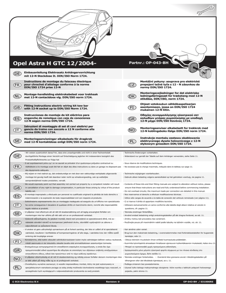 Opel Astra H GTC 12/2004- Partnr.: OP-043-BH DE Einbauanleitung Elektrosatz Anhängervorrichtung mit 12-N Steckdose It. DIN/ISO Norm 1724. FR Instructions de montage du faisceau électrique pour chrochet d'attelage conforme à la norme DIN/ISO 1724 prise 12-N CZ Montážní pokyny: souprava pro elektrické propojení tažné tyče s 12 - N zásuvkou do normy DIN/ISO 1724. NL Montage-handleiding elektrokabelset voor trekhaak met 12-N contactdoos vlg. DIN/ISO norm 1724. DK Monteringsvejledninger for det elektriske ledningsføringssæt for trækstang med 12-N stikdåse, DIN/ISO, norm 1724. GB Fitting instructions electric wiring kit tow bar with 12-N socket up to DIN/ISO Norm 1724. ES Instrucciones de montaje de kit eléctrico para enganche de remolque con caja de conexiones 12-N según norma DIN/ISO 1724. GR Οδηγίες συναρμολόγησης ηλεκτρικού σετ καλωδίων μπάρας ρυμούλκησης με υποδοχή 12-Ν μέχρι DIN/ISO Κανόνας 1724. IT Istruzioni di montaggio di set di cavi elettrici per gancio da traino con zoccolo a 12 N conforme alla norma DIN/ISO 1724. NO Monteringsanviser elkabelsett for trekkrok med 12-N koblingsboks ifølge DIN/ISO norm 1724. SE Monteringsanvisningar elkabelsats för dragkrok med 12-N kontaktdosa enligt DIN/ISO norm 1724. PL Instrukcje montażu zestawu okablowania elektrycznego dyszla holowniczego z 12-N stykowym gniazdem DIN/ISO 1724. DE FI - Wir weisen ausdrücklich darauf hin, dass eine unsachgemäße und nicht in einer Fachwerkstatt durchgeführte Montage einen Verzicht auf Entschädigung jeglicher Art insbesondere bezüglich des Ohjeet vetokoukun sähkökaapelisarjan asentamiseen, jossa on DIN/ISO 1724 mukainen 12-N liitin. - Technische Änderungen vorbehalten. - Widerstand nur gemäß der Tabelle auf dem Anhänger verwenden, siehe Seite 11. Produkthaftpflichtrechts zur Folge hat - Il est expréssement prévu qu' on ne saurait se prévaloir d'un quelconque préjudice contractuel ou FR rédhibitoire si le montage avait été fait en dépit des dites instructions ou dans un garage ne disposant pas - Sous réserve de modifications techniques. - Ne excessez pas la charge maximale, indiquée dans le tableau sur page 11. des équipments adéquats. - Wij wijzen er met nadruk op, dat ondeskundige en niet door een vakkundige werkplaats uitgevoerde NL montage tot gevolg heeft dat daardoor ieder recht op schadevergoeding, ook op wettelijke - Technische wijzigingen voorbehouden. - Gebruik alleen belasting volgens aansluittabel op het getrokken voertuig, zie pagina 11. aansprakelijkheid inzake produkten, vervalt. - We would expressly point out that assembly not carried out properly by a competent installer will result GB in cancellation of any right to damage compensation, in particular those arising by virtue of the product liability act. ES - El montaje inapropiado y efectuado por personal no cualificado originará la pérdida de todo derecho a indemnización o la expiración de toda responsabilidad civil con respecto al producto. ha come conseguenza il decadere di qualsiasi diritto al risarcimento danni, nonché alla responsabilità - Ci si riserva il diritto di apportare modifiche tecniche. - Utilizzare esclusivamente un carico conforme alla tabella degli allacci relativa al veicolo in questione, cfr. pagina 11. - Vi påpekar med eftertryck att all rätt till skadeersättning och all laglig ansvarighet förfaller om monteringen inte har utförts på rätt sätt och av en professionell verkstad. - Tekniska ändringar förbehålles. - Använd endast belastning enligt anslutningstabellen på det dragna fordonet, se sid. 11. - Výslovně zdůrazňujeme, že jakákoli montáž, která není provedená ve specializované dílně, má za - CZ - Nos reservamos el derecho a efectuar modificaciones técnicas. - Utilice sólo cargas de acuerdo a la tabla de conexión del vehículo remolcado (ver página 11). legale relativa ai prodotti. SE ensure that these instructions are read and fully understood before commencing installation. - Do not overload circuits; the maximum loads per connection are detailed in this manual. - Sottolineiamo espressamente che un montaggio inadeguato ed eseguito da un'officina non specializzata IT - Contents of these kits and their fitting manuals are subject to alteration without notice, please následek odvolání nároků na kompenzaci jakéhokoli druhu, obzvláště vyplývajících ze zákona o - Změny mohou být provedeny bez oznámení. - Používejte pouze při maximálním nabití podle tabulky na tažném vozidle, viz. str. 11. odpovědnosti za způsobené škody. - Vi ønsker at gøre udtrykkeligt opmærksom på at forkert samling, der ikke er udført af et specialiseret DK værksted, resulterer i bortfaldelse af kompenseringskrav af alle slags, i særdeles krav der måtte opstå omkring det lovpligtige ansvar. FI mikäli asennusta ei ole toteutettu oikealla tavalla eikä ammattitaitoisen asiantuntijan toimesta. πραγματοποιηθεί ειδικό εργαστήριο θα οδηγήσει σε αποποίηση των αξιώσεων επιβολής αποζημιώσεων οποιουδήποτε είδους, ειδικά όσα προκύπτουν από το νόμο ευθύνης προϊόντων. NO - Oikeus teknisiin muutoksiin ilman erillistä huomautusta pidätetään. - Kuormita työvirtapiiriä ainoastaan hinattavan ajoneuvon kytkentäkaavion mukaisesti, katso sivu 11. - Μπορεί να τροποποιηθεί χωρίς προηγούμενη ειδοποίηση. - Χρησιμοποιείτε μόνο μέγιστο ηλεκτρικό φορτίο σύμφωνα με τον πίνακα σύνδεσης στο ρυμουλκούμενο όχημα, δείτε σελίδα 11. - Vi påpeker ettertrykkelig at all rett til skadeerstatning og rettslig ansvar forfaller dersom monteringen ikke - Tekniske endringer forbeholdes. - Overskrid ikke grensene 