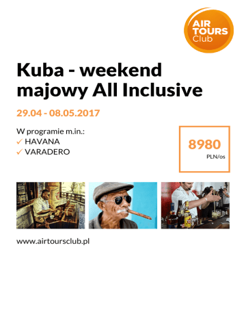 Kuba - weekend majowy All Inclusive 29.04 - 08.05.2017 W programie m.in.: HAVANA VARADERO www.airtoursclub.pl 8980 PLN/os
