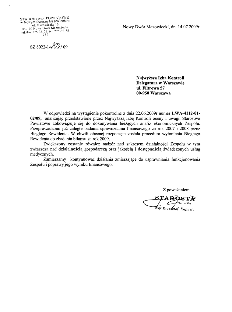 STAI, O::, I'W V Pu VI! lAl,'O W.E w Nowym Dworze Mazowieckim ul. Mazowiecka 10. . 0"-100 Nowv Dwór MazowIeckI tel-ifax 77')·36-79. tel "7"-32-';8 (3) SZ.8022-1~.I 09 Najwyższa Izba Kontroli Delegatura w Warszawie ul. Filtrowa 57 00-950 Warszawa W odpowiedzi na wystąpienie pokontrolne z dnia 22.06.2009r numer LWA-4112-0102/09, analizując przedstawione przez Najwyższą Izbę Kontroli oceny i uwagi, Starostwo Powiatowe zobowiązuje się do dokonywania bieżących analiz ekonomicznych Zespołu. Przeprowadzono już zaległe badania sprawozdania finansowego za rok 2007 i 2008 przez Biegłego Rewidenta. W chwili obecnej rozpoczęta została procedura wyłonienia Biegłego Rewidenta do zbadania bilansu za rok 2009. Zwiększony zostanie również nadzór nad zakresem działalności Zespołu w tym zwłaszcza nad działalnością gospodarczą oraz jakością i dostępnością świadczonych usług medycznych. Zamierzamy kontynuować działania zmierzające do usprawniania funkcjonowania Zespołu i poprawy jego wyniku finansowego.