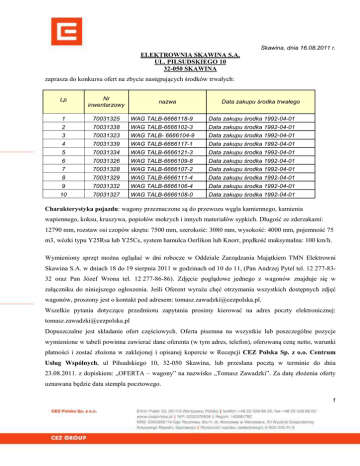 Skawina, dnia 16.08.2011 r. ELEKTROWNIA SKAWINA S.A. UL. PIŁSUDSKIEGO 10 32-050 SKAWINA zaprasza do konkursu ofert na zbycie następujących środków trwałych: Lp Nr inwentarzowy 1 70031325 WAG TALB-6666118-9 Data zakupu środka 1992-04-01 2 70031338 WAG TALB-6666102-3 Data zakupu środka 1992-04-01 3 70031323 WAG TALB- 6666104-9 Data zakupu środka 1992-04-01 4 70031339 WAG TALB-6666117-1 Data zakupu środka 1992-04-01 5 70031334 WAG TALB-6666121-3 Data zakupu środka 1992-04-01 6 70031326 WAG TALB-6666109-8 Data zakupu środka 1992-04-01 7 70031328 WAG TALB-6666107-2 Data zakupu środka 1992-04-01 8 70031329 WAG TALB-6666111-4 Data zakupu środka 1992-04-01 9 70031332 WAG TALB-6666106-4 Data zakupu środka 1992-04-01 10 70031327 WAG TALB-6666108-0 Data zakupu środka 1992-04-01 nazwa Data zakupu środka trwałego Charakterystyka pojazdu: wagony przeznaczone są do przewozu węgla kamiennego, kamienia wapiennego, koksu, kruszywa, popiołów mokrych i innych materiałów sypkich. Długość ze zderzakami: 12790 mm, rozstaw osi czopów skrętu: 7500 mm, szerokość: 3080 mm, wysokość: 4000 mm, pojemność 75 m3, wózki typu Y25Rsa lub Y25Cs, system hamulca Oerlikon lub Knorr, prędkość maksymalna: 100 km/h. Wymieniony sprzęt można oglądać w dni robocze w Oddziale Zarządzania Majątkiem TMN Elektrowni Skawina S.A. w dniach 18 do 19 sierpnia 2011 w godzinach od 10 do 11, (Pan Andrzej Pytel tel. 12 277-8332 oraz Pan Józef Wrona tel. 12 277-86-86). Zdjęcie poglądowe jednego z wagonów znajduje się w załączniku do niniejszego ogłoszenia. Jeśli Oferent wyraża chęć otrzymania wszystkich dostępnych zdjęć wagonów, proszony jest o kontakt pod adresem: [email protected]. Wszelkie pytania dotyczące przedmiotu zapytania prosimy kierować na adres poczty elektronicznej: [email protected] Dopuszczalne jest składanie ofert częściowych. Oferta pisemna na wszystkie lub poszczególne pozycje wymienione w tabeli powinna zawierać dane oferenta (w tym adres, telefon), oferowaną cenę netto, warunki płatności i zostać złożona w zaklejonej i opisanej kopercie w Recepcji CEZ Polska Sp. z o.o. Centrum Usług Wspólnych, ul Piłsudskiego 10, 32-050 Skawina, lub przesłana pocztą w terminie do dnia 23.08.2011. z dopiskiem: „OFERTA – wagony” na nazwisko „Tomasz Zawadzki”. Za datę złożenia oferty uznawana będzie data stempla pocztowego. 1 Pisemna oferta złożona w zamkniętej kopercie z dopiskiem „OFERTA – wagony” z pieczątką oferenta (w przypadku osób fizycznych z adresem zwrotnym) powinna zawierać: 1. Imię i nazwisko, adres lub nazwę i siedzibę oferenta, wypis z ewidencji działalności gospodarczej, gdy oferent jest osobą fizyczną prowadzącą działalność gospodarczą lub odpis z rejestru przedsiębiorców KRS w przypadku podmiotów podlegających ujawnieniu w KRS, wystawione nie później niż 3 miesiące przed terminem złożenia ofert. Wypisy z ewidencji działalności gospodarczej oraz odpisy z rejestru przedsiębiorców KRS winny być składane w oryginale lub kopii notarialnie poświadczonej za zgodność z oryginałem. 2. Datę sporządzenia oferty i potwierdzenie terminu związania ofertą (30 dni od terminu składania ofert). 3. Przedmiot oferty (nazwa modelu wagonu/wagonów) i proponowaną cenę kupna ze wskazaniem, iż zaoferowana cena jest ceną netto. 4. Oświadczenie Oferenta o nie zaleganiu w składkach do ZUS i nie zaleganiu w podatkach do Urzędu Skarbowego. 5. Zobowiązanie zapłaty ceny sprzedaży wagonów – najpóźniej do dnia zawarcia umowy o sprzedaży. 6. Oświadczenie oferenta wg wzoru: Oświadczenie dotyczy:…………………………………………………………………………………………. (przedmiot zakupu) …………………………………………………………………………………………………… (imię i nazwisko oferenta w przypadku osób fizycznych lub oznaczenie firmy oferenta będącego osobą prawną) „1) Zapoznałem się ze stanem technicznym i prawnym przedmiotu ogłoszenia i nie wnoszę co do nich żadnych zastrzeżeń. 2) Nie wnoszę i nie będę wnosić w przyszłości żadnych roszczeń, w szczególności wynikających ze stopnia zużycia przedmiotu ogłoszenia. 3) Nie wnoszę i nie będę wnosić w przyszłości zastrzeżeń co do stanów faktycznych i prawnych wagonów, ani roszczeń w stosunku do grupy CEZ w Polsce. ………..……………………. Data, podpis, pieczątka firmy” 2 Termin związania ofertą wynosi 30 dni licząc od ostatniego dnia terminu składania ofert. Elektrownia Skawina S.A. zastrzega sobie prawo: a) zaproszenia oferentów, którzy złożyli najkorzystniejsze, porównywalne oferty do II etapu postępowania polegającego na przeprowadzeniu aukcji internetowej z ceną wywoławczą ustaloną na podstawie ofert złożonych w etapie I. II etap postępowania planowany jest w dniu 25 sierpnia 2011 r. O godzinie rozpoczęcia aukcji wybrani oferenci zostaną poinformowani telefonicznie i poprzez pocztę e-mail najpóźniej do godziny 16.00 dnia poprzedniego. Wzięcie udziału w drugim etapie postępowania jest równoznaczne z potwierdzeniem akceptacji warunków zawartych w Regulaminie Prowadzenia Aukcji Elektronicznych w Grupie Kapitałowej CEZ w Polsce (dostępnym do pobrania ze strony internetowej: http://www.cezpolska.pl/pl/dladostavcow/pozostale-postepowania/aukcje-elektroniczne.html) . b) odstąpienia od przetargu, negocjacji lub umowy sprzedaży bez podawania przyczyn.