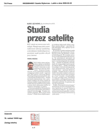 TAI Press 060268644601 Gazeta Wyborcza - Lublin z dnia 2006-02-22 KURSY JĘZYKOWE dla niewidomych na KUL Studia przez satelitę KUL stawia na nowoczesne technologie. Planuje nauczanie za pośrednictwem tele\vizji satelitarnej, a niewidomym i niedowidzącym zapewnienie nauki języków obcych przez internet PAWEŁ RESZKA KUL kończy prace nad projektem, jakiego na lubelskich uczelniach jeszcze nie byto. Chodzi o nauczanie za pośrednictwem telewizji satelitarnej. - Na pewno nie ograniczymy się do emitowania profesora czytającego wykład z kartki - zapewnia prof. Piotr Francuz, kierownik Katedry Psychologii Eksperymentalnej KUL, który koordynuje przedsięwzięcie. - Projekt jest bardzo zaawansowany. Ale o szczegółach wolałbym nie mówić, dopóki nie zyskamy środków na jego sfinansowanie. Dzięki telewizji możliwość skorzystania z naszej oferty edukacyjnej mieliby też słuchacze mieszkający za granicą. Uniwersytet planuje też lekcje języków obcych przez internet dla osób niedowidzących i niewidomyda. -To jeden z elementów programu „Przez języki świata do pracy". Dzięki niemu niepełnospraw- Dziennik Śr. nakład 16000egz. Zasięg lokalny s. 3 ni wzrokowo będą mogli zdobyć certyfikat z języka obcego - opowiada Michał Jastrzębski, który zajmuje się realizacją projektu. W kwietniu uczelnia uruchomi studia podyplomowe dla nauczycieli. Dowiedzą się na nich, jak pracować z uczniami niewidzącymi. We wrześniu zaś sami na uczelni poprowadzą dla nich kursy. Na uniwersytecie powstanie też ośrodek adaptacji pomocy multimedialnych. w tym np. programów do nauki języka - właśnie na potrzeby niewidomych. Do wiosny pojawi się też specjalna witryna KUL. - Osoby niewidome korzystające z internetu używają specjalnego oprogramowania, które czyta im zawartość stron - opowiada Michał Jastrzębski. - Program nie jest w stanie oddzielić informacji ważnych umieszczonych na stronie od tych, które są nieistotne. „Czyta" wszystko - również grafikę. To często powoduje chaos. Niewidomy ma problem z selekcją informacji. Kolejna wersja witryny KUL będzie bardzo oszczędna graficznie. To powinno ułatwić jej zrozumienie. Projekt „Przez języki świata do pracy" finansowany jest przez Europejski Fundusz Społeczny w ramach inicjatywy wspólnotowej EQUAL. Jej celem jest promowanie nowych sposobów zwalczania form dyskryminacji i nierówności na rynku pracy.
