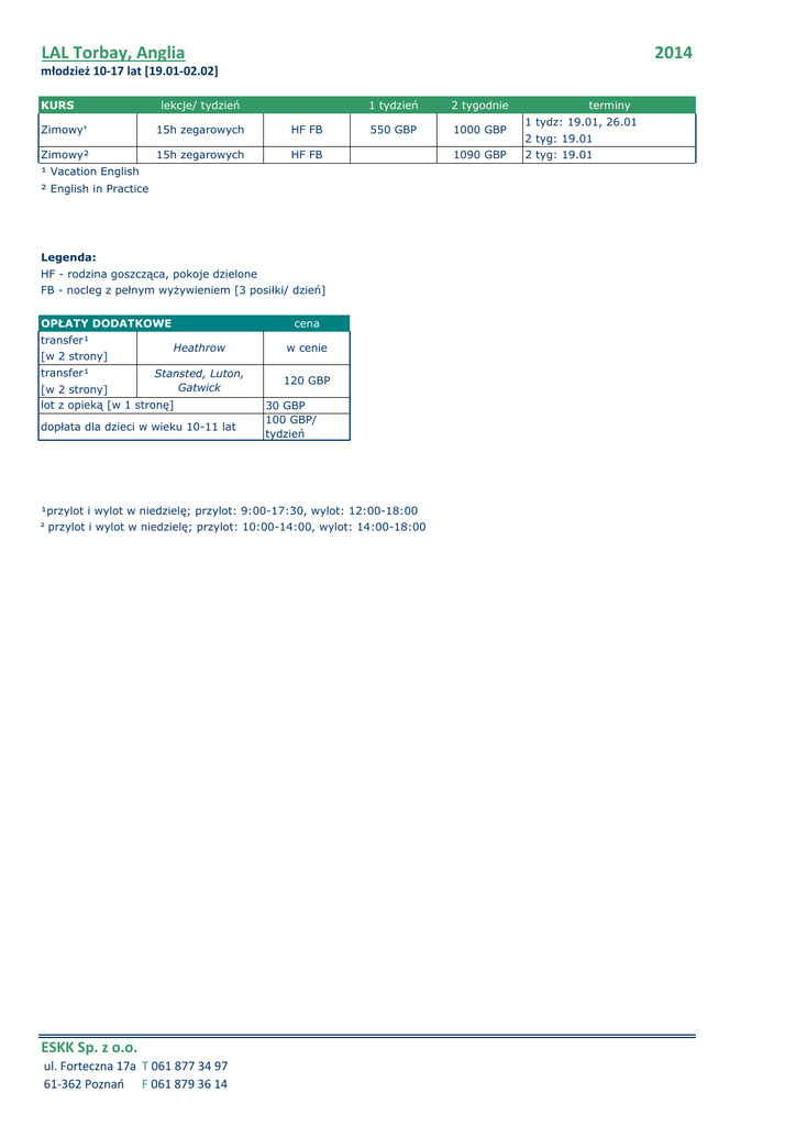 LAL Torbay, Anglia 2014 młodzież 10-17 lat [19.01-02.02] KURS lekcje/ tydzień 1 tydzień Zimowy¹ 15h zegarowych HF FB Zimowy² 15h zegarowych HF FB 550 GBP ¹ Vacation English ² English in Practice Legenda: HF - rodzina goszcząca, pokoje dzielone FB - nocleg z pełnym wyżywieniem [3 posiłki/ dzień] cena OPŁATY DODATKOWE transfer¹ [w 2 strony] Heathrow transfer¹ Stansted, Luton, Gatwick [w 2 strony] lot z opieką [w 1 stronę] dopłata dla dzieci w wieku 10-11 lat w cenie 120 GBP 30 GBP 100 GBP/ tydzień ¹przylot i wylot w niedzielę; przylot: 9:00-17:30, wylot: 12:00-18:00 ² przylot i wylot w niedzielę; przylot: 10:00-14:00, wylot: 14:00-18:00 ESKK Sp. z o.o. ul. Forteczna 17a T 061 877 34 97 61-362 Poznań F 061 879 36 14 2 tygodnie 1000 GBP 1090 GBP terminy 1 tydz: 19.01, 26.01 2 tyg: 19.01 2 tyg: 19.01