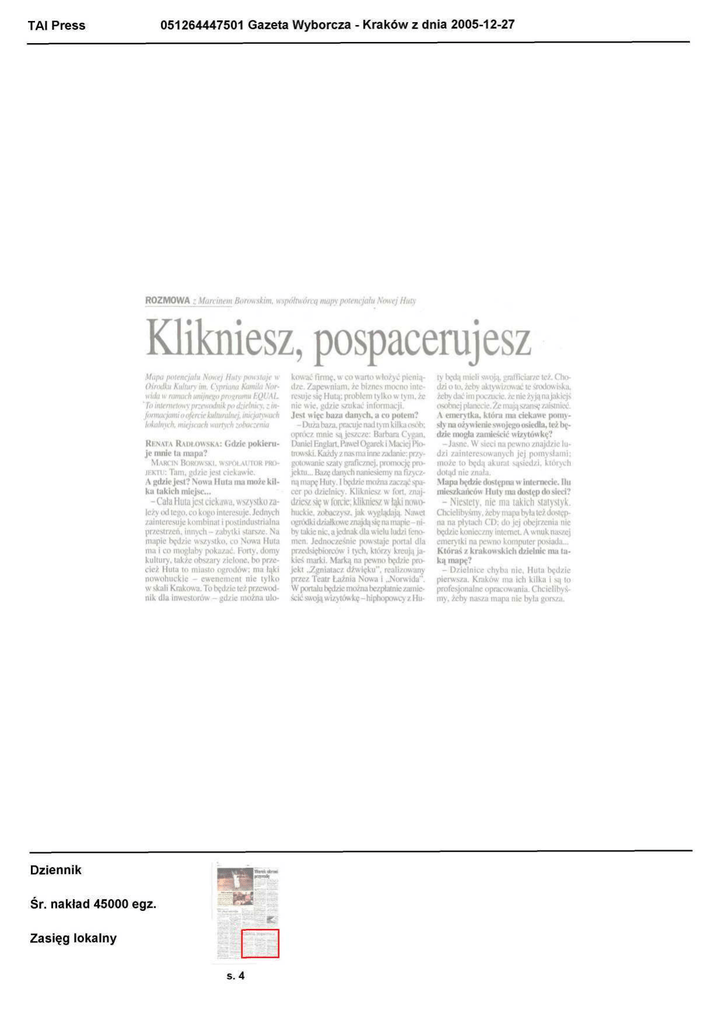 TAI Press 051264447501 Gazeta Wyborcza - Kraków z dnia 2005-12-27 ROZMOWA ; Marcinem Bonwskim. współtwórcą mapy potencjału Nnwej HUK Mkniesz, pospacerujesz Mufa puiencjahi Nmrej Huty pim:\uijc » (Kroilku Kultur)- im. Cypriana Kamilu Norwidii u r rainucli ttiiijne^o programu EQUAL ' To intemetowy przewodnik po dzielnicy,: informacjami o ofercie kulturalnej, inicjatywach ioLtilimii, mit'i\fticli m/rfrr/i zolwwiia RENATA RADŁOWSKA: Gdzie pokieruje mnie ta mapa? MARCIN BOROWSKI. WSPÓŁAUTOR I>KOJUKTU: Tum. gdzie jesl ciekawie. A gdzie jest? Nowa Huta ma może kilka takich miejsc... - Cata Hutajest ciekawa, wszystko /ależy od lego. co kogo interesuje. Jednych zainteresuje kombinat i postindustrialna przestrzeń, innych-zuhyiki starsze. Na mapie będzie wszystko, co Nowa Hula ma i co mogłaby pokazuć. Forty, domy kultury, także obszary zielone, bo przecież Hula to miasto ogrodów: mu łąki nowohuckie - ewenement nie t y l k o w skali Krakowa. To będzie też przewodnik dla inwestorów - gdzie można ulo- Dziennik Śr. nakład 45000 egz. Zasięg lokalny s. 4 kować firmę, w co warto włożyć pieniądze. Zapewniam, że biznes mocno interesuje się Hula; problem t\ Iko \\ i\ m. że nie wie. gdzie szukać informacji. Jesl więc baza danych, a co potem? -Dużabaza,pracuje n a d u m k i l k a osób: oprócz mnie są jeszcze: Barbara Cygan. Daniel Englart. Paweł Ogarek i Maciej Pioirowski. Każdy z nas ma inne zadanie: pr/.ygolowanie szaty graficznej, promocję projektu... Bazę danych naniesiemy na fizyczną mapę Huty. I będzie można zacząć spacer po dzielnicy. Klikniesz w fort, znajdziesz się w forcie: klikniesz w taki nowohuckie, zobaczysz, jak wyglądają.. Nawel ogródki działkowe znajdą się na mapie - niby lakie nic, a jednak dla wielu ludzi fenomen. Jednocześnie powstaje portu! dla przedsiębiorców i tych, którzy kreują jakieś marki. Marką na pewno będzie projekt ..Zgniatacz dźwięku", realizowany przez Teatr Łaźnia Nowa i „Norwida". W portalu będzie można bezpłatnie zamieścić swoją wizytówkę - hiphopowcy z Hu- ty będą mieli swoją, grafficiar/e leż. Głodzi o to. żeh\ akiytt i/ować le śmdim iska. żeby dać im |x>c/_ucie. że nic ż\ ją na jakiejś osobnej planecie. Że mająs/an.sc z.iisinicć. A emerytka, która ma ciekawe pomysły na ożywienie swojego osiedla, te/ lądzie mogła zamieścić wizytówkę? -Jasne. W sieci na pewno znajd/ic ludzi zainteresowanych jej p o m y s ł a m i : może lo będą akurat sąsied/i. których doląd nic znała. Mapa będzie dostępna w internecie. Ilu mieszkańców Huty ma dostęp do sieci? - Niestety, nie ma takich slaiysiyk. Chcielibyśmy, żeby mapa była leż dostępna na płytach CD: do jej obejrzenia nie będzie konieczny internet. A wnuk naszej einery iki na pewno komputer posiada... Któraś /. krakowskich dzielnic ma taką mapę? - Dzielnice chyba nie. Huta będzie pierwsza. Kraków ma ich k i l k a i są lo profesjonalne opracowania. Chcielibyśmy, żeby nasza mapa nie była gorsza.