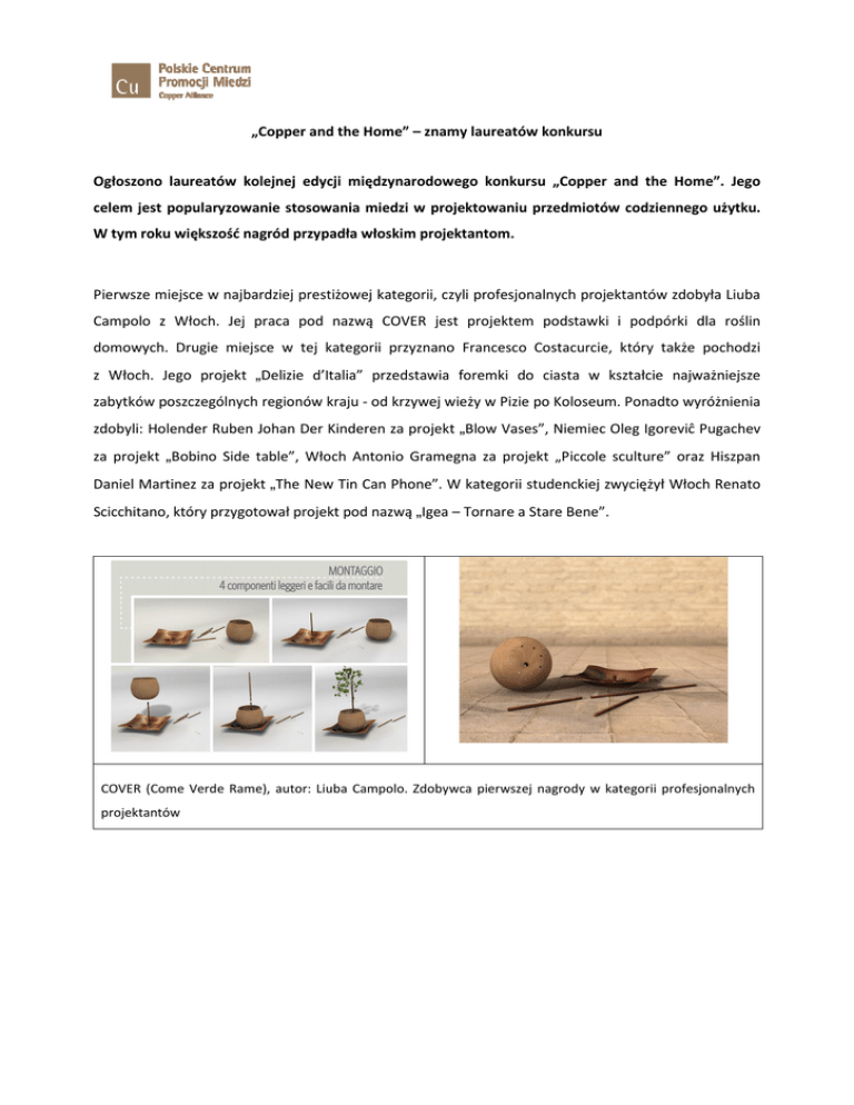 „Copper and the Home” – znamy laureatów konkursu Ogłoszono laureatów kolejnej edycji międzynarodowego konkursu „Copper and the Home”. Jego celem jest popularyzowanie stosowania miedzi w projektowaniu przedmiotów codziennego użytku. W tym roku większość nagród przypadła włoskim projektantom. Pierwsze miejsce w najbardziej prestiżowej kategorii, czyli profesjonalnych projektantów zdobyła Liuba Campolo z Włoch. Jej praca pod nazwą COVER jest projektem podstawki i podpórki dla roślin domowych. Drugie miejsce w tej kategorii przyznano Francesco Costacurcie, który także pochodzi z Włoch. Jego projekt „Delizie d’Italia” przedstawia foremki do ciasta w kształcie najważniejsze zabytków poszczególnych regionów kraju - od krzywej wieży w Pizie po Koloseum. Ponadto wyróżnienia zdobyli: Holender Ruben Johan Der Kinderen za projekt „Blow Vases”, Niemiec Oleg Igoreviĉ Pugachev za projekt „Bobino Side table”, Włoch Antonio Gramegna za projekt „Piccole sculture” oraz Hiszpan Daniel Martinez za projekt „The New Tin Can Phone”. W kategorii studenckiej zwyciężył Włoch Renato Scicchitano, który przygotował projekt pod nazwą „Igea – Tornare a Stare Bene”. COVER (Come Verde Rame), autor: Liuba Campolo. Zdobywca pierwszej nagrody w kategorii profesjonalnych projektantów Delizie d’Italia, autor: Francesco Costacurta. Zdobywca drugiej nagrody w kategorii profesjonalnych projektantów. Nie tylko z Europy Konkurs „Copper and the Home” jest skierowany do młodych projektantów oraz studentów wzornictwa. W tym roku nadesłano ponad 200 prac; nie tylko z Europy, lecz także z Chile, Indii i Meksyku. Uczestnicy mieli za zadanie zaprojektować przedmioty domowego użytku, ale nadesłano też projekty specjalistycznych instrumentów do rehabilitacji chorych cierpiących na zaburzenia psychomotoryczne. Wybór miedzi jest nieprzypadkowy. Miedź daje szerokie możliwości zastosowania w projektowaniu przedmiotów domowych (np. oprawy oświetleniowe, wazy, lustra, elementy wystroju wnętrz, posadzki czy grzejniki). Jest także materiałem przeciwdrobnoustrojowym, co oznacza, iż eliminuje ze swojej powierzchni bakterie, wirusy i grzyby. Zwycięzców konkursu wybrało jury złożone z ekspertów w dziedzinie architektury i wzornictwa. W jego skład weszli: architekt Marco Ferreri, architekt i projektant Roberto Paoli, architekt i krytyk w dziedzinie wzornictwa Marco Romanelli. Zwycięzca w kategorii profesjonalnych projektantów otrzymał nagrodę wysokości 4 000 euro, zdobywca drugiego miejsca 2 500 euro. Wyróżniony w kategorii studenckiej wzbogacił się o 1 500 euro. Polski akcent z przeszłości - Konkurs „Copper and the Home” od lat cieszy się ogromnym zainteresowaniem wśród polskich projektantów i studentów wzornictwa. W edycji organizowanej w 2012 roku doczekaliśmy się polskiego laureata w kategorii studenckiej. Była to praca „B-side” Michała Holcera, wtedy studenta Akademii Sztuk Pięknych w Krakowie – mówi Michał Ramczykowski z Polskiego Centrum Promocji Miedzi. B-side to kran wykonany z miedzi, który jednocześnie podaje mydło oraz wodę. Praca została wyróżniona za innowacyjne wykorzystanie miedzi w celu podwyższenia standardu higieny w toaletach w miejscach publicznych. Organizatorem „Copper and the Home” był Włoski Instytut Miedzi (Instituto Italiano del Rame). W Polsce oficjalnym partnerem wydarzenia jest Polskie Centrum Promocji Miedzi (PCPM). Informacje dodatkowe: Polskie Centrum Promocji Miedzi (PCPM) www.pcpm.pl działa w ramach światowej sieci Copper Alliance, której celem jest tworzenie warunków na rynku dla zwiększenia zastosowań produktów z miedzi i jej stopów w wielu dziedzinach gospodarki takich jak energetyka, telekomunikacja, budownictwo, architektura, ochrona środowiska i ochrona zdrowia. Realizowane przez PCPM projekty są koordynowane i współfinansowane przez International Copper Association (ICA) z siedzibą w Nowym Jorku. Działalność PCPM oparta jest na przekonaniu, iż miedź posiada wyjątkowe właściwości i parametry techniczne, których wykorzystanie pozwala na tworzenie rozwiązań wpływających na poprawę jakości życia. Osoby kontaktowe: Michał Ramczykowski [email protected] Wiktor Balcer [email protected]