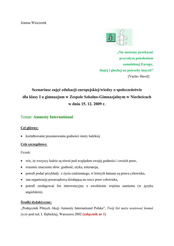 Joanna Wieczorek „Nie możemy przekazać przyszłym pokoleniom samolubnej Europy, ślepej i głuchej na potrzeby innych” [Vaclav Havel] Scenariusz zajęć edukacji europejskiej/wiedzy o społeczeństwie dla klasy I a gimnazjum w Zespole Szkolno-Gimnazjalnym w Niechcicach w dniu 15. 12. 2009 r. Temat: Amnesty International Cel główny: kształtowanie poszanowania godności istoty ludzkiej Cele szczegółowe: Uczeń: wie, że wszyscy ludzie są równi pod względem swojej godności i swoich praw, rozumie znaczenie słów: godność, etyka, tolerancja, potrafi podać przykłady z życia codziennego, w których łamane są prawa człowieka, zna organizację pozarządową działającą na rzecz praw człowieka, potrafi zredagować list interwencyjny o uwolnienie więźnia sumienia (w języku angielskim). Środki dydaktyczne: ,,Podręcznik Pilnych Akcji Amnesty International Polska”, Twój list może uratować komuś życie pod red. I. Dębickiej, Warszawa 2002 (załącznik nr 1) Tekst źródłowy: „Pilna Akcja Ukraina” w sprawie uwolnienia więźnia sumienia Igora Koktysza (zasoby internetowe: http://amnesty.org.pl/) (załącznik nr 2) Utwory muzyczne: Marek Grechuta Wolność, „Chłopcy z Placu Broni” Kocham wolność. Plansze przedstawiające: Generacje Praw Człowieka, Prawa Dziecka, Prawa Ucznia, Mechanizmy Obrony Praw Człowieka (załącznik nr 3) Krzyżówka Prawa Człowieka [Zasoby internetowe] Metody: burza mózgów, praca w grupie, elementy dyskusji. Realizacja: 1. Czynności porządkowo-organizacyjne. 2. Rekapitulacja wtórna. 3. Wprowadzeniem do zajęć jest motto Vaclava Havla: „Nie możemy przekazać przyszłym pokoleniom samolubnej Europy, ślepej i głuchej na potrzeby innych”. a) Podanie tematu i celów lekcji. 4. Wysłuchanie piosenki „Wolność” Marka Grechuty. 5. Krótka historia praw człowieka, przypomnienie generacji praw człowieka i mechanizmów ich obrony. 6. Pytania do uczniów: Gdzie na świecie najczęściej naruszane są prawa człowieka? Jaka jest rola organizacji międzynarodowych w ochronie praw człowieka? Co oznaczają, czym są i jak rozumiecie słowa „godność”, ,,tolerancja” ? Z jakimi słowami w sensie pozytywnym kojarzy się wam słowo godność lub brak godności (nauczyciel podaje dodatkowe pytania naprowadzające) np.: Co to znaczy żyć życiem godnym człowieka? Aby żyć godnie trzeba być? Co czuje ofiara, którą bezprawnie pozbawiono godności poprzez znieważenie, czy przemoc fizyczną? Co czuje sprawca przemocy pozbawiony godności w stosunku do ofiary? Czym jest tolerancja? Jakie przymioty ma człowiek tolerancyjny? Kiedy przypada Międzynarodowy Dzień Tolerancji? Co czuje człowiek, który jest dyskryminowany z racji innej narodowości, wyznawanej religii, koloru skóry? 7. Polecenie dla uczniów: Dokończcie zdanie: „Kiedy słyszę wyrażenie prawa człowieka to przychodzi mi na myśl…” Rozwiążcie krzyżówkę.(załącznik nr 4) 8. Praca w grupie Grupa I Zaprezentujcie krótko historię instytucji jaką jest Amnesty International. Grupa II Ułóżcie dekalog człowieka szczęśliwego, zapiszcie go w formie tęczy. Zastanówcie się, czego symbolem jest tęcza. Grupa III Wypiszcie dzieła literackie, filmy, w których występuje temat praw i godności człowieka (np.: „Chata wuja Toma” [Harriet Beecher Stowe], „Olivier Twist” [Karola Dickensa]. Wypowiedź możecie uzupełnić o inne przykłady. Ćwiczenie dla wszystkich grup Nauczyciel języka angielskiego [Pani Edyta Pawłowska] 9. Z przygotowanych materiałów o represjonowanych więźniach politycznych na świecie zredagujcie list interwencyjny w języku angielskim o uwolnienie więźnia. (załącznik nr 5) 10. Podsumowanie i wnioski Każdy człowiek posiada niezbywalną godność, z której wynikają z jego prawa i wolności. "Wszyscy ludzie rodzą się wolni i równi w swej godności i w swych prawach. Są oni obdarzeni rozumem i sumieniem i powinni postępować wobec innych w duchu braterstwa" (Art. 1 Powszechnej Deklaracji Praw Człowieka). Prawa człowieka dotyczą relacji jednostka - władza i obywatel - państwo a nie stosunków miedzy ludźmi. Naruszanie praw człowieka dotyczy ich łamania lub niewykonywania przez organy i przedstawicieli państwa. Promocja tolerancji i poszanowania ma istotne znaczenie w tworzeniu atmosfery sprzyjającej akceptowaniu różnorodności kulturowej. „Pomimo powtarzających się oświadczeń ze strony społeczności międzynarodowej o promowaniu tolerancji i szacunku, wciąż stoją przed nami z wdrożeniem technologii teorii w praktykę. Rozwój poważne wyzwania i komunikacji związane połączony z globalizacją gospodarek, zwiększył integrację i współzależność między cywilizacjami. Rozwój ten w większości wpłynął bardzo korzystnie na sytuację społeczeństw. W niektórych jednak przypadkach stał się przyczyną pogłębienia istniejących nierówności i powstania nowych form rasizmu i nietolerancji”. 11. Wysłuchanie piosenki „Wolność” w wykonaniu zespołu „Chłopcy z Placu Broni”. Temat pracy domowej: Inny nie znaczy gorszy. Do jakich refleksji i wniosków skłoniło Cię wskazane sformułowanie? Wypowiedź uzasadnij. Zasoby internetowe: http://www.unic.un.org.pl/dyskryminacja/tolerancja-poszanowanie.php Uwagi o realizacji: Temat można zrealizować na dwóch jednostkach lekcyjnych. Lekcja zintegrowana z językiem angielskim. RAZEM MOŻEMY ZMIENIĆ RZECZYWISTOŚĆ 12-13 XII 2009 ROKU ODBĘDZIE SIĘ KOLEJNY MARATON PISANIA LISTÓW AMNESTY INTERNATIONAL. PISZEMY, ABY PRZECIWSTAWIĆ SIĘ, NIESPRAWIEDLIWOŚCI I ABY POWSTRZYMAĆ REPRESJE