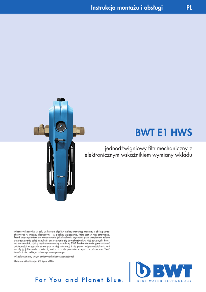 Instrukcja montażu i obsługi PL BWT E1 HWS jednodźwigniowy filtr mechaniczny z elektronicznym wskaźnikiem wymiany wkładu Ważne wskazówki: w celu uniknięcia błędów, należy instrukcję montażu i obsługi przechowywać w miejscu dostępnym – w pobliżu urządzenia, które jest w niej omawiane. Przed przystąpieniem do wykonywania jakichkolwiek czynności przy urządzeniu zaleca się przeczytanie całej instrukcji i zastosowanie się do wskazówek w niej zawartych. Pomimo staranności, z jaką napisano niniejszą instrukcję, BWT Polska nie może gwarantować dokładności wszystkich zawartych w niej informacji i nie ponosi odpowiedzialności ani za błędy, jakie może zawierać, ani za szkody powstałe w wyniku użytkowania. Treść instrukcji nie podlega zobowiązaniom prawnym. Wszelkie zmiany w tym zmiany techniczne zastrzeżone! Ostatnia aktualizacja: 22 lipca 2015 PL Dziękujemy za okazane zaufanie i zakup naszego urządzenia. 2 PL Spis treści strona 3 PL Spis treści 1. Zakres dostawy.................................................................................................................................. 5 2. Zastosowanie..................................................................................................................................... 5 2.1 Filtracja................................................................................................................................ 5 2.2 Reduktor ciśnienia................................................................................................................. 5 3. Działanie............................................................................................................................................ 5 3.1 Filtr...................................................................................................................................... 5 3.2 Reduktor ciśnienia +zawór zwrotny......................................................................................... 5 4. Zasady montażu................................................................................................................................. 6 5. Montaż............................................................................................................................................... 6 5.1 Montaż filtra......................................................................................................................... 6 5.2 Montaż uchwytu ściennego.................................................................................................... 6 6. Rozruch.............................................................................................................................................. 6 6.1 Ustawianie reduktora ciśnienia .............................................................................................. 6 6.2 Wskaźnik LED wymiany wkładu filtracyjnego........................................................................... 6 7. Eksploatacja....................................................................................................................................... 7 7.1 Wymiana wkładu ................................................................................................................ 7 7.2 Wymiana baterii we wskaźniku LED....................................................................................... 8 8. Obowiązku użytkownika.................................................................................................................... 8 9. Gwarancja.......................................................................................................................................... 8 10. Usuwanie usterek.............................................................................................................................. 9 11. Konserwacja..................................................................................................................................... 9 11.1 Wymiana części eksploatacyjnych........................................................................................ 9 11.2 Wymiana wkładu reduktora ciśnienia................................................................................... 9 12. Dane techniczne.............................................................................................................................. 10 3 PL Rys.1 BWT E1 HWS Rys.2 BWT E1 HWS Rys.3 Wkład+klosz+obudowa Rys.4 Reduktor ciśnienia Rys. 5 BWT E1 HWS - wymiary 4 BWT E1 HWS - widok z tyłu PL 1. Zakres dostawy Filtr E1 HWS składa się z: 1 Dźwigni 2 Pokrywy 3 Śrub przyłączeniowych i uszczelek,z zaworem zwrotnym na wejściu (ze śrubą kontrolną lub możliwością podłączenia manometrów ciśnienia wstępnego) 4 Wkładu filtracyjnego (klosz +wkład)z obudową (rys.3) 5 Manometru ciśnieniowego 6 Zawór odcinający 7 Elektronicznego wskaźnika wymiany wkładu: lampa LED + 2 baterie AAA. Reduktor ciśnienia (Rys. 4) składa się z: 8 Osłony sprężyny 9 Wskaźnika ciśnienia (nastawionego) 10 Śruby blokującej 11 Pokrętła reduktora 12 Wkładu reduktora 13 O-ring Opcja, poza zakresem dostawy: n wkłady filtracyjne (op. 2 szt) nklosz na wkład filtracyjny z pokrywką zabezpieczającą 2. Zastosowanie 2.1. Filtracja Filtr BWT E1 HWS z jedną dźwignią umożliwiającą szybką wymianę wkładu, przeznaczony jest do filtrowania wody pitnej i użytkowej. Chroni rurociągi i podłączone do nich elementy instalacji mające kontakt z wodą przed uszkodzeniami i korozją wywołaną przez ciała obce np. cząsteczki rdzy, piasek itp.Filtr nie nadaje się do filtrowania uzdatnianej chemicznie wody obiegowej, procesowej, i chłodniczej przeznaczonej do permanentnego chłodzenia. Jeśli w wodzie znajdują się zanieczyszczenia zgrubne, należy zamontować separator. Filtry nie są przystosowane do olejów, tłuszczów, rozpuszczalników, mydeł i innych smarów. Nie są również przezn