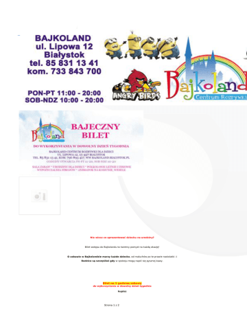 Nie wiesz co sprezentować dziecku na urodziny? Bilet wstępu do Bajkolandu to świetny pomysł na każdą okazję! O zabawie w Bajkolandzie marzy każde dziecko, od maluchów po te prawie nastolatki :) Rodzice są szczęśliwi gdy w spokoju mogą napić się pysznej kawy. Bilet na 1 godzinę zabawy do wykorzystania w dowolny dzień tygodnia kupisz Strona 1 z 2 klikając DO KOSZYKA a po opłaceniu zakupu przelewem bilet do wydrukowania otrzymasz drogą mailową lub odwiedzając Bajkoland, otrzymasz wówczas tradycyjny bilet. Bilet bez limitu kupisz TU. Strona 2 z 2