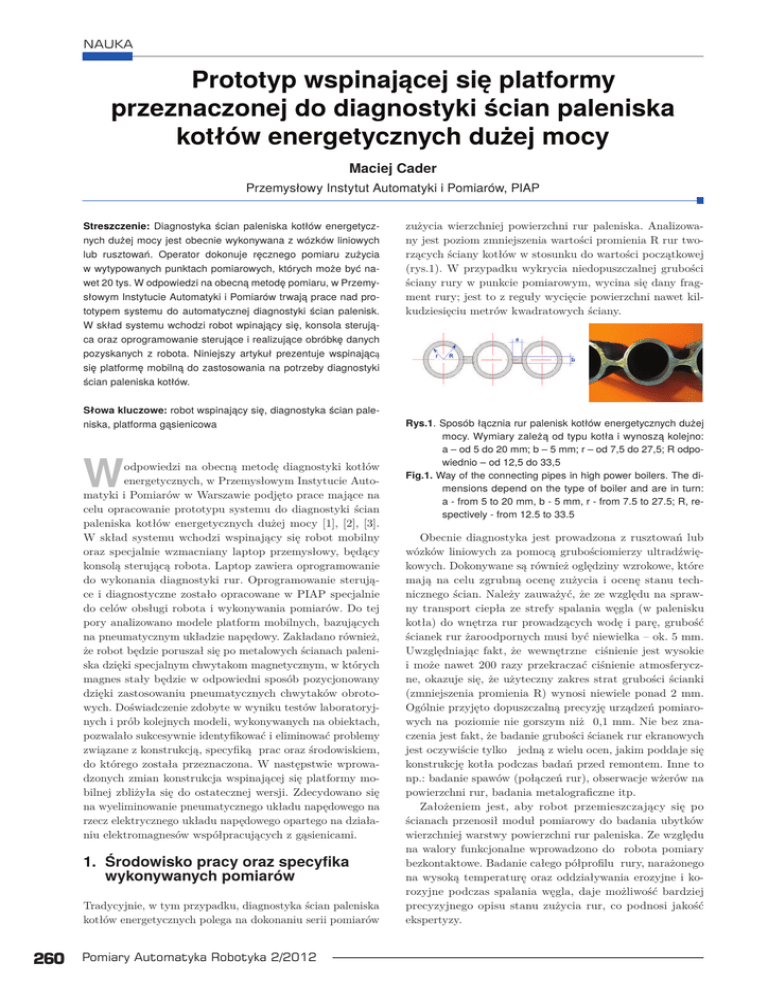 NAUKA Prototyp wspinającej się platformy przeznaczonej do diagnostyki ścian paleniska kotłów energetycznych dużej mocy Maciej Cader Przemysłowy Instytut Automatyki i Pomiarów, PIAP Streszczenie: Diagnostyka ścian paleniska kotłów energetycznych dużej mocy jest obecnie wykonywana z wózków liniowych lub rusztowań. Operator dokonuje ręcznego pomiaru zużycia w wytypowanych punktach pomiarowych, których może być nawet 20 tys. W odpowiedzi na obecną metodę pomiaru, w Przemysłowym Instytucie Automatyki i Pomiarów trwają prace nad prototypem systemu do automatycznej diagnostyki ścian palenisk. zużycia wierzchniej powierzchni rur paleniska. Analizowany jest poziom zmniejszenia wartości promienia R rur tworzących ściany kotłów w stosunku do wartości początkowej (rys.1). W przypadku wykrycia niedopuszczalnej grubości ściany rury w punkcie pomiarowym, wycina się dany fragment rury; jest to z reguły wycięcie powierzchni nawet kilkudziesięciu metrów kwadratowych ściany. W skład systemu wchodzi robot wpinający się, konsola sterująca oraz oprogramowanie sterujące i realizujące obróbkę danych pozyskanych z robota. Niniejszy artykuł prezentuje wspinającą się platformę mobilną do zastosowania na potrzeby diagnostyki ścian paleniska kotłów. Słowa kluczowe: robot wspinający się, diagnostyka ścian paleniska, platforma gąsienicowa W odpowiedzi na obecną metodę diagnostyki kotłów energetycznych, w Przemysłowym Instytucie Automatyki i Pomiarów w Warszawie podjęto prace mające na celu opracowanie prototypu systemu do diagnostyki ścian paleniska kotłów energetycznych dużej mocy [1], [2], [3]. W skład systemu wchodzi wspinający się robot mobilny oraz specjalnie wzmacniany laptop przemysłowy, będący konsolą sterującą robota. Laptop zawiera oprogramowanie do wykonania diagnostyki rur. Oprogramowanie sterujące i diagnostyczne zostało opracowane w PIAP specjalnie do celów obsługi robota i wykonywania pomiarów. Do tej pory analizowano modele platform mobilnych, bazujących na pneumatycznym układzie napędowy. Zakładano również, że robot będzie poruszał się po metalowych ścianach paleniska dzięki specjalnym chwytakom magnetycznym, w których magnes stały będzie w odpowiedni sposób pozycjonowany dzięki zastosowaniu pneumatycznych chwytaków obrotowych. Doświadczenie zdobyte w wyniku testów laboratoryjnych i prób kolejnych modeli, wykonywanych na obiektach, pozwalało sukcesywnie identyfikować i eliminować problemy związane z konstrukcją, specyfiką prac oraz środowiskiem, do którego została przeznaczona. W następstwie wprowadzonych zmian konstrukcja wspinającej się platformy mobilnej zbliżyła się do ostatecznej wersji. Zdecydowano się na wyeliminowanie pneumatycznego układu napędowego na rzecz elektrycznego układu napędowego opartego na działaniu elektromagnesów współpracujących z gąsienicami. 1. Środowisko pracy oraz specyfika wykonywanych pomiarów Tradycyjnie, w tym przypadku, diagnostyka ścian paleniska kotłów energetycznych polega na dokonaniu serii pomiarów 260 Pomiary Automatyka Robotyka 2/2012 Rys.1. Sposób łącznia rur palenisk kotłów energetycznych dużej mocy. Wymiary zależą od typu kotła i wynoszą kolejno: a – od 5 do 20 mm; b – 5 mm; r – od 7,5 do 27,5; R odpowiednio – od 12,5 do 33,5 Fig.1. Way of the connecting pipes in high power boilers. The dimensions depend on the type of boiler and are in turn: a - from 5 to 20 mm, b - 5 mm, r - from 7.5 to 27.5; R, respectively - from 12.5 to 33.5 Obecnie diagnostyka jest prowadzona z rusztowań lub wózków liniowych za pomocą grubościomierzy ultradźwiękowych. Dokonywane są również oględziny wzrokowe, które mają na celu zgrubną ocenę zużycia i ocenę stanu technicznego ścian. Należy zauważyć, że ze względu na sprawny transport ciepła ze strefy spalania węgla (w palenisku kotła) do wnętrza rur prowadzących wodę i parę, grubość ścianek rur żaroodpornych musi być niewielka – ok. 5 mm. Uwzględniając fakt, że wewnętrzne ciśnienie jest wysokie i może nawet 200 razy przekraczać ciśnienie atmosferyczne, okazuje się, że użyteczny zakres strat grubości ścianki (zmniejszenia promienia R) wynosi niewiele ponad 2 mm. Ogólnie przyjęto dopuszczalną precyzję urządzeń pomiarowych na poziomie nie gorszym niż 0,1 mm. Nie bez znaczenia jest fakt, że badanie grubości ścianek rur ekranowych jest oczywiście tylko jedną z wielu ocen, jakim poddaje się konstrukcję kotła podczas badań przed remontem. Inne to np.: badanie spawów (połączeń rur), obserwacje wżerów na powierzchni rur, badania metalograficzne itp. Założeniem jest, aby robot przemieszczający się po ścianach przenosił moduł pomiarowy do badania ubytków wierzchniej warstwy powierzchni rur paleniska. Ze względu na walory funkcjonalne wprowadzono do robota pomiary bezkontaktowe. Badanie całego półprofilu rury, narażonego na wysoką temperaturę oraz oddziaływania erozyjne i korozyjne podczas spalania węgla, daje możliwość bardziej precyzyjnego opisu stanu zużycia rur, co podnosi jakość ekspertyzy. NAUKA W trakcie prac nad prototypem systemu przetestowano różnego rodzaju czujniki – skanery laserowe, umożliwiające wykonanie diagnostyki w założony sposób. Głównym założeniem pomiaru jest analiza obrysu powierzchni rur i prognozowanie ich zużycia na bazie porównania z wprowadzonym obrysem wzorcowym. Pomiar jest dokonywany przez naświetlenie rury wiązką laserową (rys. 2), po czym wykonywane są operacje matematyczne obróbki profilu wyznaczonego przez wiązkę i porównanie z wzorcem. Ostatecznie do operatora trafia informacja o ubytku w grubości rury i kącie pomiaru tego ubytku (rys. 3). Operator, oglądając wyniki, sam może sterować kątem pomiaru ubytku, dzięki czemu możliwe jest pozyskanie informacji o zużyciu rury w każdym punkcie pomiaru. Rys.4. Przekrój poprzeczny przez
