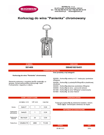 Korkociąg do wina "Panienka" chromowany SYMBOL KOD EAN 501409 5904816016451 CHARAKTERYSTYKA Inne produkty z tej kategorii: Korkociąg do wina "Panienka" chromowany Starannie wykonany z wysokiej jakości materiału, co sprawia, że jest jednocześnie wytrzymały i lekki. Funkcjonalny i wygodny w użyciu. 500209 - Korkociąg srebrny nr 2 – tradycyjny (podwójna dźwignia) 500308 - Korkociąg (z podwójną dźwignią) w plastikowej obudowie 500409 - Korkociąg platynowy (podwójna dźwignia) 500908 - Korkociąg do wina - pomocnik kelnera 501308 - Korkociąg do wina "Dźwignia" przezroczysty 501800 - Korkociąg do wina "Dama" DANE LOGISTYCZNE Sztuka PRZEZNACZENIE szer/gł/wys [cm] Ilość sztuk waga [kg] 6x4x17 1 0.24 Tradycyjny korkociąg do otwierania butelek z winem. Może służyć również jako otwieracz do kapsli. INFORMACJE DODATKOWE Opakowanie jednostkowe 9x4x23 1 0.24 Opakowanie zbiorcze 36x14x24 24 5.94 Paleta Euro 120x80x170 2880 712.80 PKWiU VAT 25.99.12.0 23%