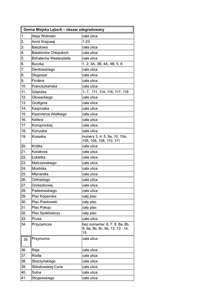 Gmina Miejska Lębork – obszar zdegradowany 1. Aleja Wolności cała ulica 2. Armii Krajowej 1-23 3. Basztowa cała ulica 4. Batalionów Chłopskich cała ulica 5. Bohaterów Westerplatte cała ulica 6. Buczka 1, 2, 3A, 3B, 4A, 4B, 5, 6 7. Derdowskiego cała ulica 8. Długosza cała ulica 9. Findera cała ulica 10. Franciszkańska cała ulica 11. Gdańska 1- 7, 111, 114, 116, 117, 118 12. Głowackiego cała ulica 13. Grottgera cała ulica 14. Kasprzaka cała ulica 15. Kazimierza Wielkiego cała ulica 16. Kellera cała ulica 17. Konopnickiej cała ulica 18. Korczaka cała ulica 19. Kossaka numery 3, 4, 5, 9a, 10, 10a, 105, 106, 108, 110, 111 20. Krótka cała ulica 21. Kwiatowa cała ulica 22. Łokietka cała ulica 23. Malczewskiego cała ulica 24. Mostnika cała ulica 25. Młynarska cała ulica 26. Orlińskiego cała ulica 27. Orzeszkowej cała ulica 28. Paderewskiego cała ulica 29. Plac Kopernika cały plac 30. Plac Piastowski cały plac 31. Plac Pokoju cały plac 32. Plac Spółdzielczy cały plac 33. Prusa cała ulica 34. Przyzamcze bez numerów: 6, 7, 8, 8a, 8b, 9, 9a, 9b, 9c, 9d, 12, 13 , 14, 15 Przymurna cała ulica 36. Reja cała ulica 37. Rodła cała ulica 38. Skarżyńskiego cała ulica 39. Skłodowskiej-Curie cała ulica 40. Solna cała ulica 41. Stryjewskiego cała ulica 35 . 42. Staromiejska cała ulica 43. Waryńskiego cała ulica 44. Wyszyńskiego cała ulica